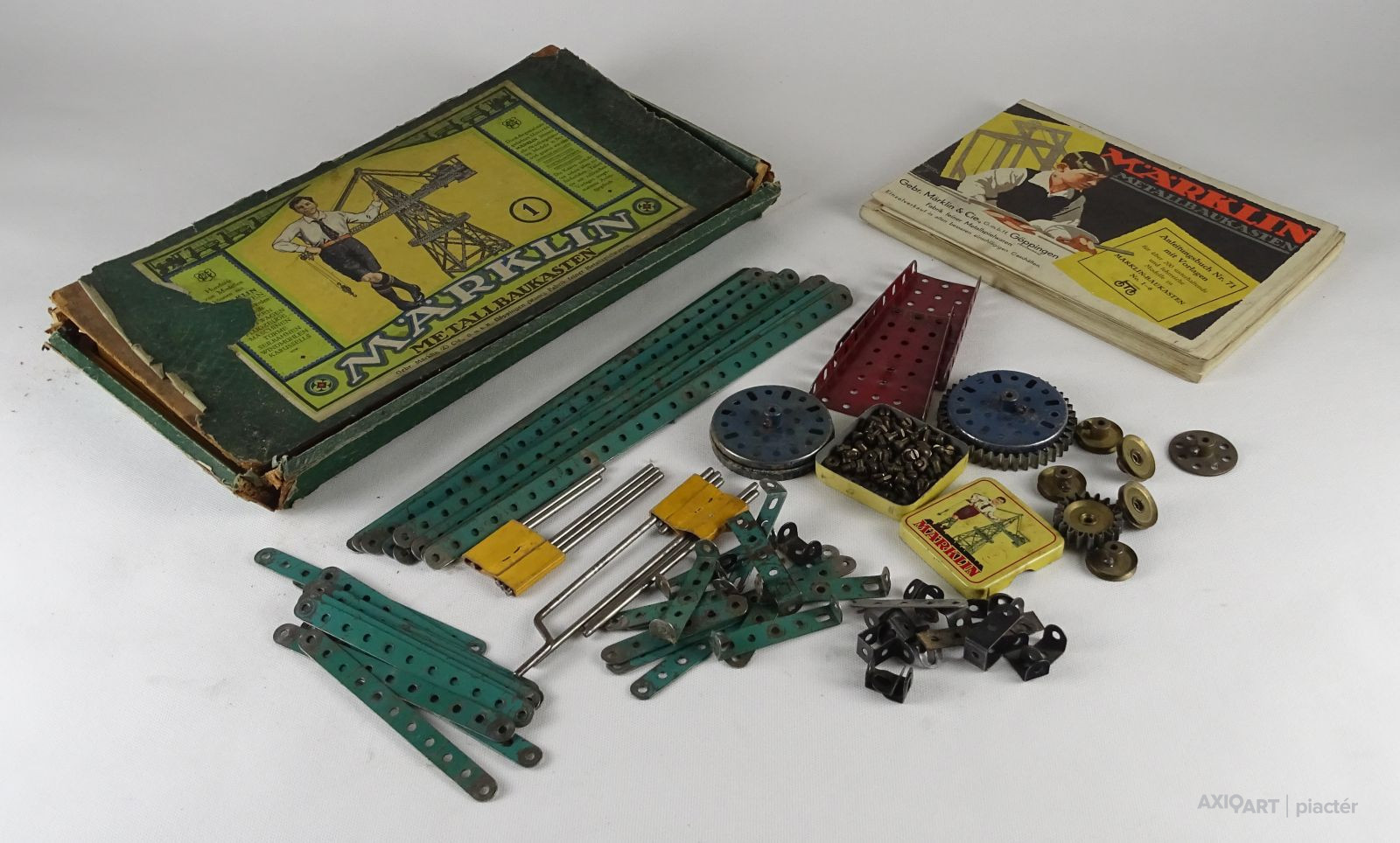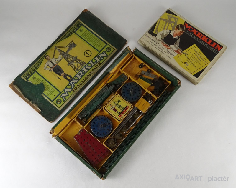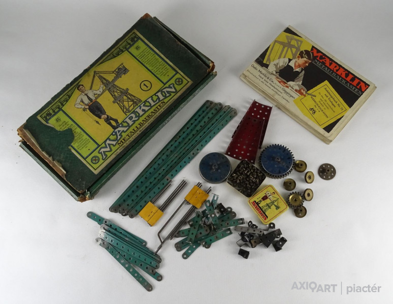 Nagyon ritkán előforduló gyűjtők figyelmébe ajánlott antik MARKLIN fémépítő játék szett, kreatív készségfejlesztő fém játék, dobozában, az 1920-as évekből. A dobozban MARKLIN feliratos pici fém doboz, pléh doboz és eredeti MARKLIN használati utasítás is található.