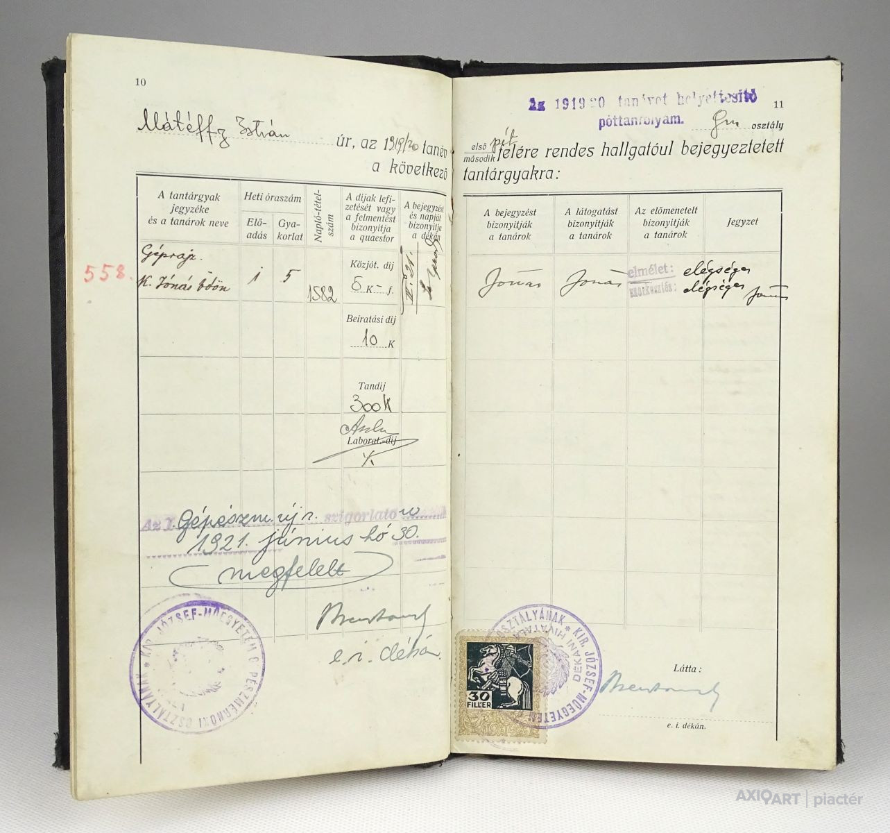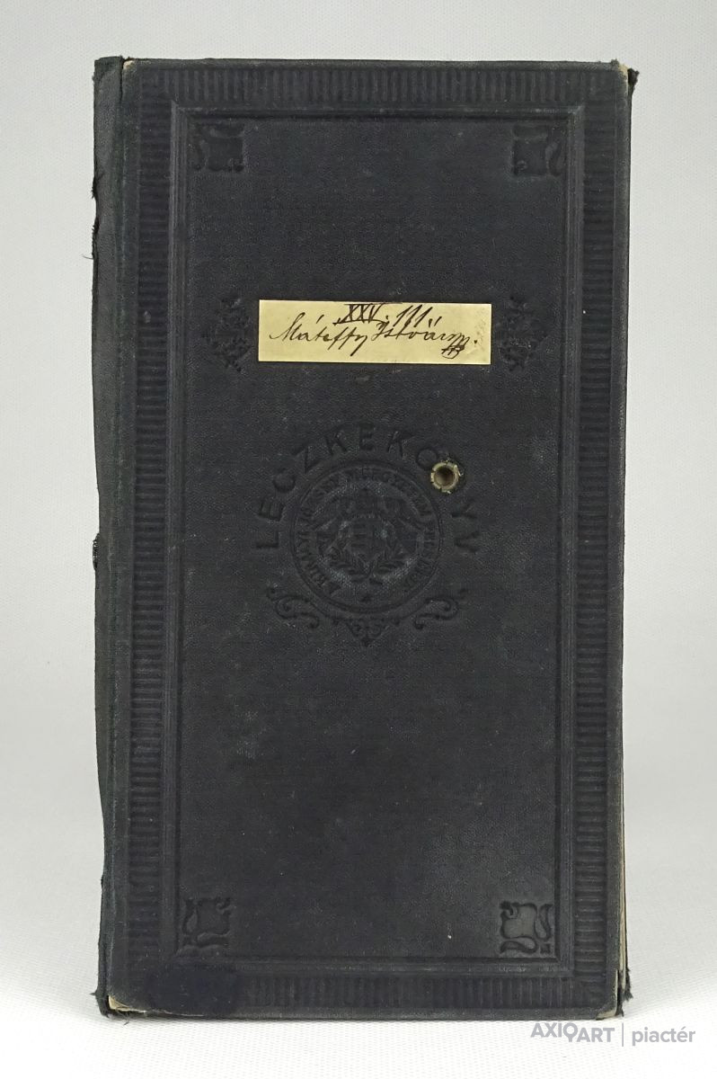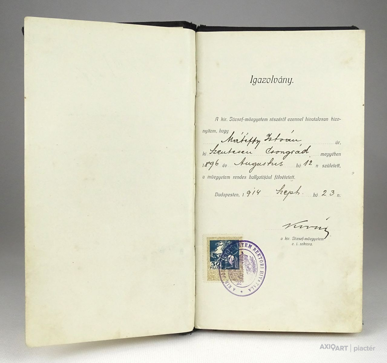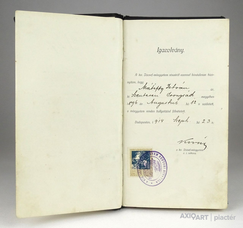 [1J816/X319] Szép állapotú, papír régiség. Benne több illetékbélyeg található, lásd fotó. 1896-ban Szentesen született fiú gépészmérnöki szak hallgatói leckekönyve 1914-1923-ig. Édesapja DR. MÁTÉFFY FERENC (Szentes polgármestere) Borítón gyönyörű száraz nyomott koronás pecsét, címer. Felirat: LECZKEKÖNYV A KIRÁLYI JÓZSEF MŰEGYETEM PECSÉTJE Magasság: 22.5 cm Szélesség: 12.5 cm Súly: 0.16 kg Városépítő polgármester Százötven éve született dr. Mátéffy Ferenc (I.) 2006. november 24. "Keveseknek adatik meg a szerencse, hogy polgártársai fejükül választják és magas hivatalukat köznépszerűségben töltsék be - mondja a római klasszikus -, mert mindannyian emberek vagyunk, és a bölcső és koporsó közötti arasznyi lét a küzdelmek ideje, s a közszereplő embert küzdelmei szinte minden esetben érdekek összeütközésének középpontjába állítja. S mégis, bár éppen a legutóbbi éveknek voltak súlyos küzdelmei idehaza, dr. Mátéffy Ferenc azok közé a kevesek közé tartozik, akik köznépszerűségben töltik be magas hivatalukat. Amikor jött, elfajult közéleti küzdelmek színtere volt Szentes. Ő a közjó és a közbékesség jelszavával foglalta el hivatalát, s vissza tudta állítani az anynyira óhajtott közbékességet, s polgármesteri működése során a legkényesebb helyzetekben is át tudta vezetni közügyeink hajóját a béke csöndes vizeire. Az a tizenöt év, amióta dr. Mátéffy Ferenc ül Szentes város polgármesteri székében, a város történetének külön fejezete, amelyet joggal nevezhetünk az alkotások és a városias fejlődés korának...". A Szentesi Lap 1917. október 14-én megjelent számában ezekkel a mondatokkal méltatta Mátéffy polgármester addigi működését. A kortársi értékelés nem túloz, hisz az utólagos megítélés szerint is Mátéffy Ferenc polgármesterségének időszaka a megvalósult közalkotások tekintetében párját ritkítja Szentes történetében. Születésének 150 éves évfordulója alkalmat ad arra, hogy felidézzük életútját, és számba vegyük a működése idején létesült, városunk arculatát maradandóan meghatározó alkotásokat. Szentesen született 1856. november 19-én; apja Má-téffy Ferenc tímármester, földbirtokos, városi és megyei képviselő, édesanyja Batik Lídia. Elemi iskoláit és a gimnázium alsó négy osztályát szülővárosában végezte, Szarvason érettségizett. Tanulmányait a debreceni jogakadémián folytatta; köz- és váltóügyvédi diplomáját, valamint a jogi doktorátust a budapesti egyetemen szerezte. Rövid ideig a budapesti ítélőtáblán volt joggyakornok, majd hazatérve beállt Reiniger Jakab ügyvédi irodájába, akit Szegedre is követett. 1884 májusában végleg hazatelepült Szentesre, s önálló ügyvédi irodát nyitott. 1886 végén eljegyezte, 1887. szeptember 10-én pedig feleségül vette Nagy Ferenc kereskedő Ilona nevű lányát, akit a város legszebb hajadonjai között tartottak számon. Negyven évi boldog házasságuk alatt hat gyermekük született. A tehetséges fiatal ügyvéd hamarosan be- kapcsolódott a városi közéletbe. 1889-től 1902-ig nyomdatulajdonosként kiadója és felelős szerkesztője, majd főszerkesztője a város egyik legolvasottabb lapjának a Szentes és Vidékének. 1890-től városi és megyei képviselő, 1892-től tiszteletbeli vármegyei tiszti főügyész, 1895-től Csongrád Vármegye Közigazgatási Bizottságának tisztiügyésze. Ezekben az években még nem örvend különösebb népszerűségnek, mivel a 48-as ellenzékiségű Szentesen a kormánytámogató megyei politika odaadó hívének számított. A századforduló idején távol tartotta magát az elmérgesedett helyi közéleti csatározásoktól, ennek köszönhette, hogy az 1902. évi általános tisztújításkor a kormánypárt és az ellenzék egyaránt az ő polgár-mesterré választását támogatta. A viharos tisztújításon - amelyet Hódy Antal Tulakurcza ostroma címen szatirikus költeményben örökített meg - Mátéffy elsöprő győzelmet aratott. Dr. Mátéffy Ferenc megválasztásával a régen óhajtott közéleti békesség végre helyreállt. A pártok meddő csatározását, a gyűlölködő személyi küzdelmeket felváltotta a város érdekeit szolgáló, fejlődését hatékonyan előmozdító komoly munka. A közalkotások egész sora bizonyítja ezt. Működésének kezdetén elkészült a városi villanytelep és a vármegyei kórház új főépülete (1902); átadták a forgalomnak a Szentes-Csongrád közötti tiszai vashidat, megszervezték a külterületi postaszolgálatot, megkezdődött a felsőpárti munkáslakások építése (1903); felépült a Katolikus Kör Szent Anna utcai épülete (1904) és az új evangélikus templom (1905). 1906 folyamán megnyílt az Orosháza-Szentes és a Szentes-Csongrád közötti vasútvonal, megindult a motorvonat közlekedés, megkezdődött a belső terek és az országutak fásítása, az ártézi kutak tömeges fúratása; felavatták a Református Kör díszes székházát és az új izraelita iskolát; határozat született az utcák és terek elnevezéséről, valamint a házak újraszámozásáról. (Folytatjuk) Labádi Lajos  Forrás: https://www.szentesinfo.hu/szentesielet/2006/47_1124/04.htm