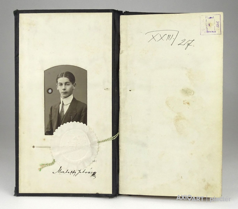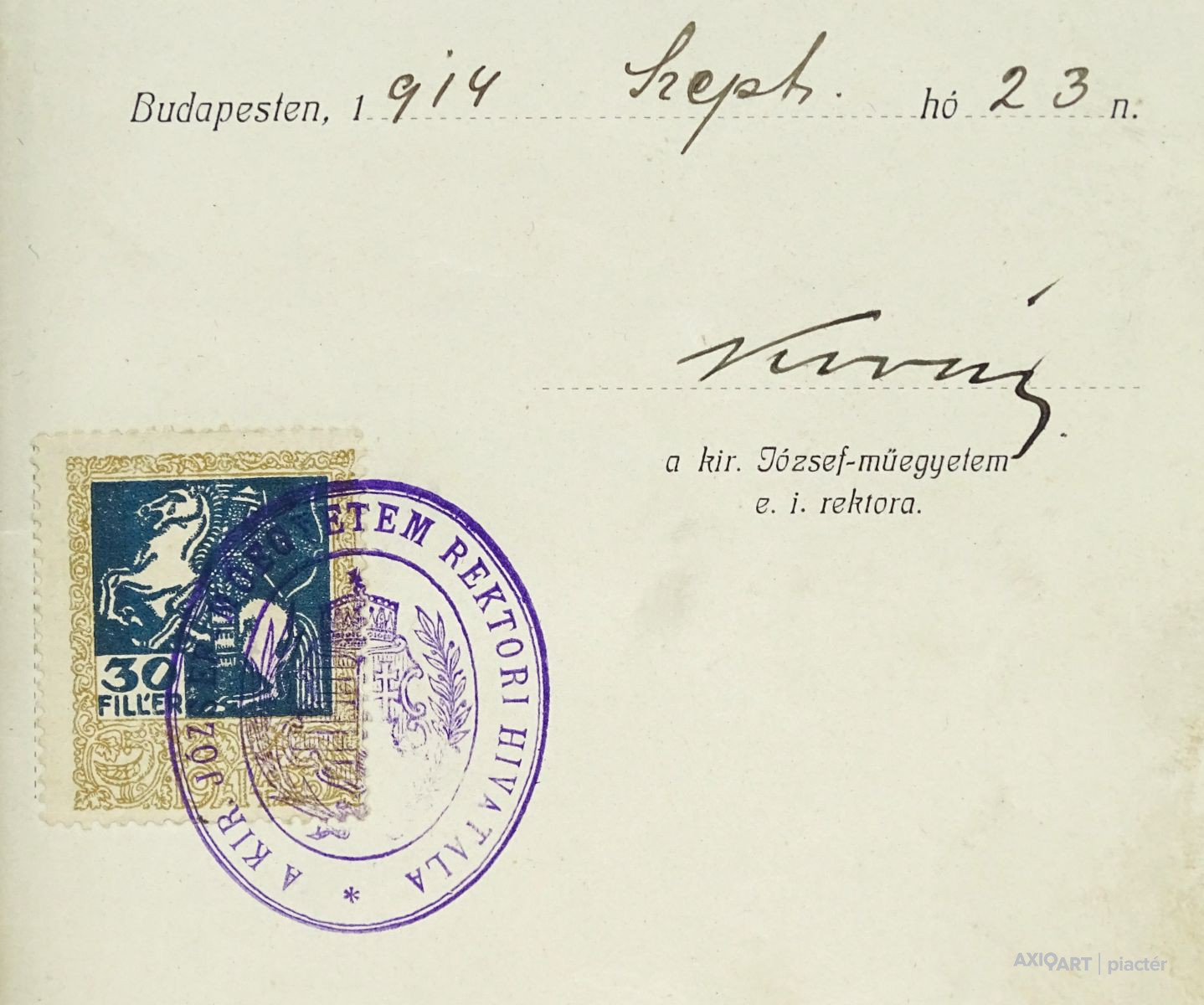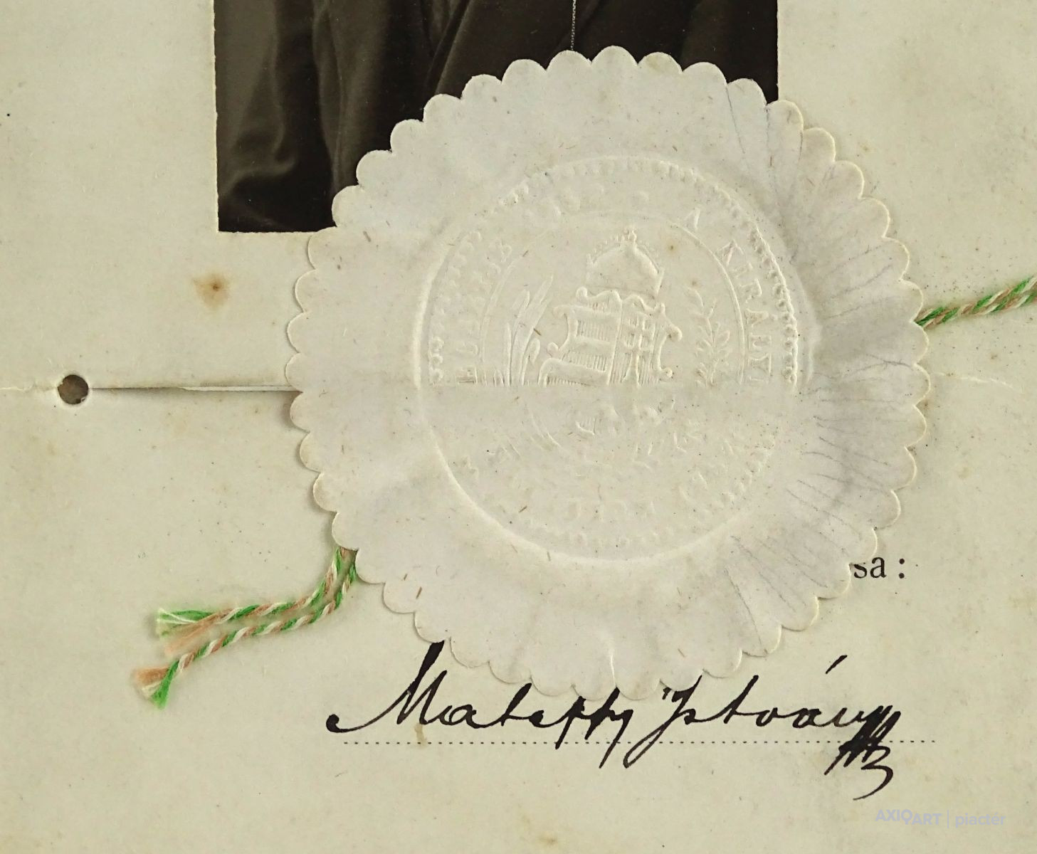 [1J816/X319] Szép állapotú, papír régiség. Benne több illetékbélyeg található, lásd fotó. 1896-ban Szentesen született fiú gépészmérnöki szak hallgatói leckekönyve 1914-1923-ig. Édesapja DR. MÁTÉFFY FERENC (Szentes polgármestere) Borítón gyönyörű száraz nyomott koronás pecsét, címer. Felirat: LECZKEKÖNYV A KIRÁLYI JÓZSEF MŰEGYETEM PECSÉTJE Magasság: 22.5 cm Szélesség: 12.5 cm Súly: 0.16 kg Városépítő polgármester Százötven éve született dr. Mátéffy Ferenc (I.) 2006. november 24. "Keveseknek adatik meg a szerencse, hogy polgártársai fejükül választják és magas hivatalukat köznépszerűségben töltsék be - mondja a római klasszikus -, mert mindannyian emberek vagyunk, és a bölcső és koporsó közötti arasznyi lét a küzdelmek ideje, s a közszereplő embert küzdelmei szinte minden esetben érdekek összeütközésének középpontjába állítja. S mégis, bár éppen a legutóbbi éveknek voltak súlyos küzdelmei idehaza, dr. Mátéffy Ferenc azok közé a kevesek közé tartozik, akik köznépszerűségben töltik be magas hivatalukat. Amikor jött, elfajult közéleti küzdelmek színtere volt Szentes. Ő a közjó és a közbékesség jelszavával foglalta el hivatalát, s vissza tudta állítani az anynyira óhajtott közbékességet, s polgármesteri működése során a legkényesebb helyzetekben is át tudta vezetni közügyeink hajóját a béke csöndes vizeire. Az a tizenöt év, amióta dr. Mátéffy Ferenc ül Szentes város polgármesteri székében, a város történetének külön fejezete, amelyet joggal nevezhetünk az alkotások és a városias fejlődés korának...". A Szentesi Lap 1917. október 14-én megjelent számában ezekkel a mondatokkal méltatta Mátéffy polgármester addigi működését. A kortársi értékelés nem túloz, hisz az utólagos megítélés szerint is Mátéffy Ferenc polgármesterségének időszaka a megvalósult közalkotások tekintetében párját ritkítja Szentes történetében. Születésének 150 éves évfordulója alkalmat ad arra, hogy felidézzük életútját, és számba vegyük a működése idején létesült, városunk arculatát maradandóan meghatározó alkotásokat. Szentesen született 1856. november 19-én; apja Má-téffy Ferenc tímármester, földbirtokos, városi és megyei képviselő, édesanyja Batik Lídia. Elemi iskoláit és a gimnázium alsó négy osztályát szülővárosában végezte, Szarvason érettségizett. Tanulmányait a debreceni jogakadémián folytatta; köz- és váltóügyvédi diplomáját, valamint a jogi doktorátust a budapesti egyetemen szerezte. Rövid ideig a budapesti ítélőtáblán volt joggyakornok, majd hazatérve beállt Reiniger Jakab ügyvédi irodájába, akit Szegedre is követett. 1884 májusában végleg hazatelepült Szentesre, s önálló ügyvédi irodát nyitott. 1886 végén eljegyezte, 1887. szeptember 10-én pedig feleségül vette Nagy Ferenc kereskedő Ilona nevű lányát, akit a város legszebb hajadonjai között tartottak számon. Negyven évi boldog házasságuk alatt hat gyermekük született. A tehetséges fiatal ügyvéd hamarosan be- kapcsolódott a városi közéletbe. 1889-től 1902-ig nyomdatulajdonosként kiadója és felelős szerkesztője, majd főszerkesztője a város egyik legolvasottabb lapjának a Szentes és Vidékének. 1890-től városi és megyei képviselő, 1892-től tiszteletbeli vármegyei tiszti főügyész, 1895-től Csongrád Vármegye Közigazgatási Bizottságának tisztiügyésze. Ezekben az években még nem örvend különösebb népszerűségnek, mivel a 48-as ellenzékiségű Szentesen a kormánytámogató megyei politika odaadó hívének számított. A századforduló idején távol tartotta magát az elmérgesedett helyi közéleti csatározásoktól, ennek köszönhette, hogy az 1902. évi általános tisztújításkor a kormánypárt és az ellenzék egyaránt az ő polgár-mesterré választását támogatta. A viharos tisztújításon - amelyet Hódy Antal Tulakurcza ostroma címen szatirikus költeményben örökített meg - Mátéffy elsöprő győzelmet aratott. Dr. Mátéffy Ferenc megválasztásával a régen óhajtott közéleti békesség végre helyreállt. A pártok meddő csatározását, a gyűlölködő személyi küzdelmeket felváltotta a város érdekeit szolgáló, fejlődését hatékonyan előmozdító komoly munka. A közalkotások egész sora bizonyítja ezt. Működésének kezdetén elkészült a városi villanytelep és a vármegyei kórház új főépülete (1902); átadták a forgalomnak a Szentes-Csongrád közötti tiszai vashidat, megszervezték a külterületi postaszolgálatot, megkezdődött a felsőpárti munkáslakások építése (1903); felépült a Katolikus Kör Szent Anna utcai épülete (1904) és az új evangélikus templom (1905). 1906 folyamán megnyílt az Orosháza-Szentes és a Szentes-Csongrád közötti vasútvonal, megindult a motorvonat közlekedés, megkezdődött a belső terek és az országutak fásítása, az ártézi kutak tömeges fúratása; felavatták a Református Kör díszes székházát és az új izraelita iskolát; határozat született az utcák és terek elnevezéséről, valamint a házak újraszámozásáról. (Folytatjuk) Labádi Lajos  Forrás: https://www.szentesinfo.hu/szentesielet/2006/47_1124/04.htm
