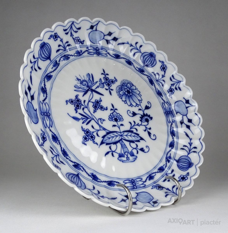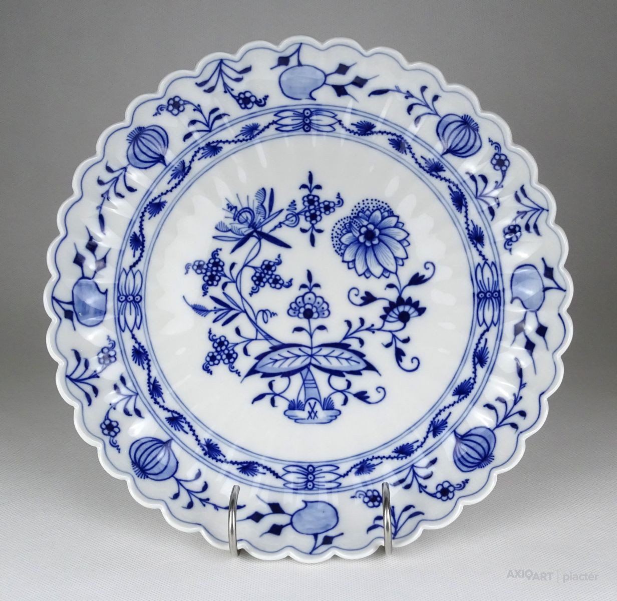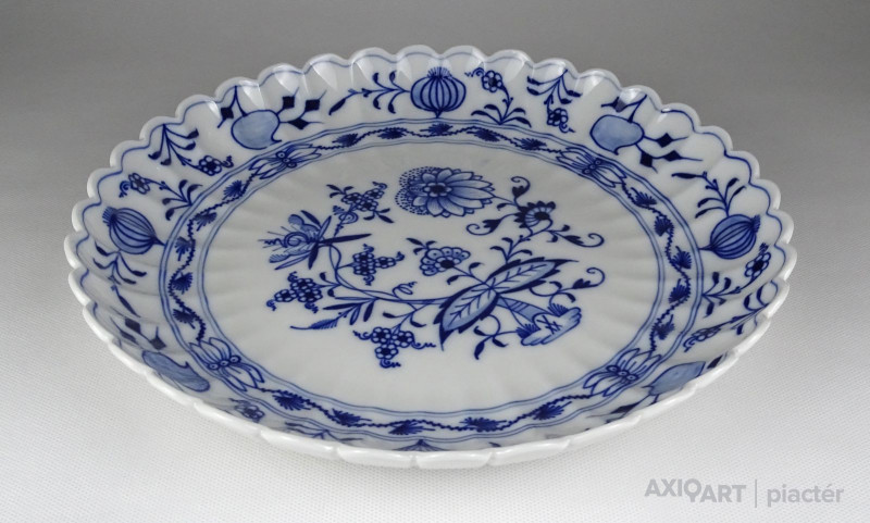 [0V054/X334] Kék-fehér hagymamintás, hibátlan állapotú, antik Meisseni porcelán süteményes kínáló tál, asztalközép kínáló tál, tortatál. Alján kék kardos Meisseni jelzés, lásd fotó. Szélesség: 28 cm Súly: 0.755 kg