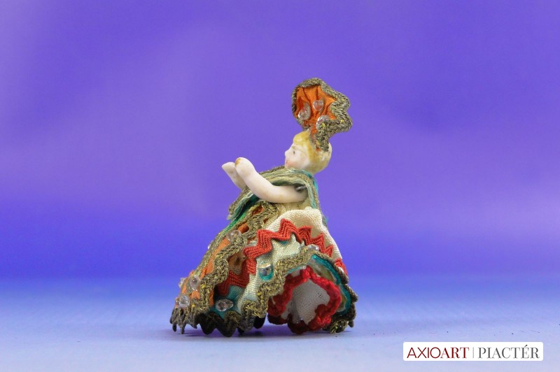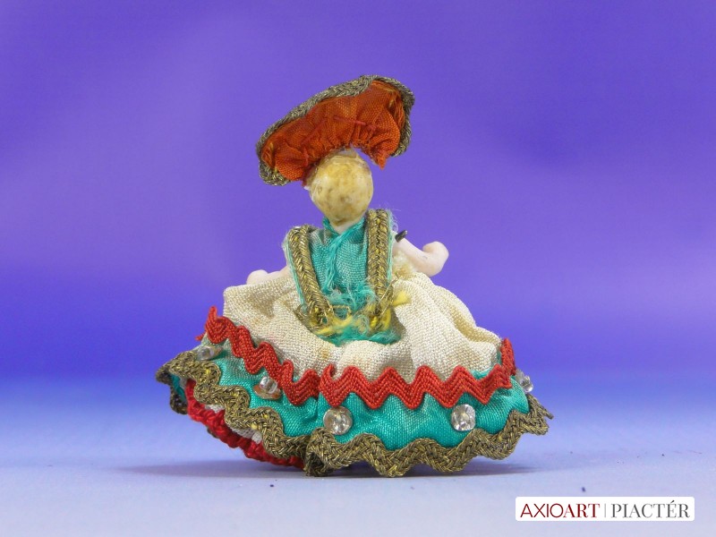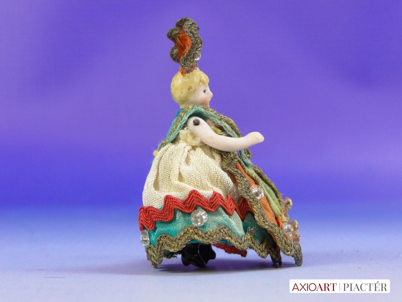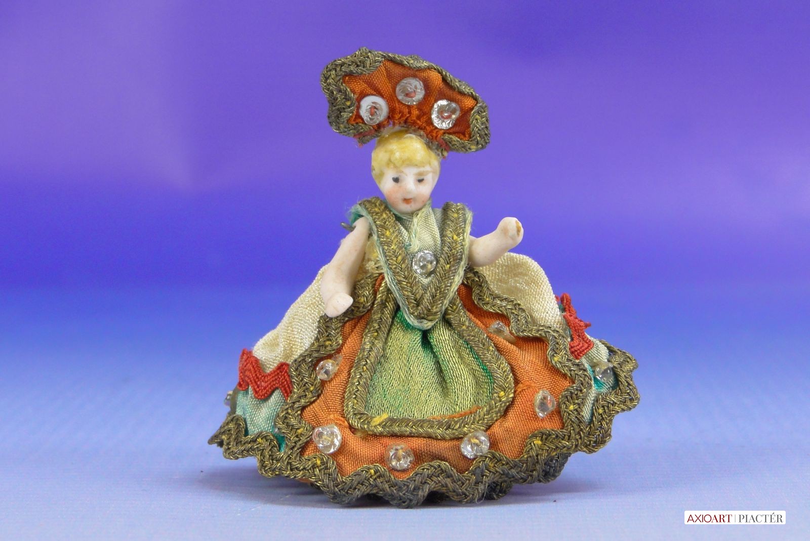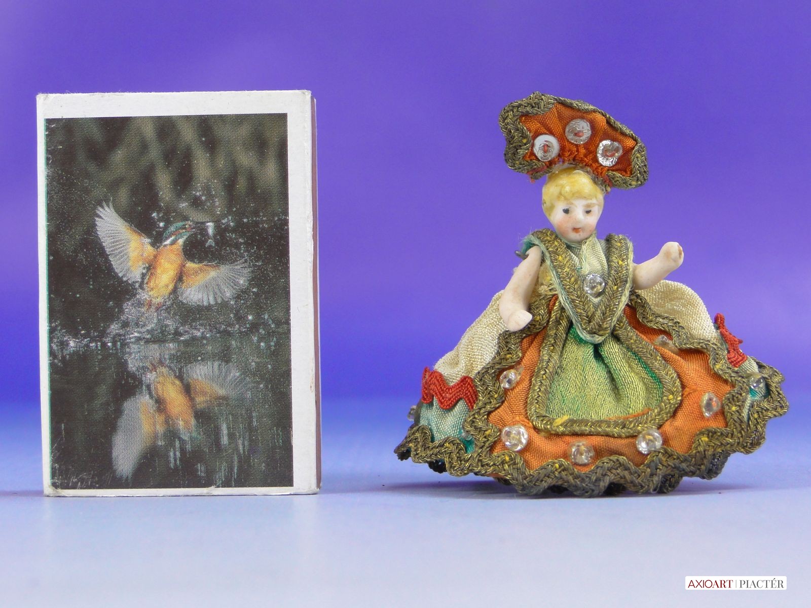 [0F823/X118] Antik kisméretű, népviseletbe öltöztetett, gyűjteménybe való porcelán testű baba, az 1900-as évek elejéről. Végtagjai mozognak, arca kézzel festett. Magasság: 5.5 cm Súly: 0.008 kg