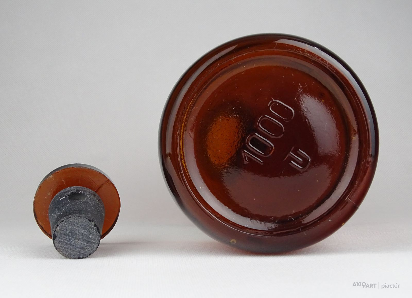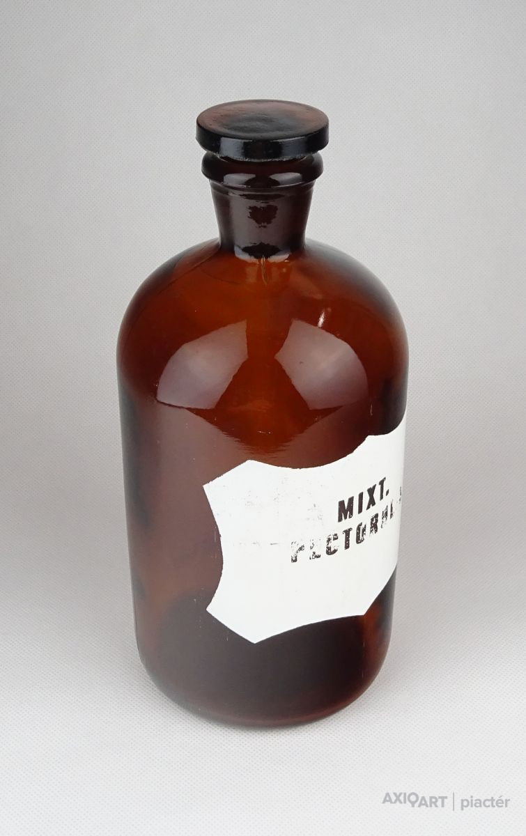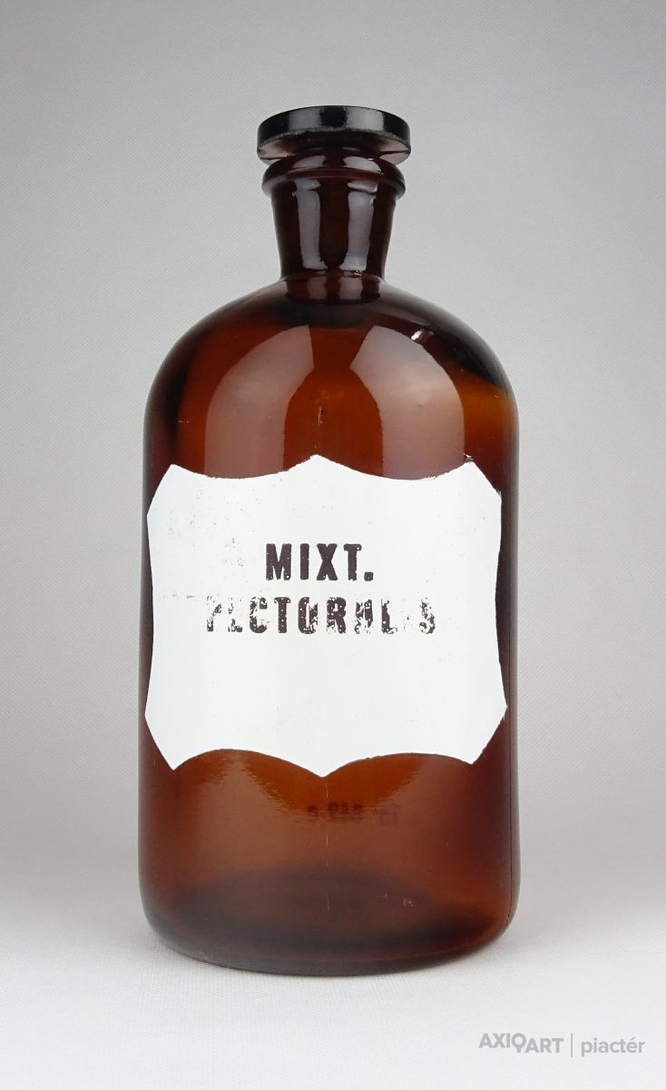 [0Y741/UZ-N] Régi, hibátlan állapotú, nagyméretű, literes, barna színű patika üveg, gyógyszerészeti tároló üveg. Oldalán címke, rajta felirat: MIXT. PECTORALIS (MIXTURA PECTORALIS) Alján felirat: 1000 Magasság: 22.5 cm Szélesség: 10 cm Súly: 0.725 kg