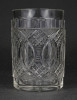 [1N336/X228] Gyönyörű, hibátlan állapotú csiszolt felületű üveg pohár. Oldalán iniciálés monogram: V.E. vagy E.V. Magasság: 10 cm Szélesség: 7 cm Súly: 0.245 kg