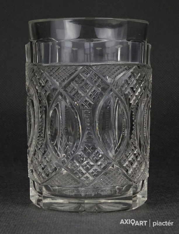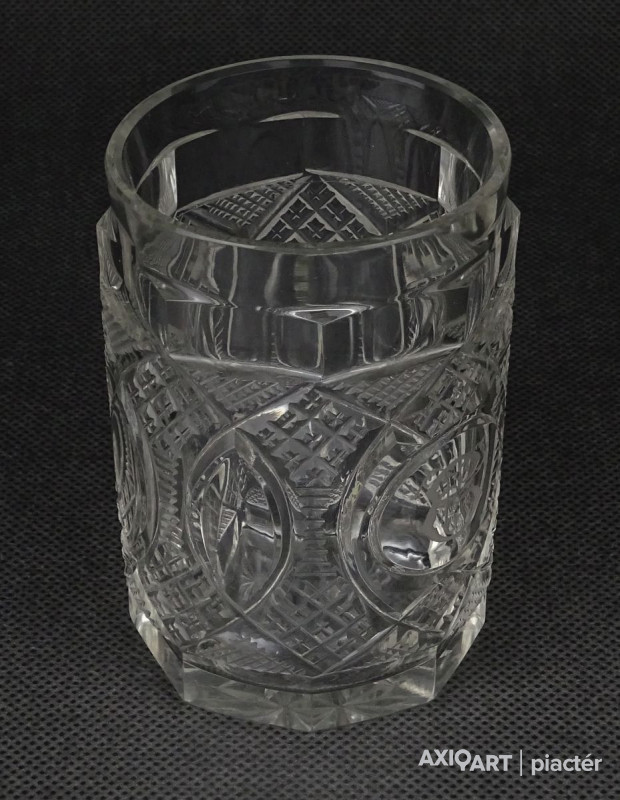 Gyönyörű, hibátlan állapotú csiszolt felületű üveg pohár. Oldalán iniciálés monogram: V.E. vagy E.V.