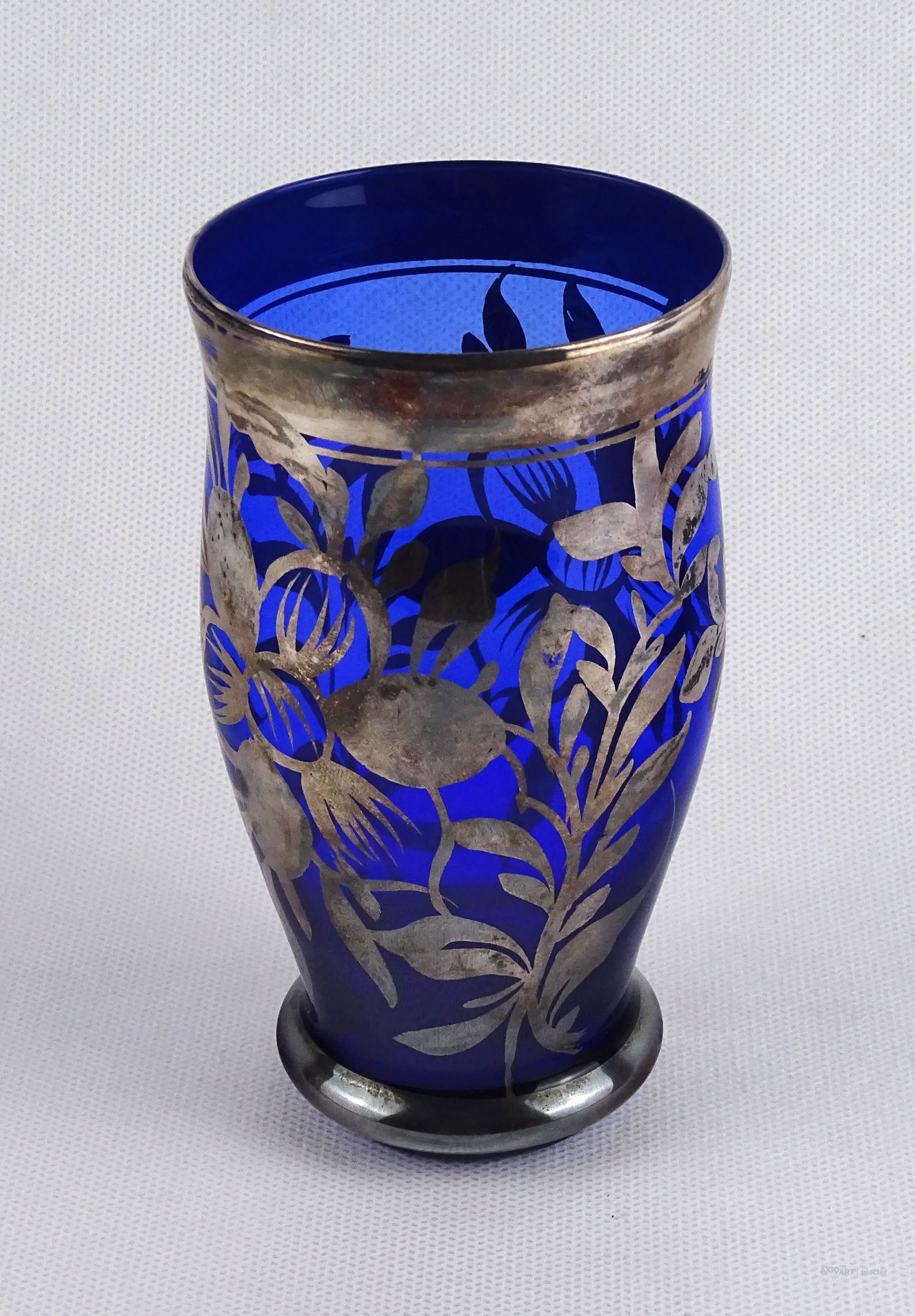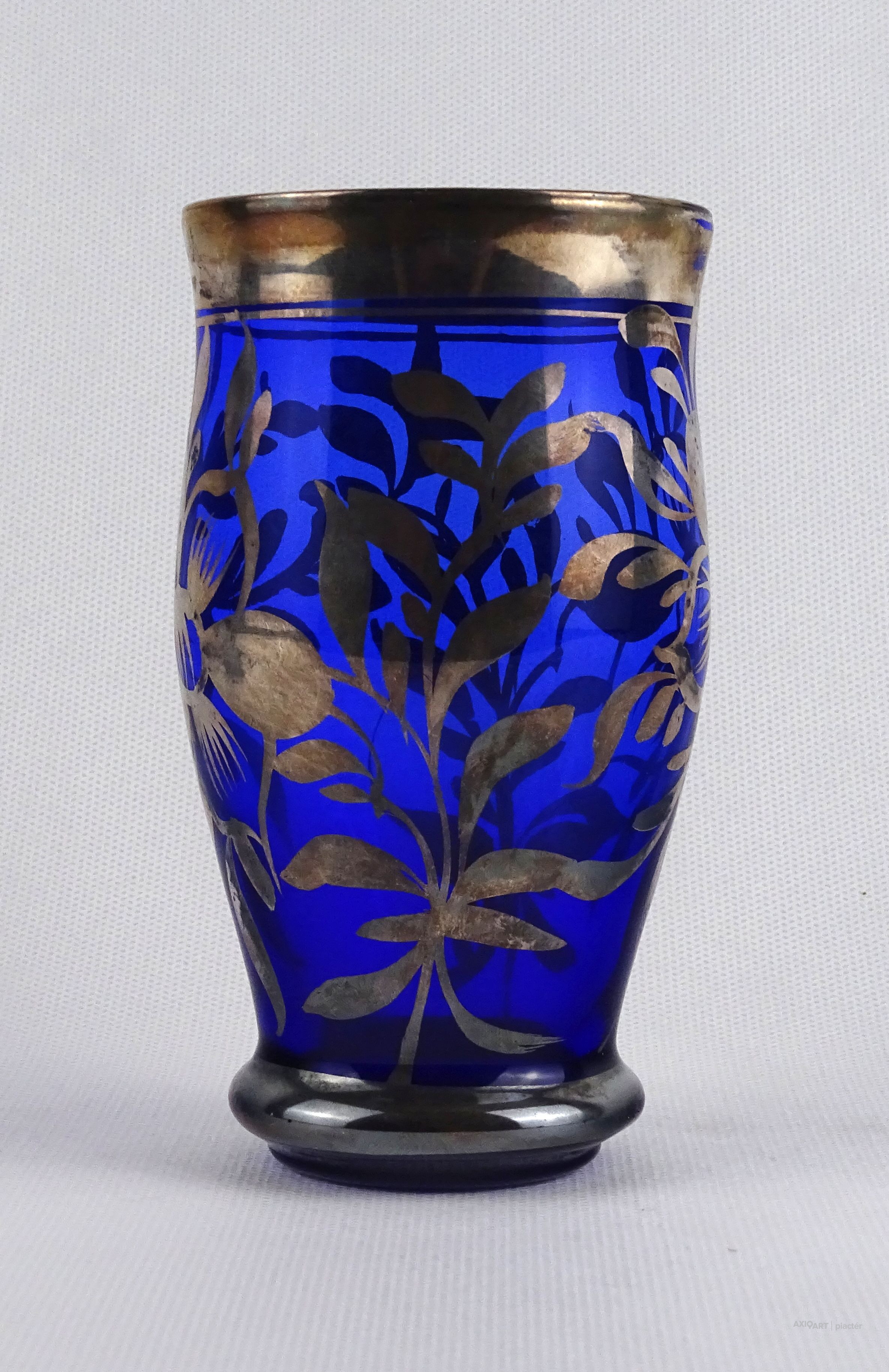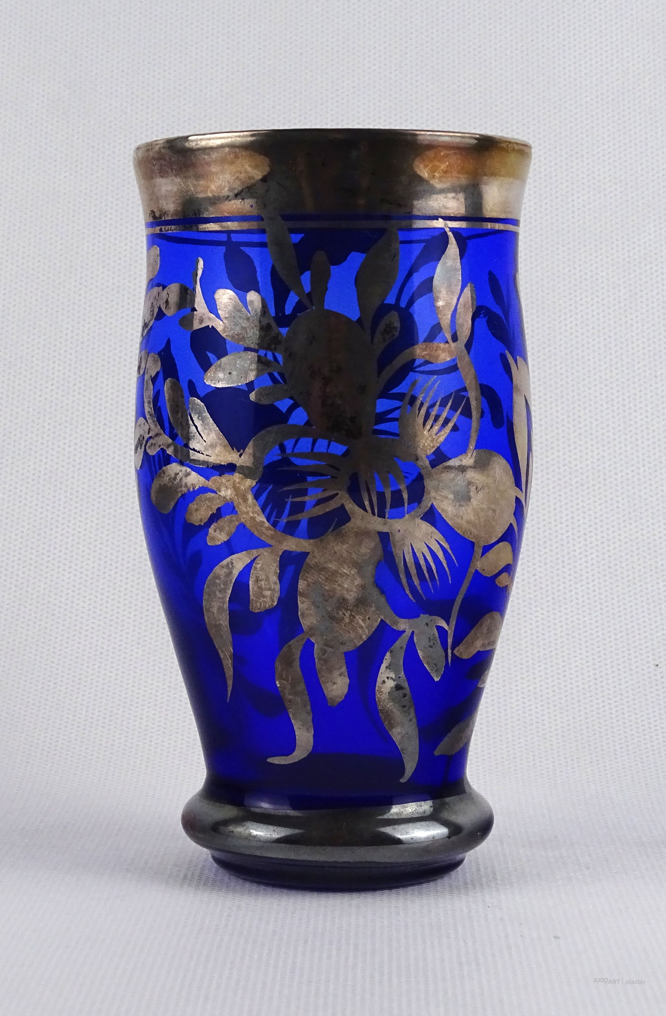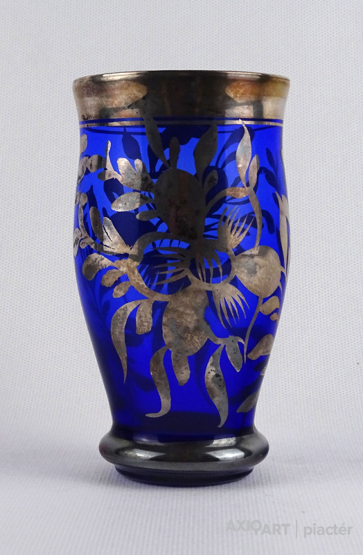 Antik, hibátlan állapotú, ezüstözött, kék színű fújt üveg pohár.