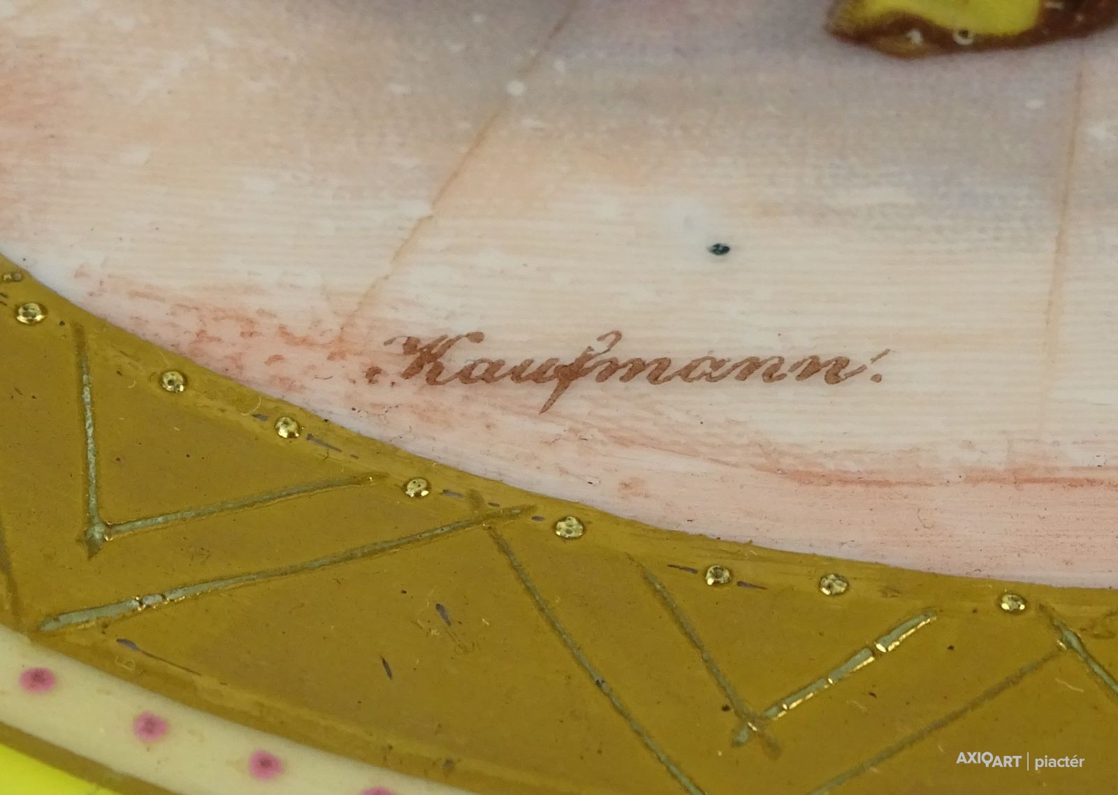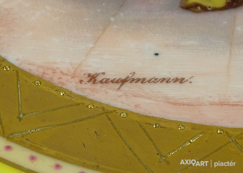 [0P097/Z053] Antik, nagyon dúsan aranyozott, hibátlan állapotú, jelzett Altwien porcelán fali tál, dísztál. Hátoldalán falra akasztási lehetőséggel. A közepén lévő több alakos dísztő motívum alatt jelzés: KAUFMANN Alján kék Altwien jelzés, lásd fotó. Szélesség: 34 cm Súly: 2.795 kg