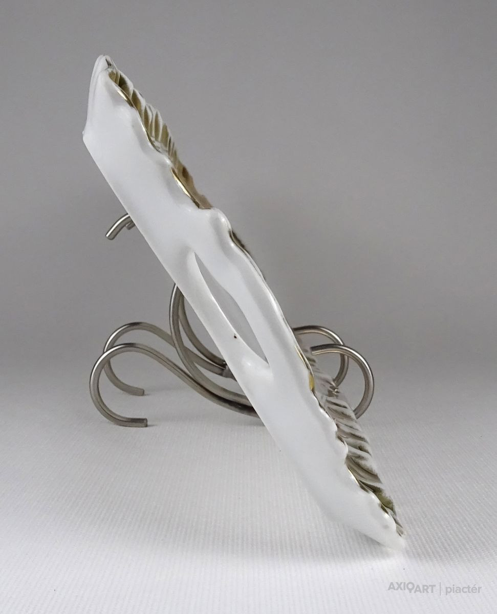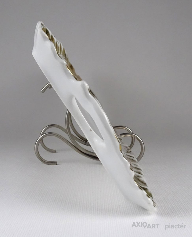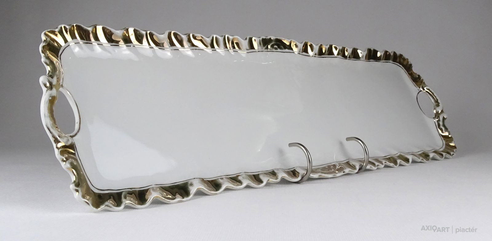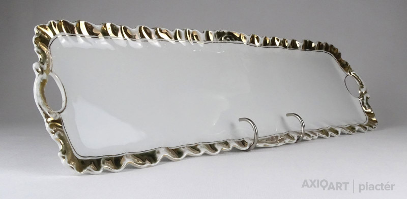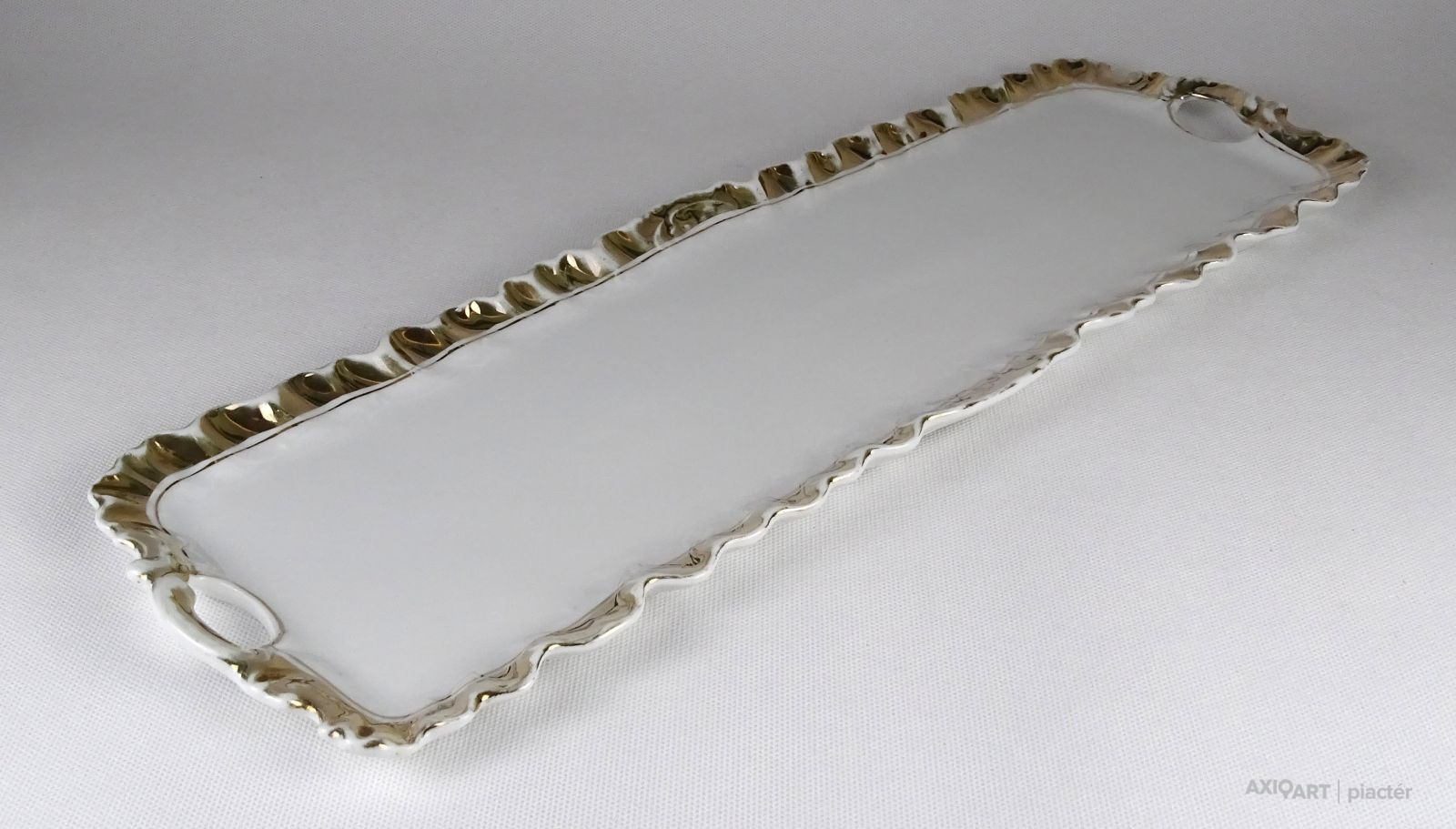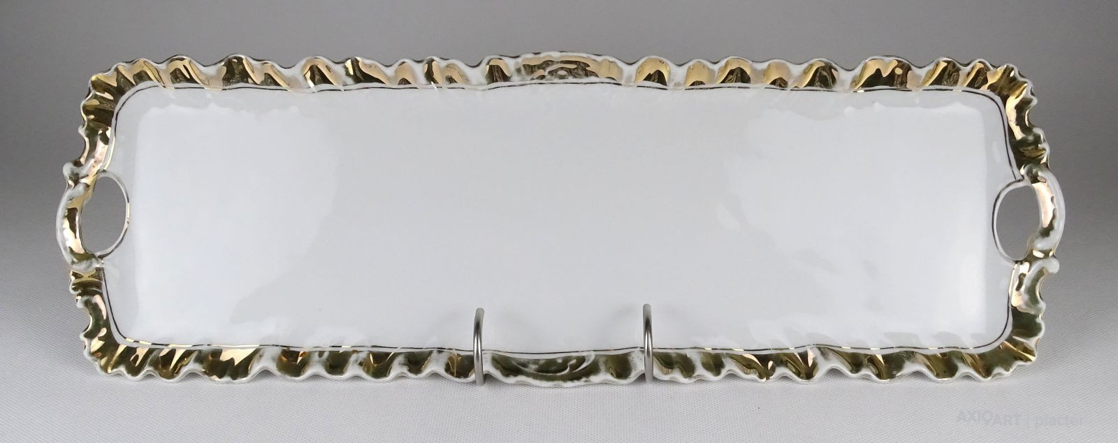 Régi, szép állapotú, nagy méretű, két füles, fehér színű, jelzetlen porcelán kínáló tál, tálca. Gyönyörű fodros széle aranyozással díszített.