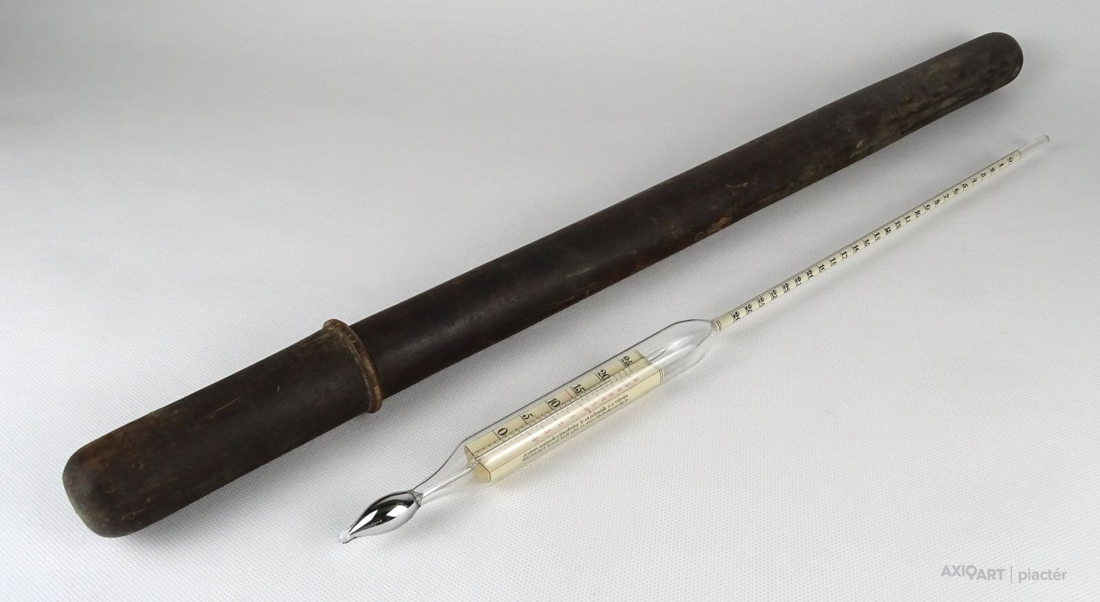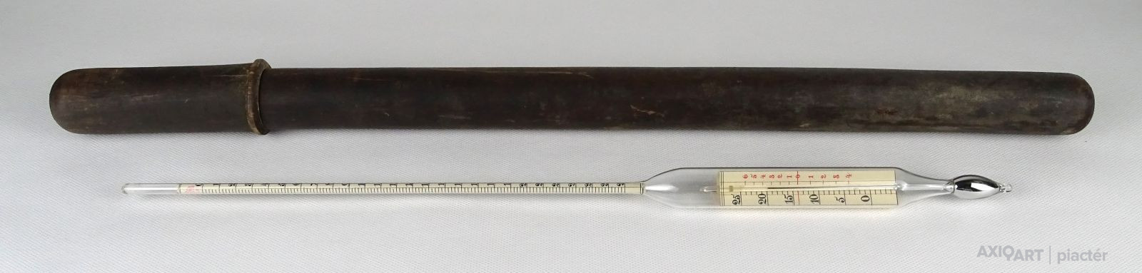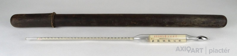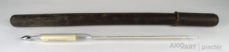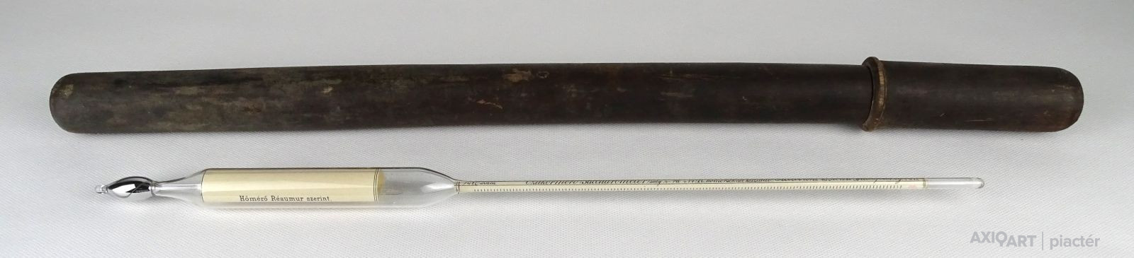 [1N745/X100] Antik, nagy méretű eredeti, biztonsági fa dobozában, tokjában található, jelzett antik skálázott fújt üveg eszköz. Feliratok: CZUKORMÉRŐ SACCHAROMETER CALDERONI ÉS TÁRSA BUDAPEST CG. 4511 1902 ÉV 420 SZÁM HŐMÉRŐ RÉAUMUR SZERINT Hosszúság: 54 cm Súly: 0.19 kg