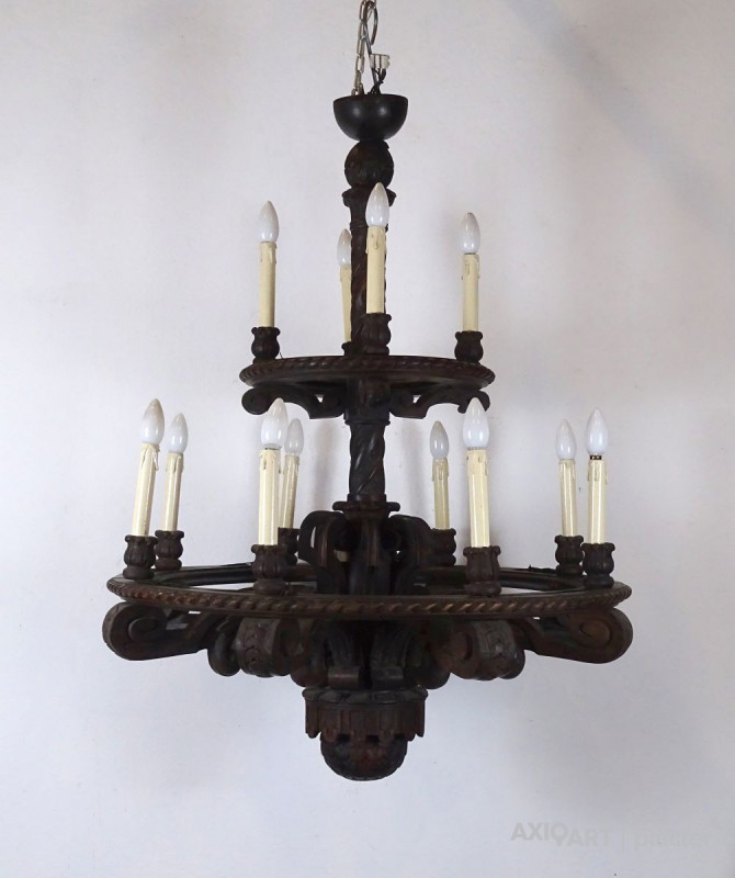 Antik nagyméretű emeletes faragott 12 égős fa csillár 105 x 80 cm