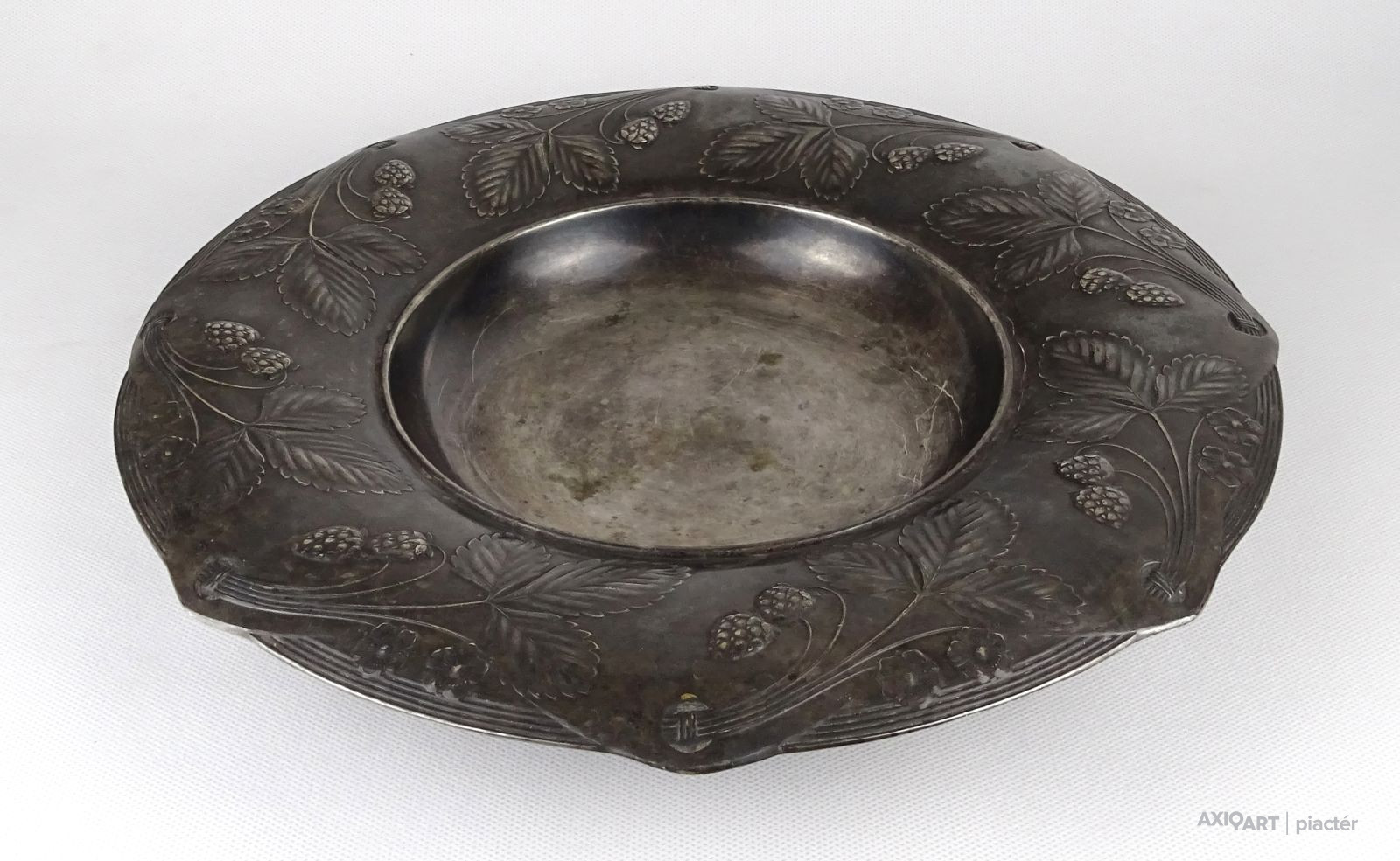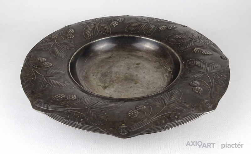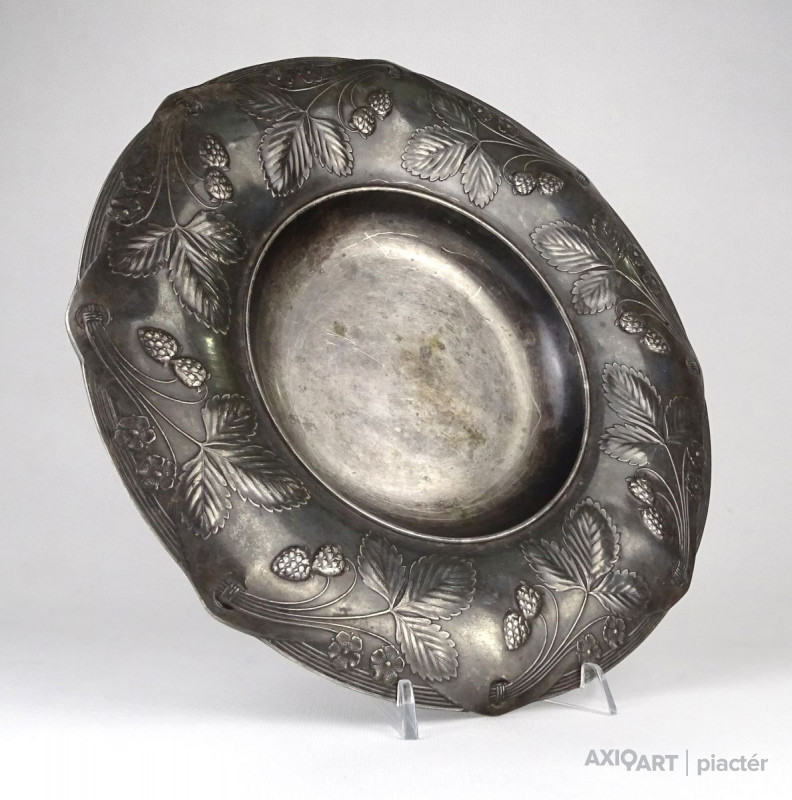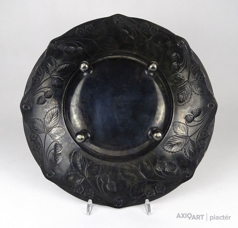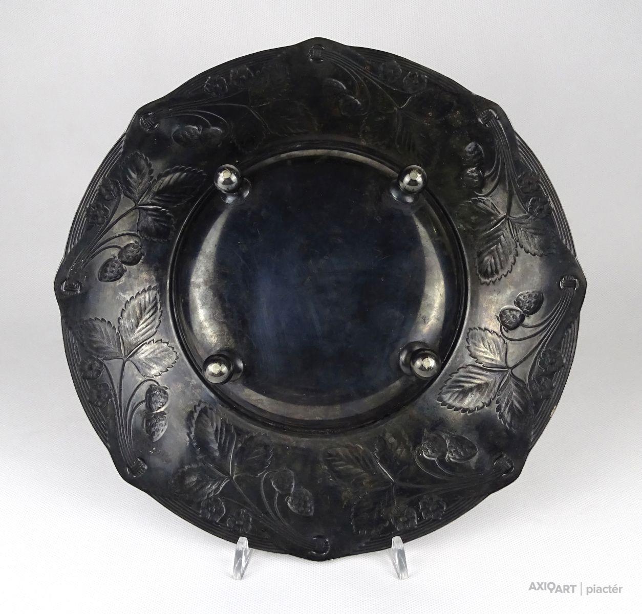 [1P798/IR] Antik, hibátlan állapotú négy pici gömb lábon álló ezüstözött jelzett Szandrik alpakka asztalközép kínáló tál, gyümölcskínáló tál. Alján márkajelzés: SZANDRIK Formaszám: 8883 Magasság: 5 cm Szélesség: 31 cm Súly: 0.6 kg A 20. század elején gyárak is készítettek fém- és ötvöstárgyakat. Az 1896-ban alapított Szandrik Rt. ezüstgyár Alsóhámorban működött; rendszeresen szerepelt modern ízlésű termékeivel az iparművészeti kiállításokon (1900-ban Párizsban ezüstérmet nyert). A másik ismert üzem a Bachruch-gyár volt; ugyancsak tálakat, edényeket készített, konzervatívabb szellemben, mint a már szecessziós ízlésű Szandrik-gyár.   Forrás: http://mek.oszk.hu