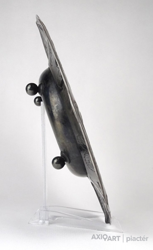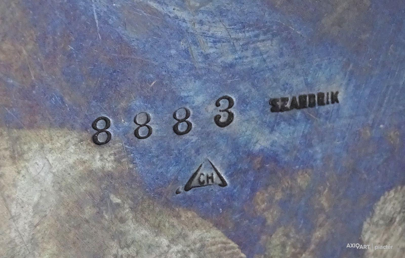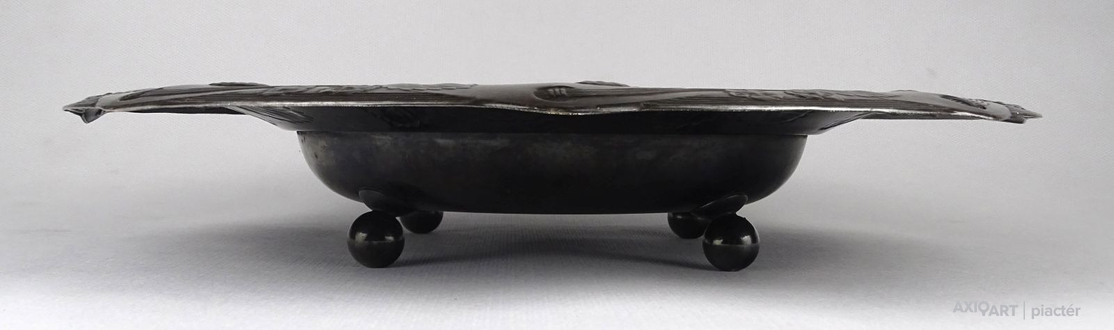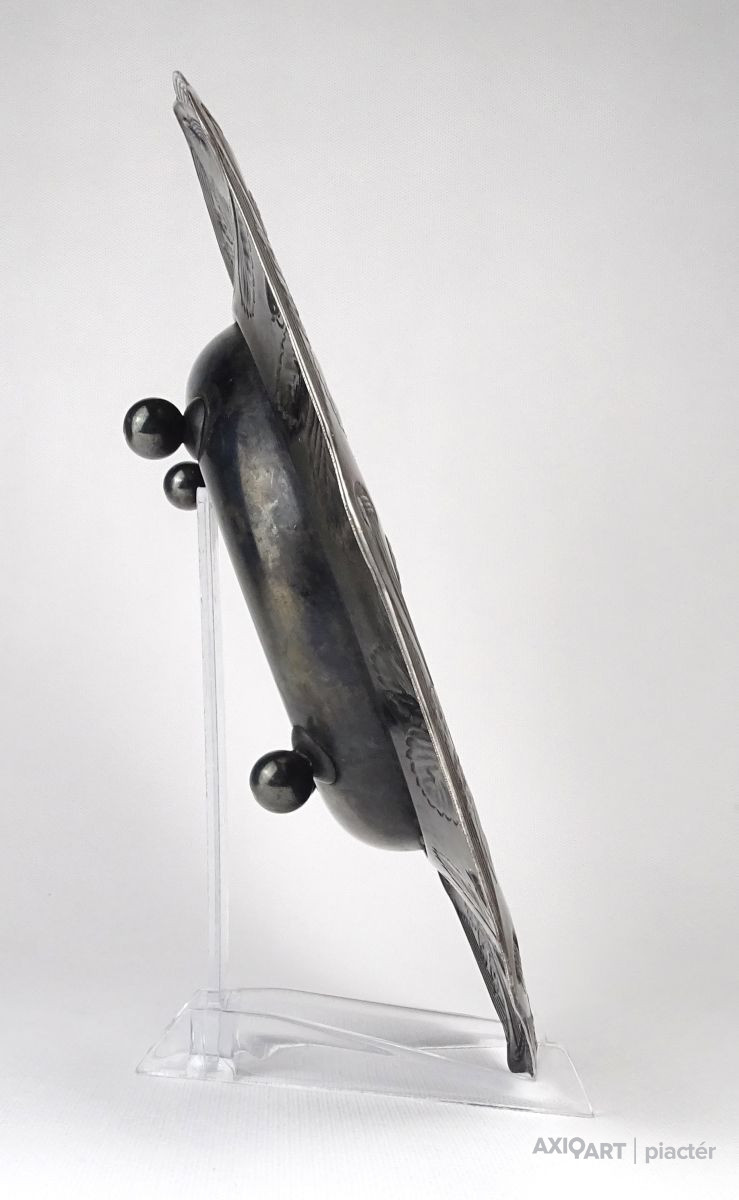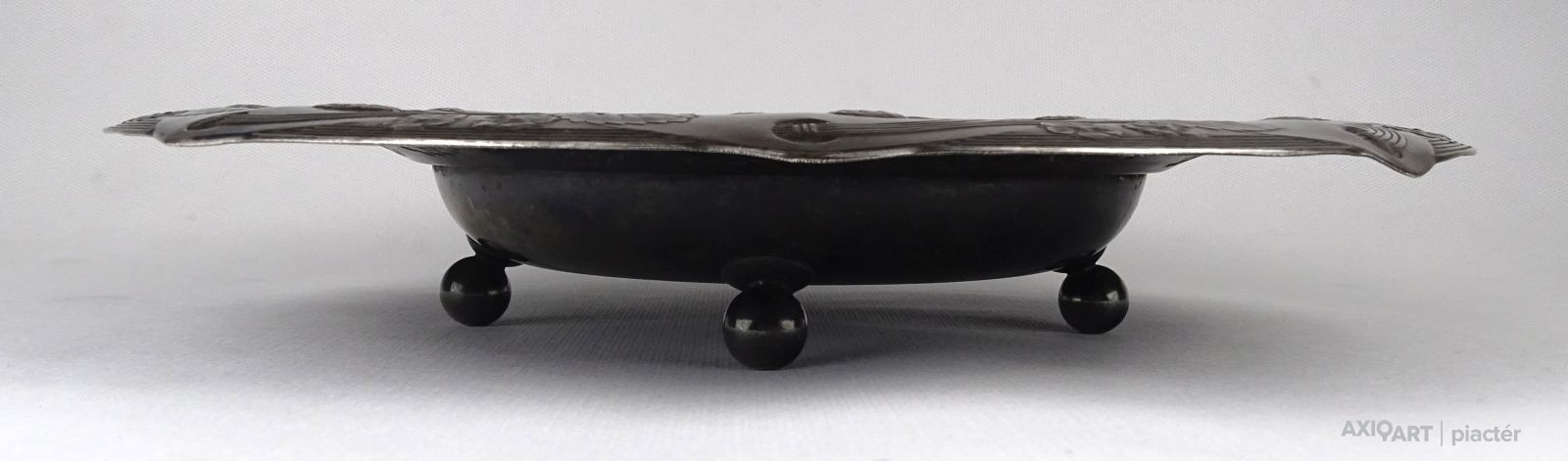 [1P798/IR] Antik, hibátlan állapotú négy pici gömb lábon álló ezüstözött jelzett Szandrik alpakka asztalközép kínáló tál, gyümölcskínáló tál. Alján márkajelzés: SZANDRIK Formaszám: 8883 Magasság: 5 cm Szélesség: 31 cm Súly: 0.6 kg A 20. század elején gyárak is készítettek fém- és ötvöstárgyakat. Az 1896-ban alapított Szandrik Rt. ezüstgyár Alsóhámorban működött; rendszeresen szerepelt modern ízlésű termékeivel az iparművészeti kiállításokon (1900-ban Párizsban ezüstérmet nyert). A másik ismert üzem a Bachruch-gyár volt; ugyancsak tálakat, edényeket készített, konzervatívabb szellemben, mint a már szecessziós ízlésű Szandrik-gyár.   Forrás: http://mek.oszk.hu