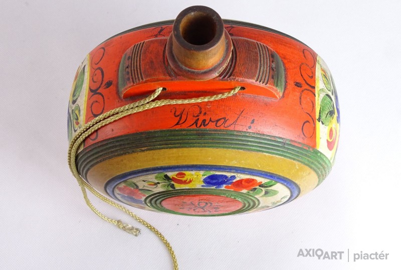 Nagyon régi, hibátlan állapotú, egyetlen fából faragott, feliratos, néprajzi gyűjteménybe illő kulacs, butykos. Nyakánál két oldalt felirat: VIVÁT!