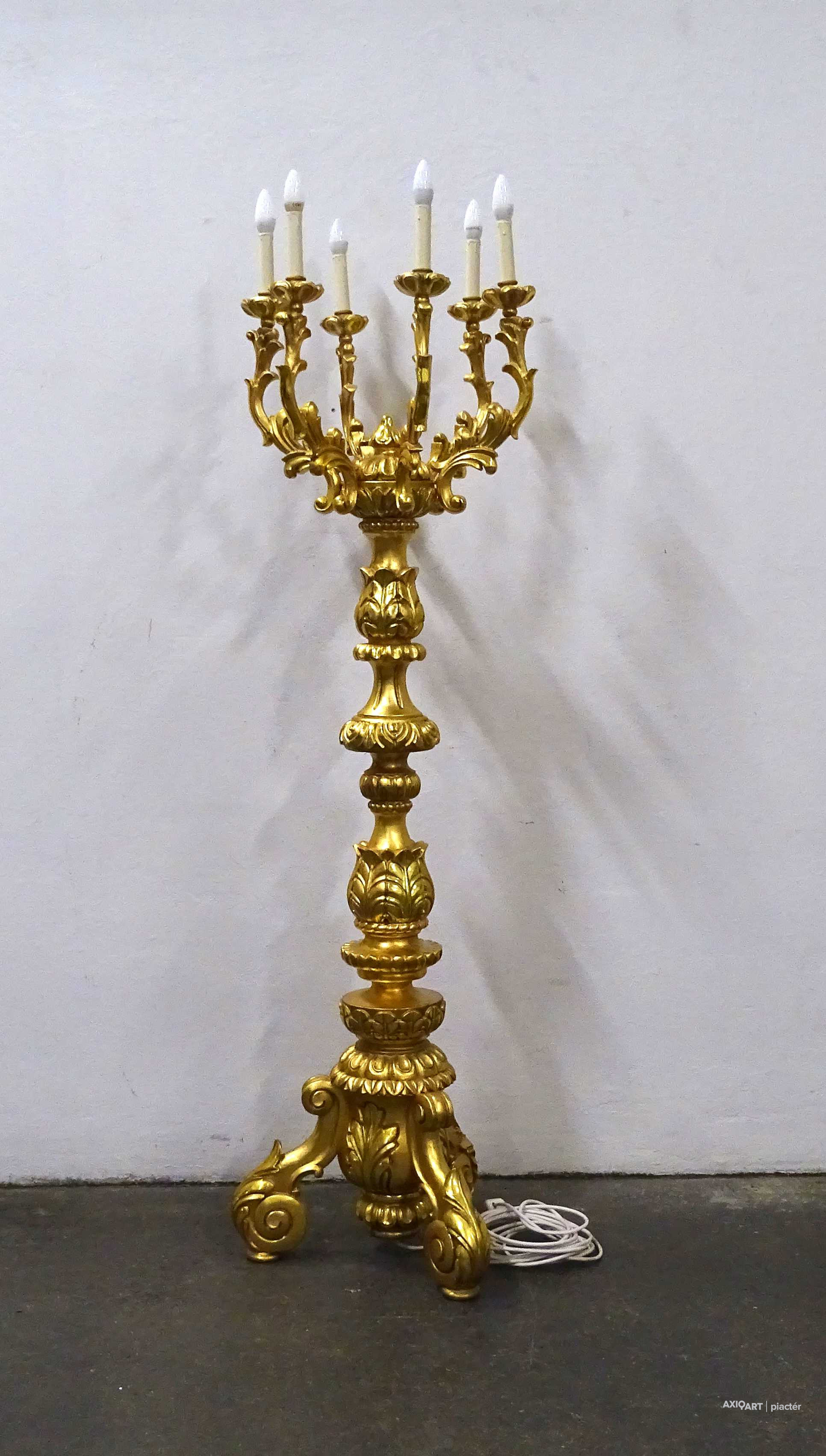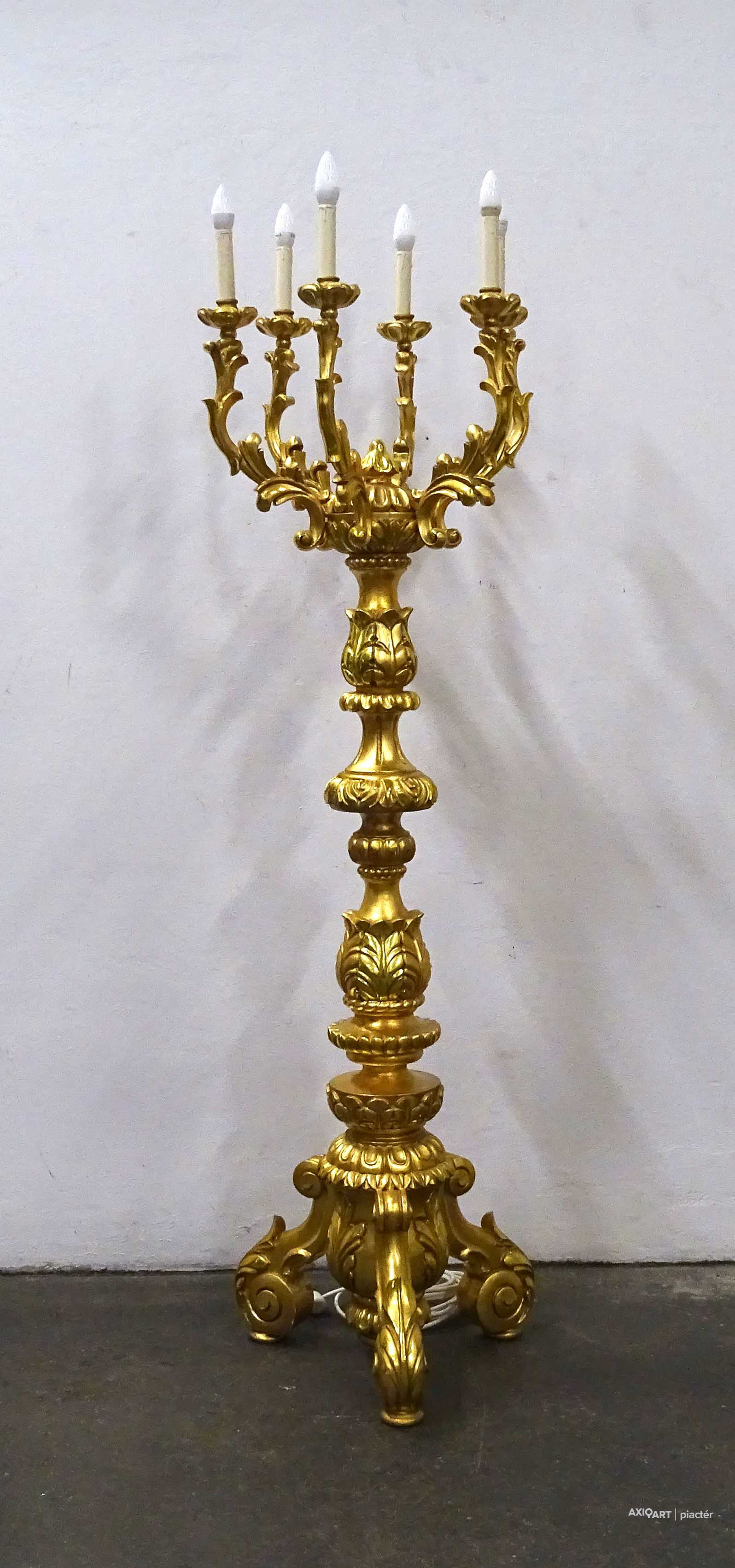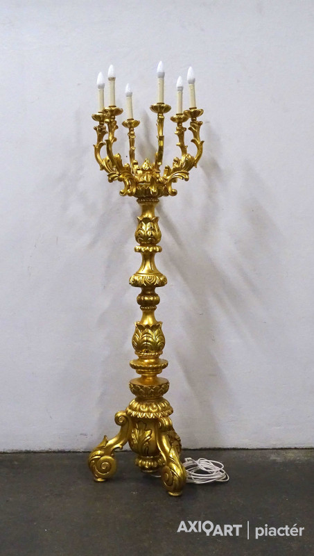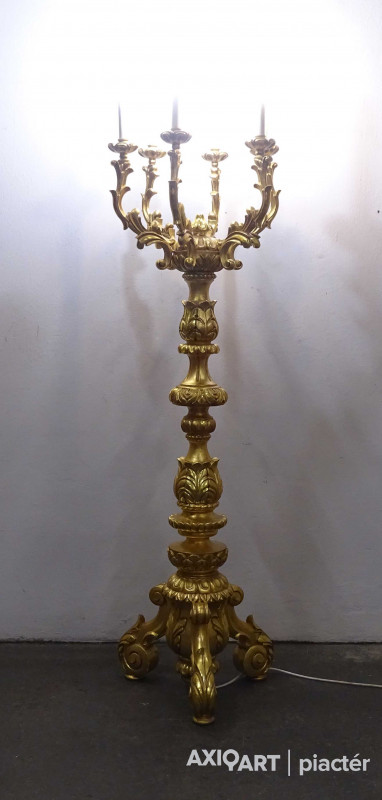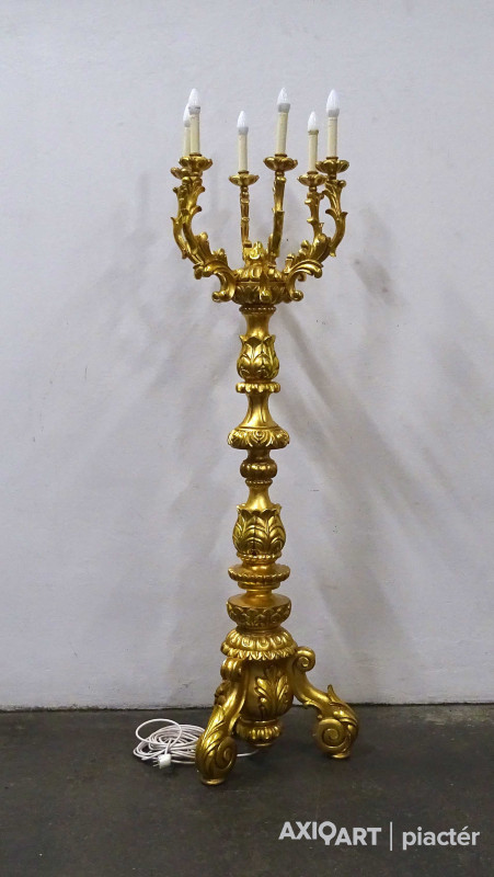 Antik, rendkívül díszes, hatkarú, nagy méretű, laparanyozott fa testű kandeláber, gyertyatartó hatású állólámpa. A vezetékezése korszerűsítve van, az egész lámpa szakszerűen lett felújítva, restaurálva.