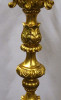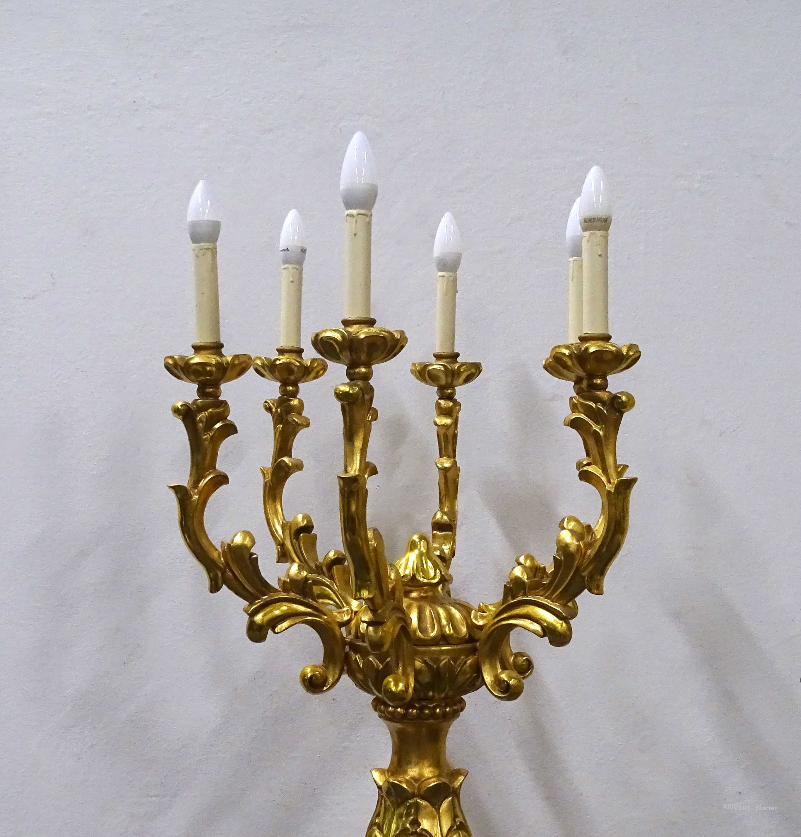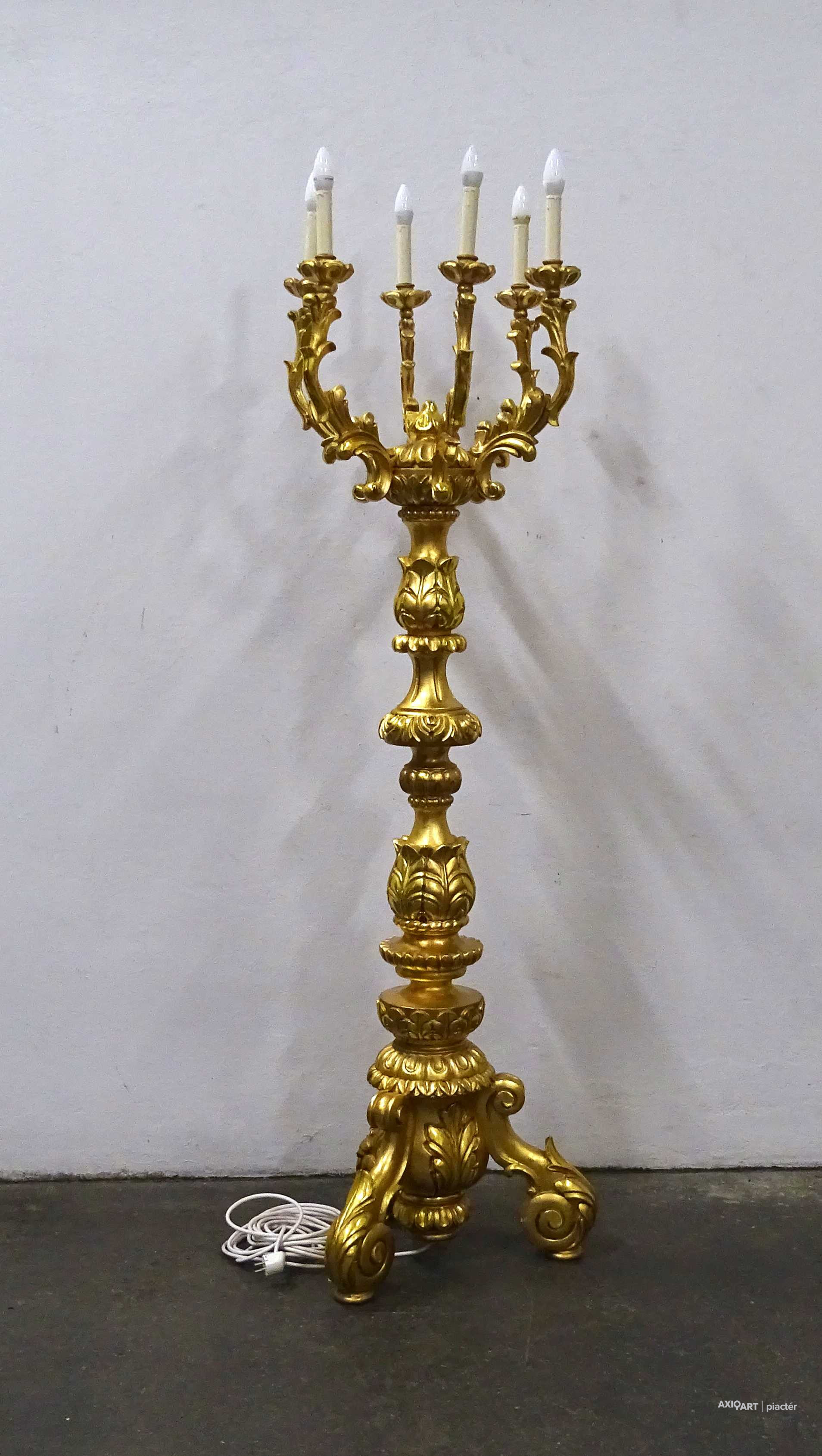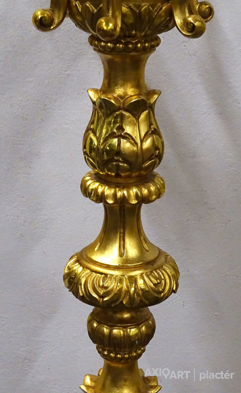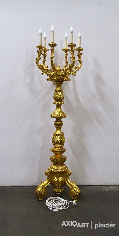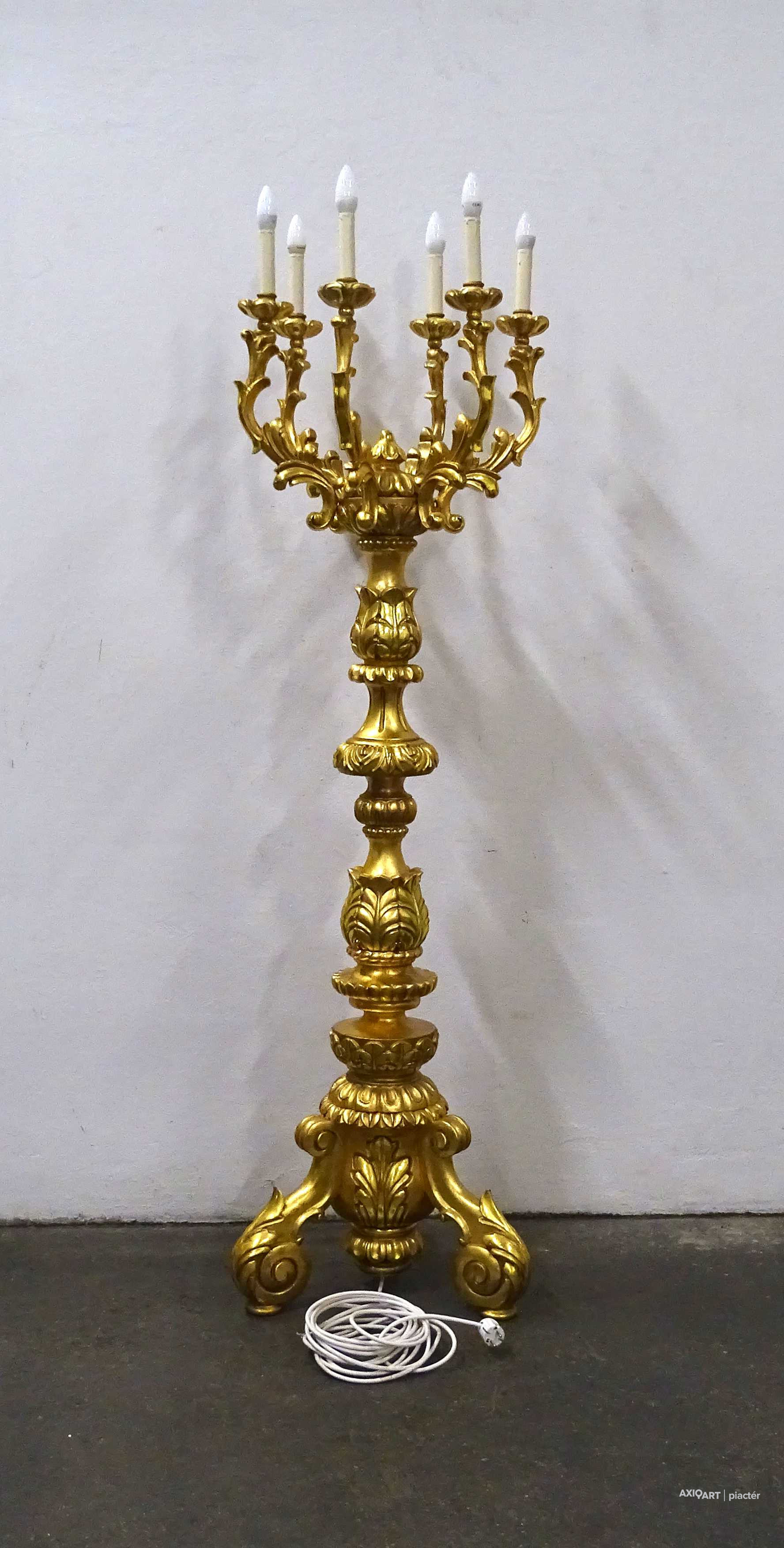 Antik, rendkívül díszes, hatkarú, nagy méretű, laparanyozott fa testű kandeláber, gyertyatartó hatású állólámpa. A vezetékezése korszerűsítve van, az egész lámpa szakszerűen lett felújítva, restaurálva.