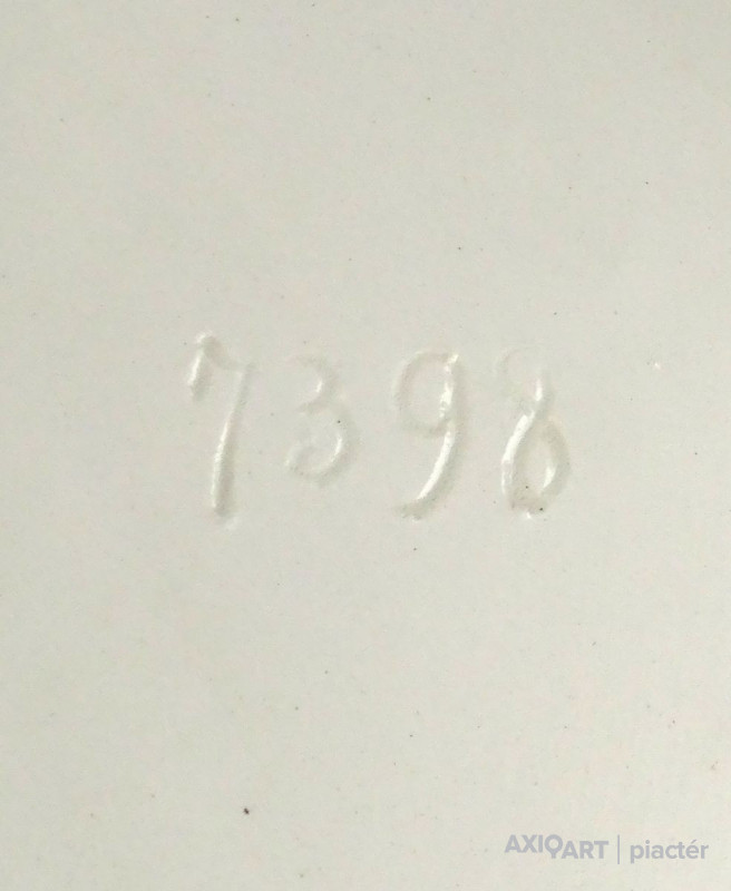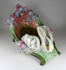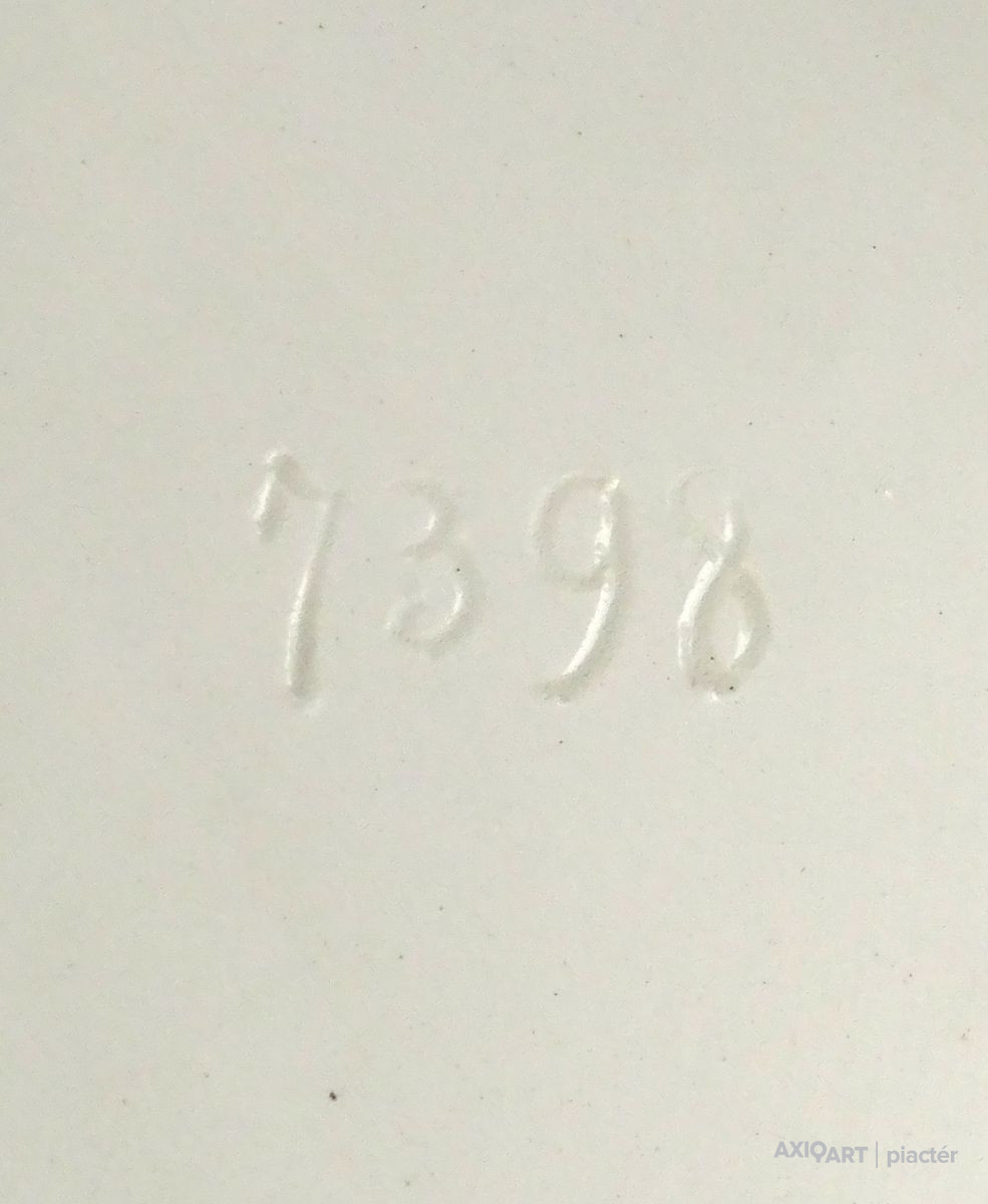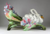 [1L426/UZ-K] Gyönyörű, hibátlan állapotú nagy méretű majolika asztalközép kínáló. Plasztikus virágokkal gazdagon díszített tál, melynek elején egy hattyú ül. Alján formaszám: 7398 Magasság: 27.5 cm Szélesség: 30 cm Hosszúság: 40 cm Súly: 4.735 kg