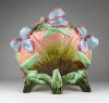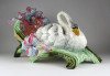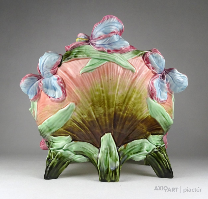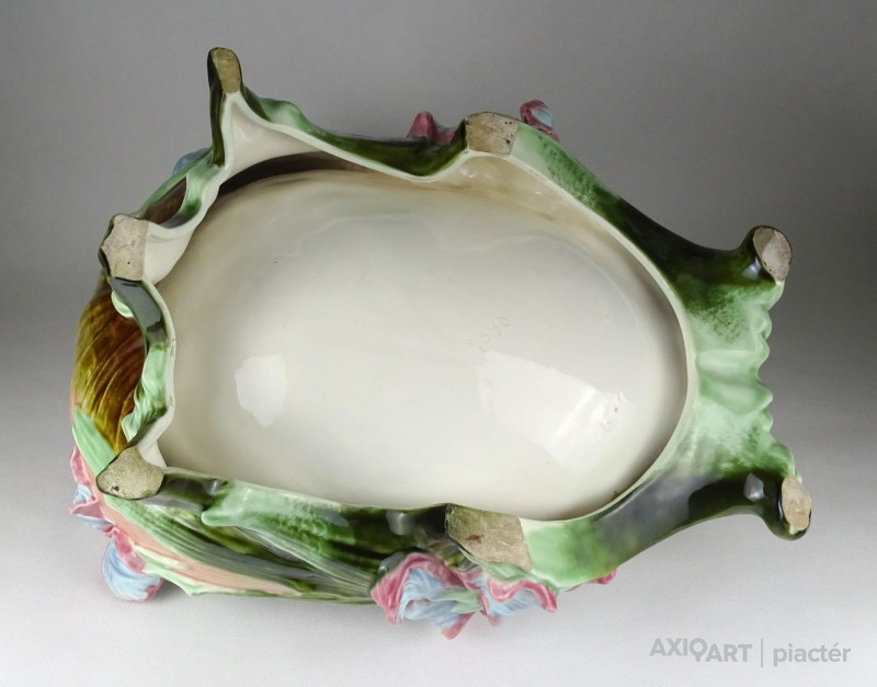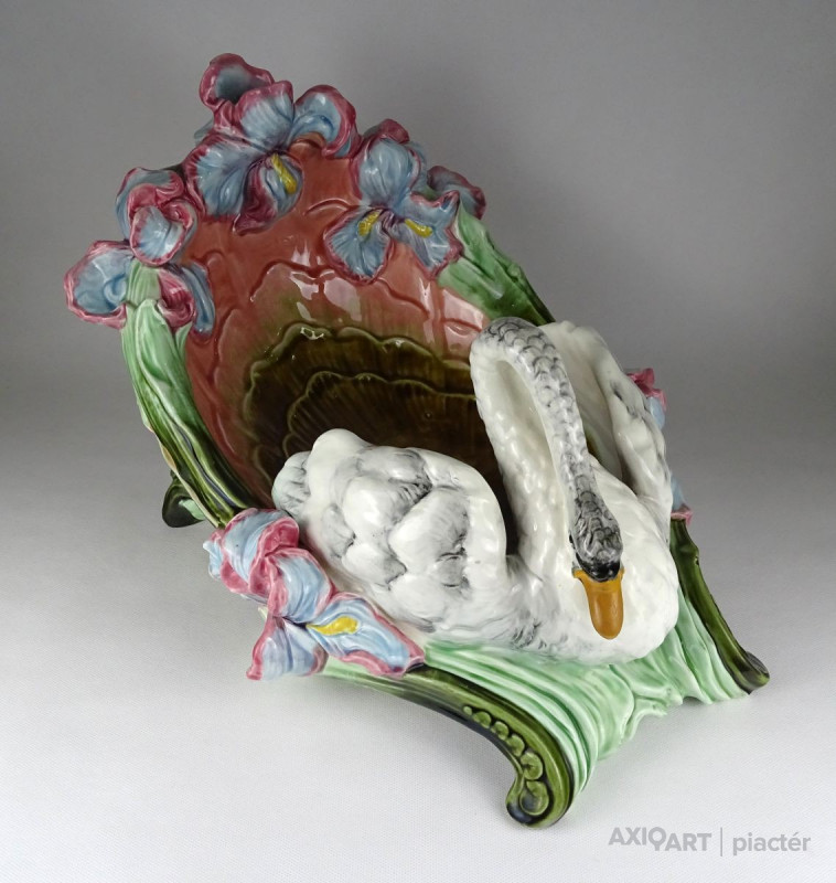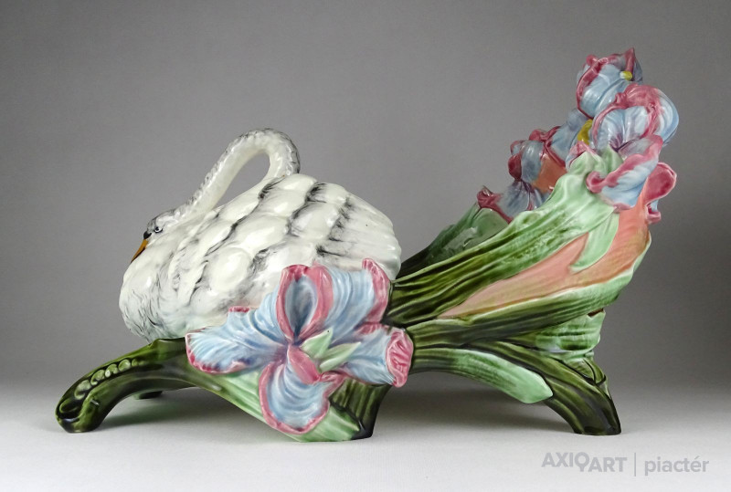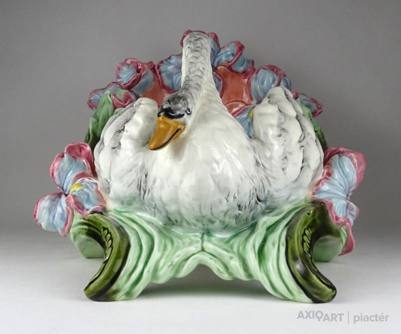 Gyönyörű, hibátlan állapotú nagy méretű majolika asztalközép kínáló. Plasztikus virágokkal gazdagon díszített tál, melynek elején egy hattyú ül.