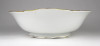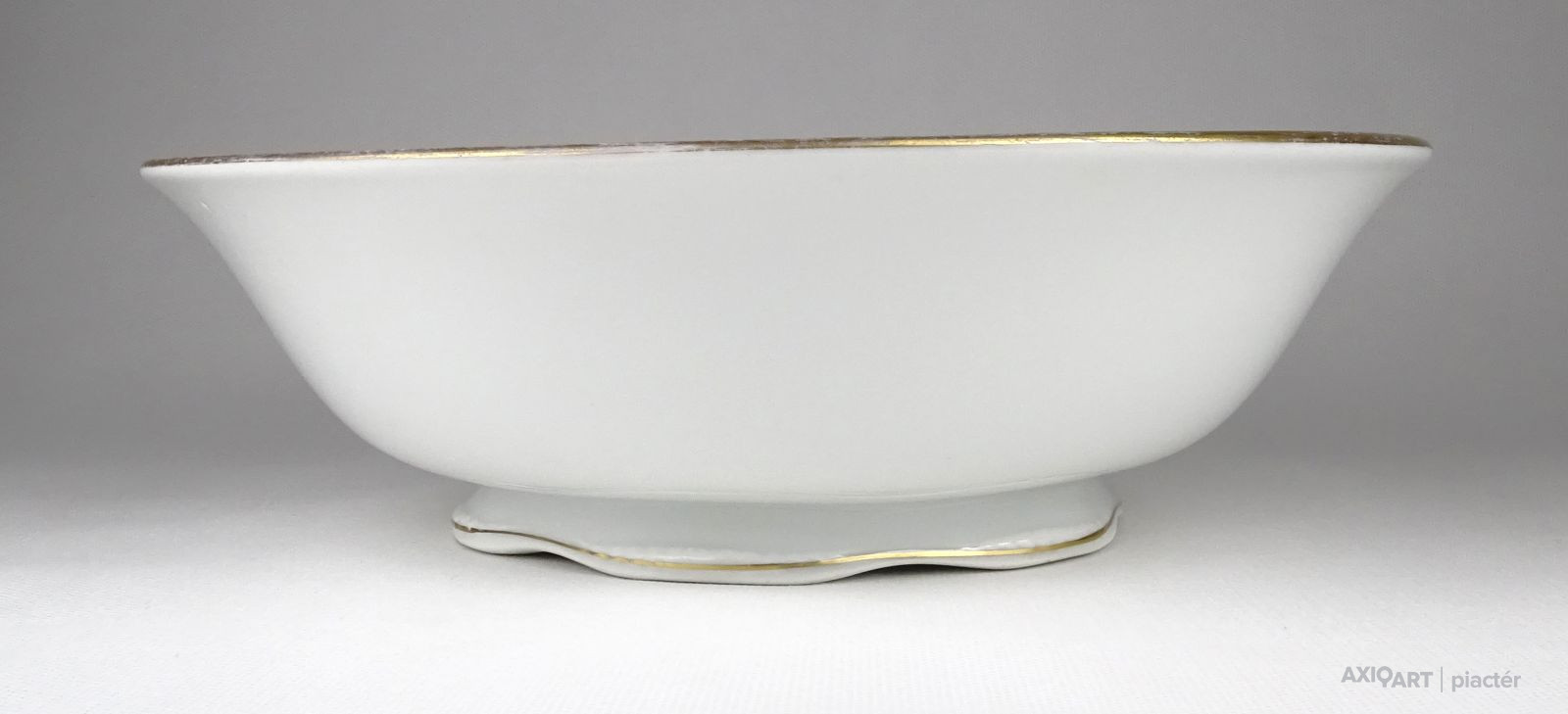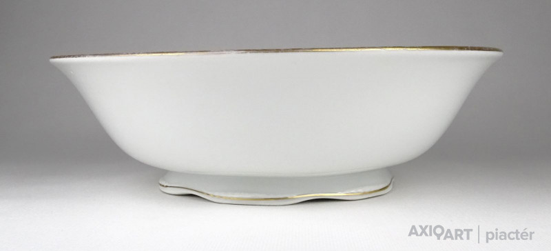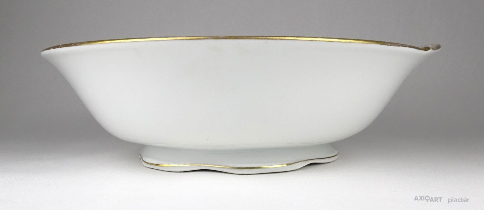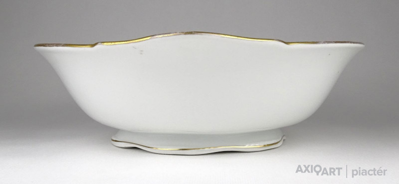 [1P617/X225/2] Hibátlan állapotú, nagyon régi aranyozott szélű porcelán tál az 1800-as évek végéről. Alján zöld jelzés: HÜTTL TIVADAR BUDAPEST Mellette piros koronás jelzés: HÜTTL PORCZELLÁN GYÁRA BUDAPESTEN Magasság: 8.5 cm Szélesség: 26.7 cm Hosszúság: 28.5 cm Súly: 0.965 kg