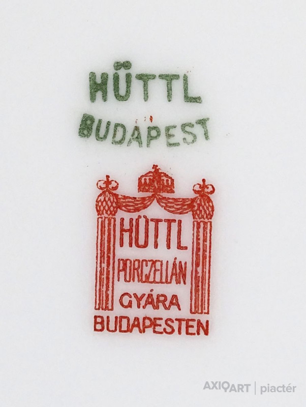 [1L490/X291] Régi jelzett nagy méretű porcelán tányér pár. Pereme aranyozott. Alján zöld jelzés: HÜTTL TIVADAR CS. ÉS KIR. UDVARI SZÁLLÍTÓ BUDAPEST Szélesség: 25.5 cm Súly: 0.85 kg Hüttl Tivadar (nagykereskedő)    Hüttl Tivadar Hüttl Tivadar mellképe id. Vastag György festménye után Született 1841. február 2. Loket Elhunyt 1910. április 4. (69 évesen) Budapest Állampolgársága Osztrák Szilézia cseh osztrák osztrák–magyar Gyermekei hat gyermek: Hüttl Tivadar Szülei „Hüttl Ede” „Bayer Katalin” Foglalkozása nagykereskedő gyáriparos Kitüntetései Ferenc József-rend Sírhelye Fiumei Úti Sírkert Id. Hüttl Tivadar (Loket, 1841. február 2. – Budapest, 1910. április 4.) porcelán- és üvegáru nagykereskedő, kereskedelmi tanácsos. 1903-ban saját porcelángyárat alapított Budapesten. A második házasságából származó ifj. Hüttl Tivadar sebész, országgyűlési képviselő, a Hüttl orvosdinasztia alapítójának édesapja.  Élete A Felső- és Alsósziléziai Hercegségben lévő Elbogen an der Eger „Deutschböhmen” városban született Hüttl Ede kereskedő és Bayer Katalin fiaként. Már édesapja is kereskedéssel foglalkozott. A család az 1850-es években települt Pestre, és 1854-ben megnyitották a Lloyd-palotában porcelán- és üvegáru kereskedésüket, ami egyúttal az elbogeni Heldingler testvérek porcelángyárának helyi képviselete is volt. Hüttl tivadar az Országos Iparegyesület igazgatósági tagjai között 1893-ban. Hüttl Tivadar porcelánboltjának reklámja az Ország-Világ 1907. Először porcelán lerakatot hoztak létre Óbudán, majd festették a porcelánt, ezt követően kezdett porcelángyártássál foglalkozni. A császári és királyi szállító címet is megszerezte. Szállított porcelánt Ferenc József uralkodónak, a magyar parlamentnek, az uralkodó tisztikarának. Az ő gyára lett az Aquincum Porcelángyár Óbudán, ugyanis az ő gyárát is államosították. Számtalan neves orvos került ki a családjából. Két házassága volt, első felesége Bayer Franciska, akit 1868. április 19-én vett feleségül a budapesti Szent István-bazilikában, s akitől később megözvegyült. Második felesége Steudemann Johanna Erzsébet, akivel 1883. október 9-én kötött házasságot szintén a budapesti Szent István-bazilikában. Tagja és vezetője volt a Budapesti Ipar- és Kereskedelmi Kamarának is. Halálát érelmeszesedés okozta.