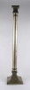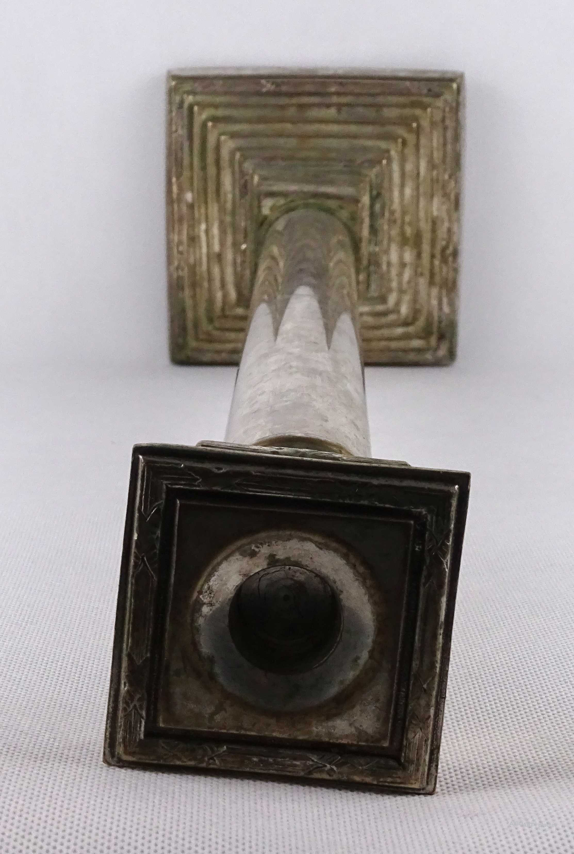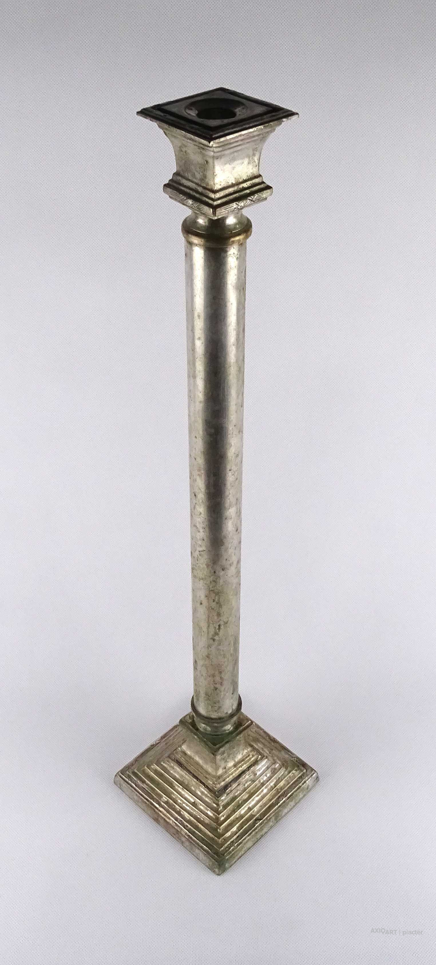[1W504/X249] Antik, szép állapotú, nagy méretű, szögletes aljú, oszlopszerű klasszicista stílusú, ezüstözött, réz gyertyatartó, kandelláber. Talpának külső peremén gyártói jelzés: D+W Magasság: 62 cm Szélesség: 13.5 cm Hosszúság: 13.5 cm Súly: 2.26 kg