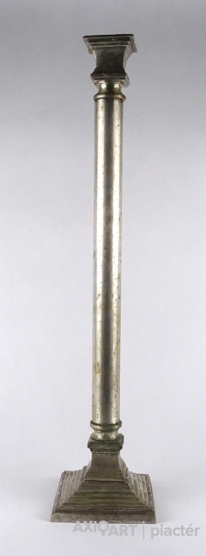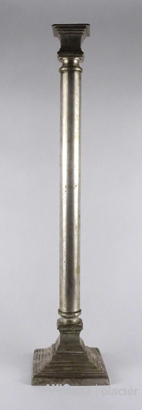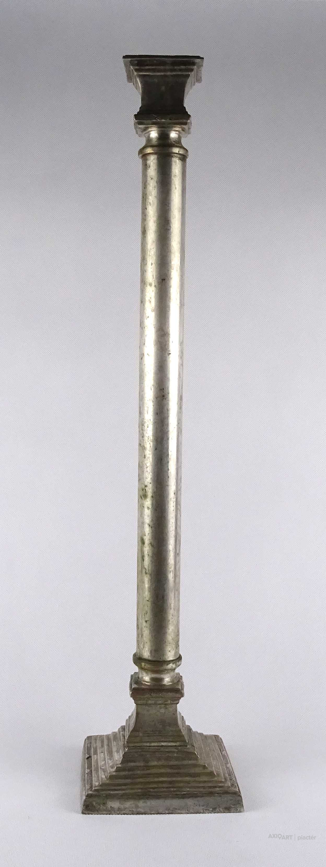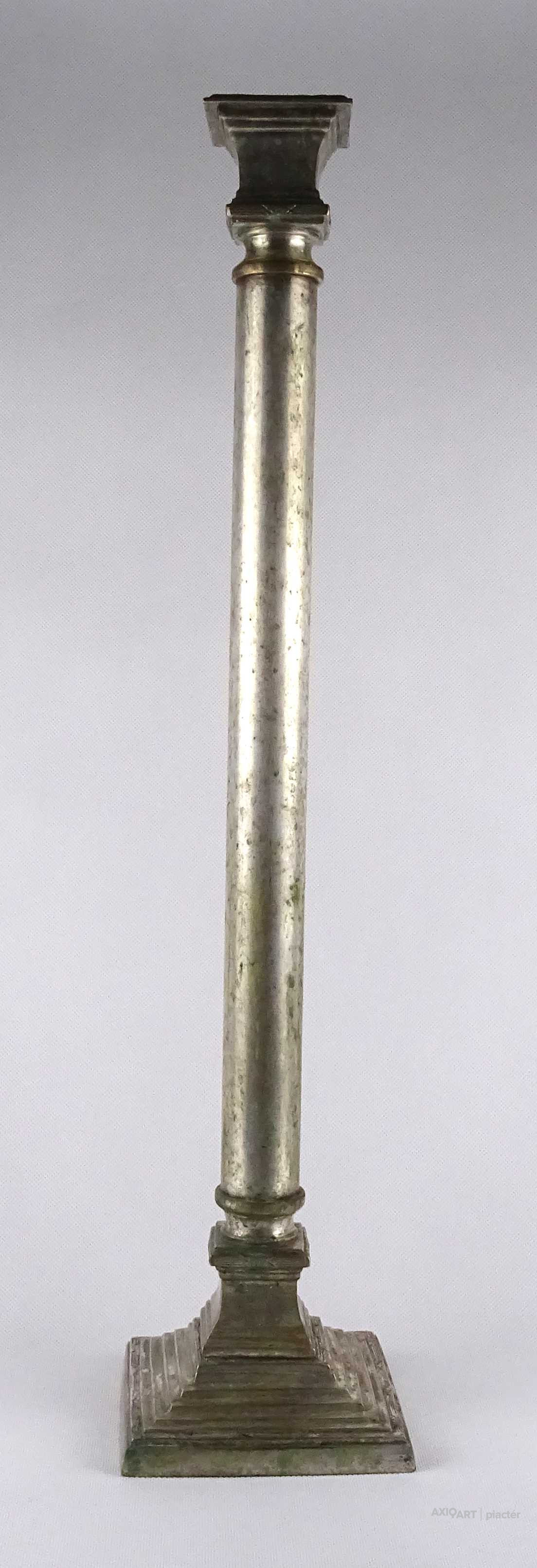 Antik, szép állapotú, nagy méretű, szögletes aljú, oszlopszerű klasszicista stílusú, ezüstözött, réz gyertyatartó, kandelláber.