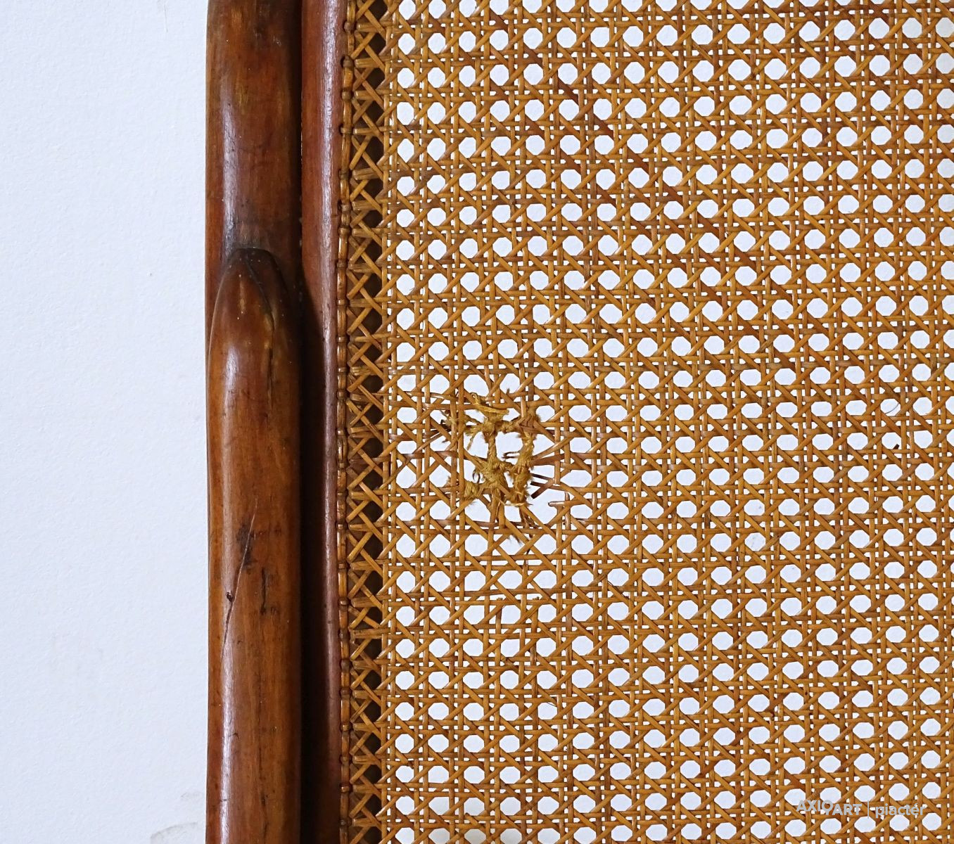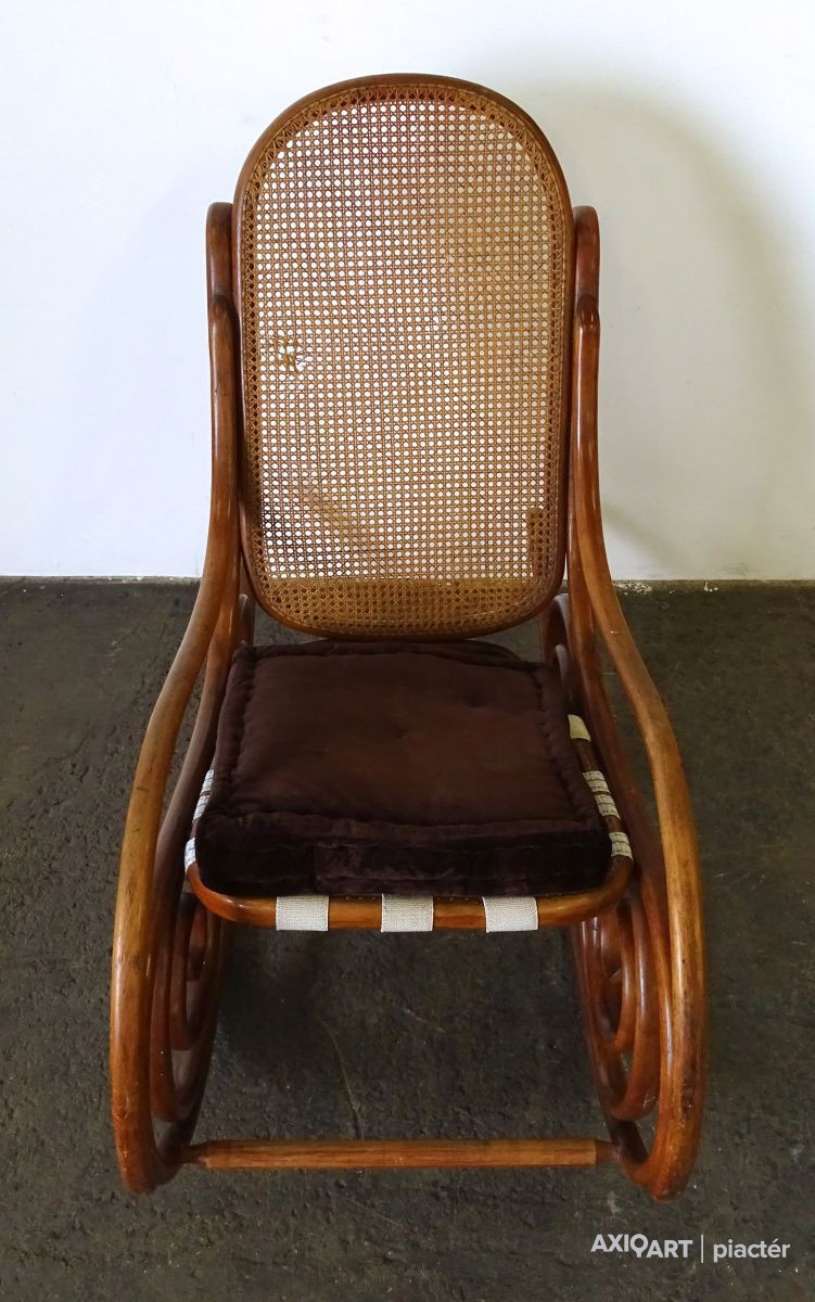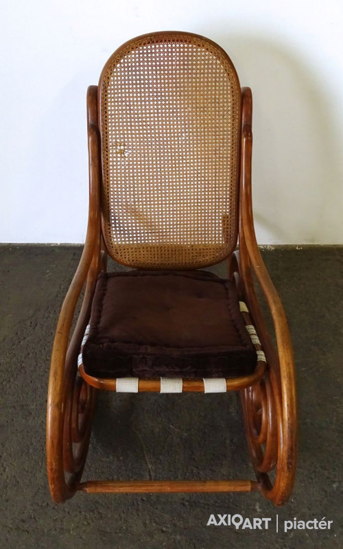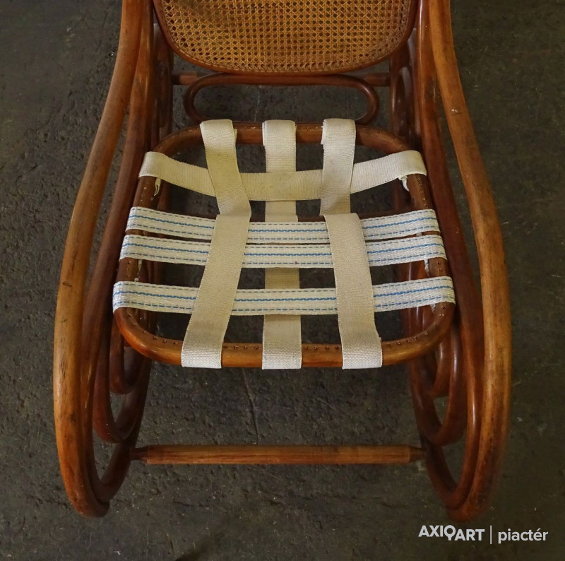 Antik, hajlított fából készült, nagy méretű jelzett Mundus pihenő szék. Ülőfelülete és támlája javításra szorul. A szék alján jelzés. Antik monarchia korabeli koronás magyar királyi címeres vignetta, rajta felirat: