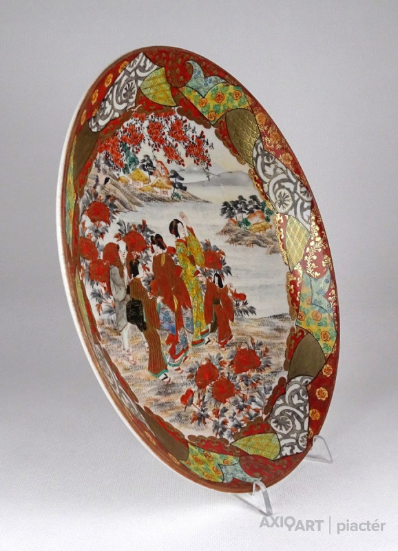 [1M254/X292] Antik hibátlan állapotú, nagy méretű, kézi festéssel díszített, aranyozott ötalakos porcelán tál, dísztál. Alján piros kézifestésű kalligrafikus jelzés, lásd fotó. Szélesség: 30 cm Súly: 1.245 kg