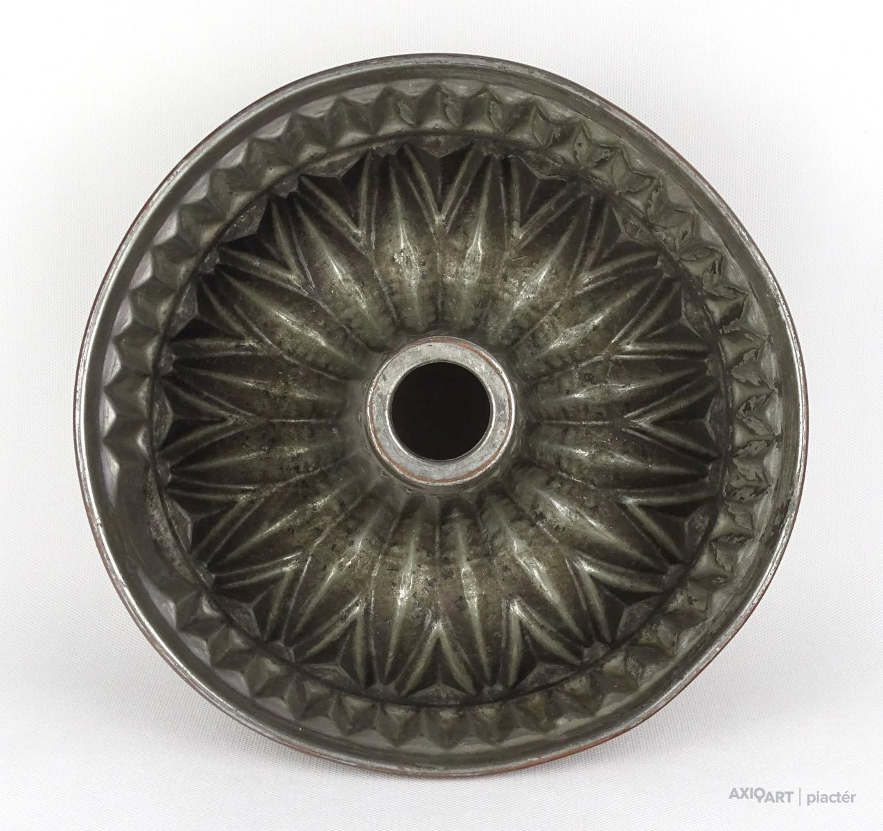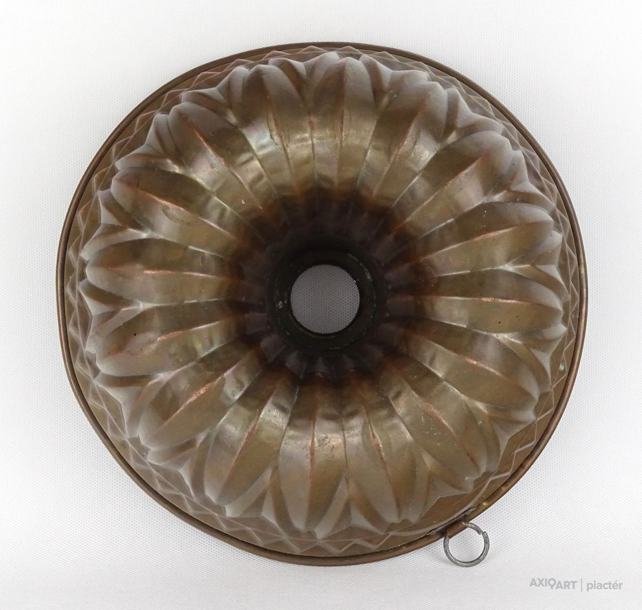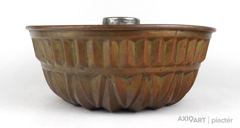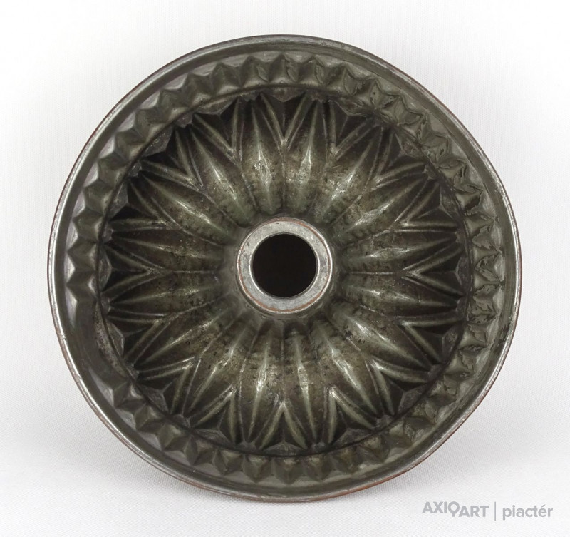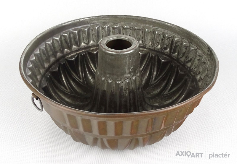 Antik nagy méretű konyhai, cukrászati eszköz. Akasztási lehetőséggel rendelkező sütemény sütő forma. Belső felülete ónozott. Kuglófforma.