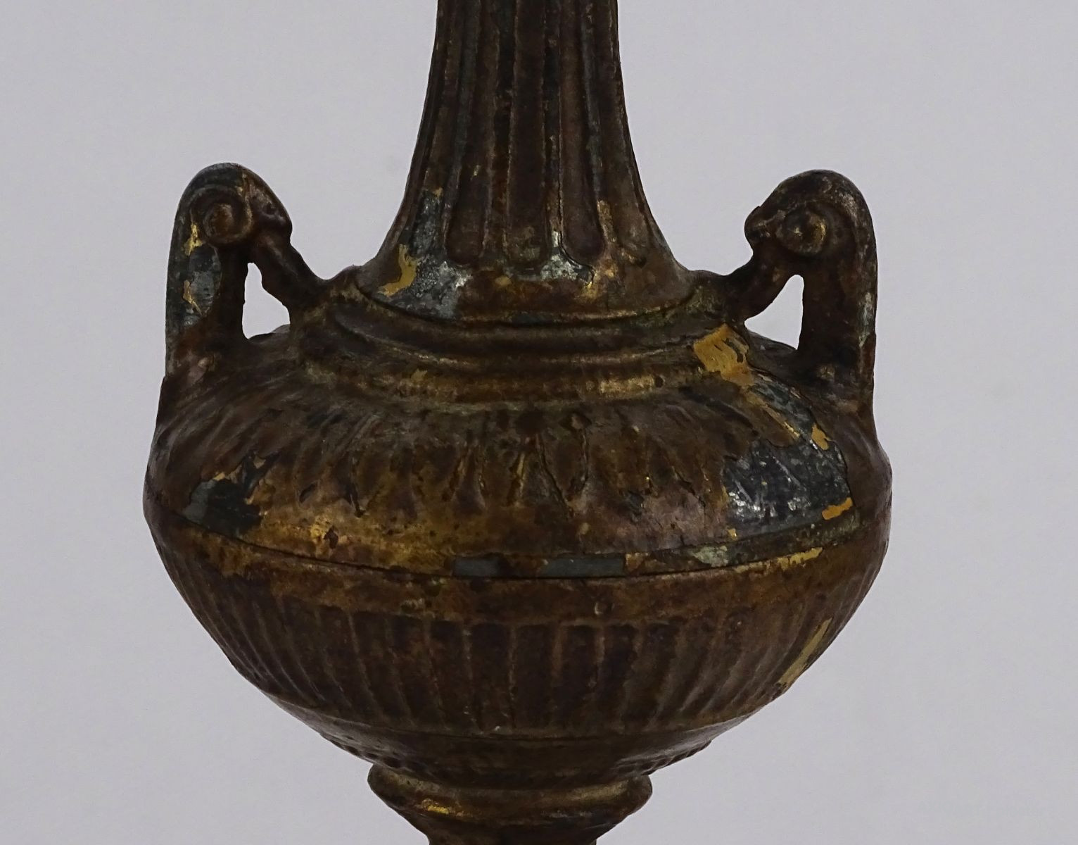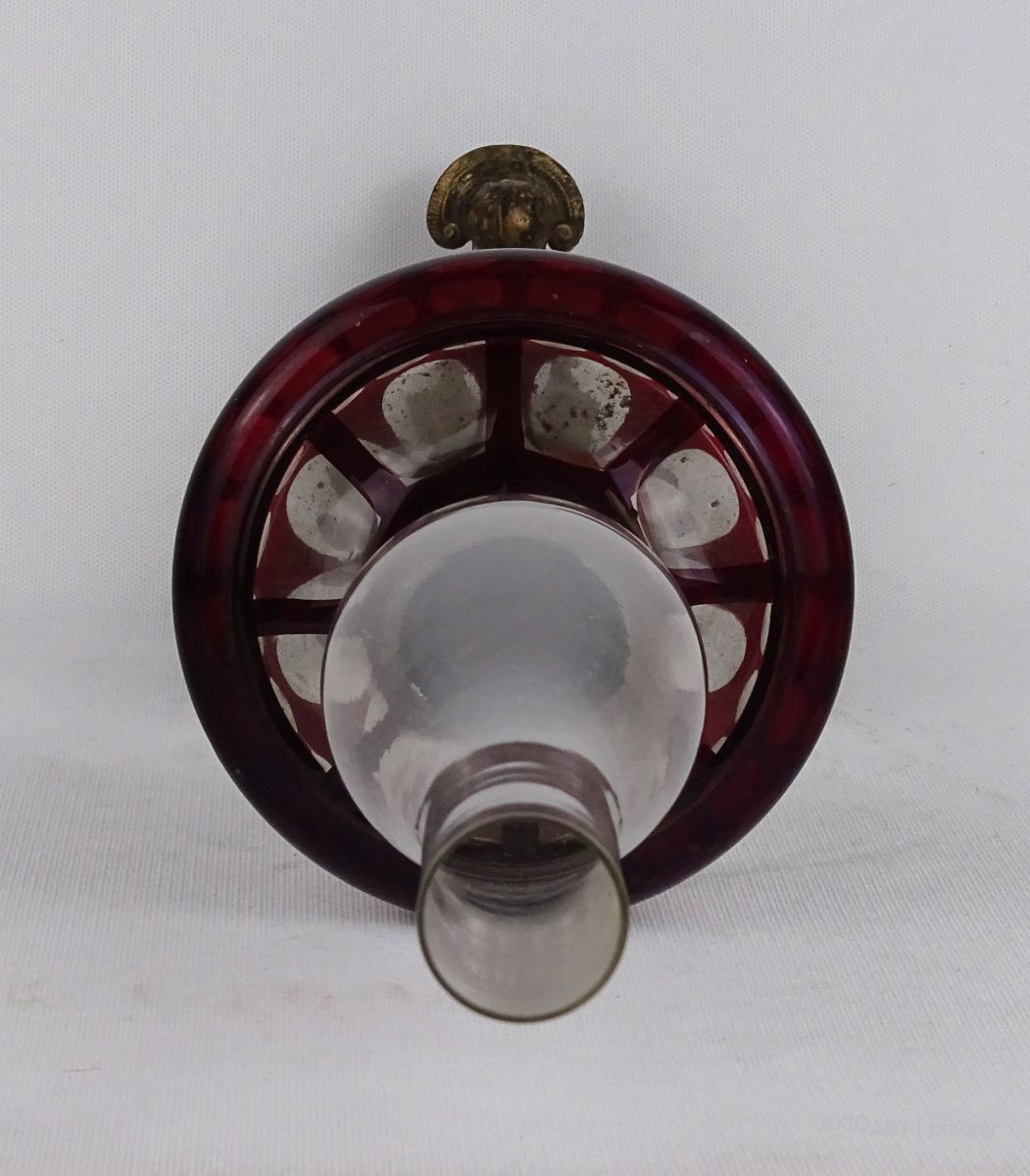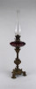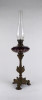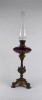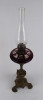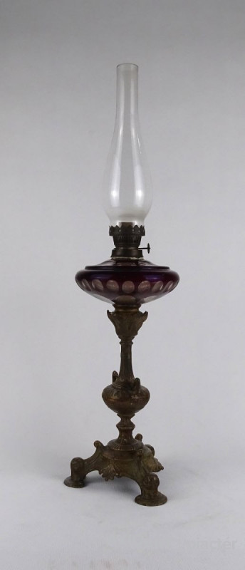 [1T046/Z029] Szép állapotú, antik aranyozott spiáter lábon álló petróleum lámpa üveg cilinderrel. A tartály csiszolt, színezett, rétegelt bíborpácolt üveg. Magasság: 60.5 cm Szélesség: 16.3 cm Súly: 1.875 kg