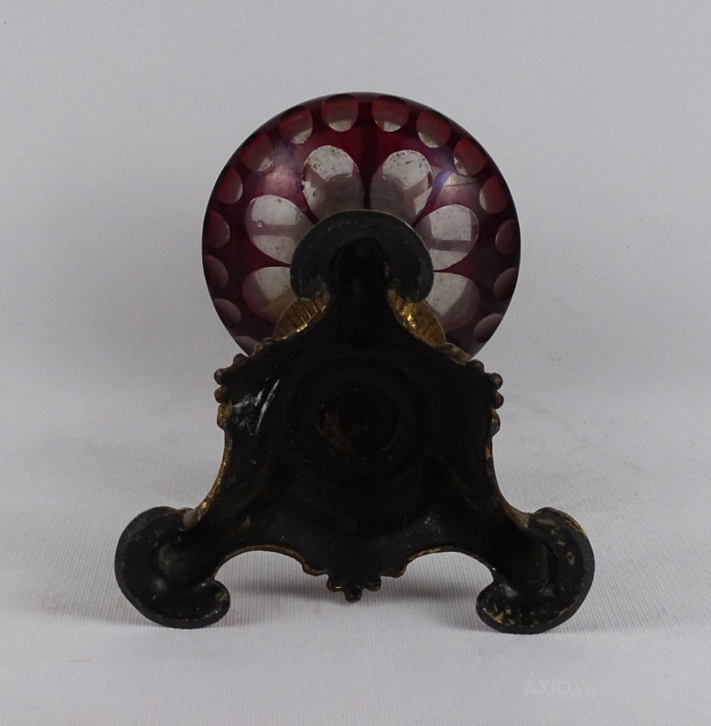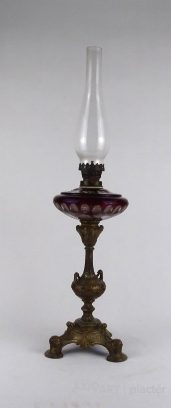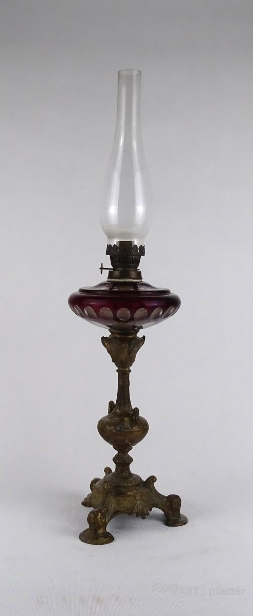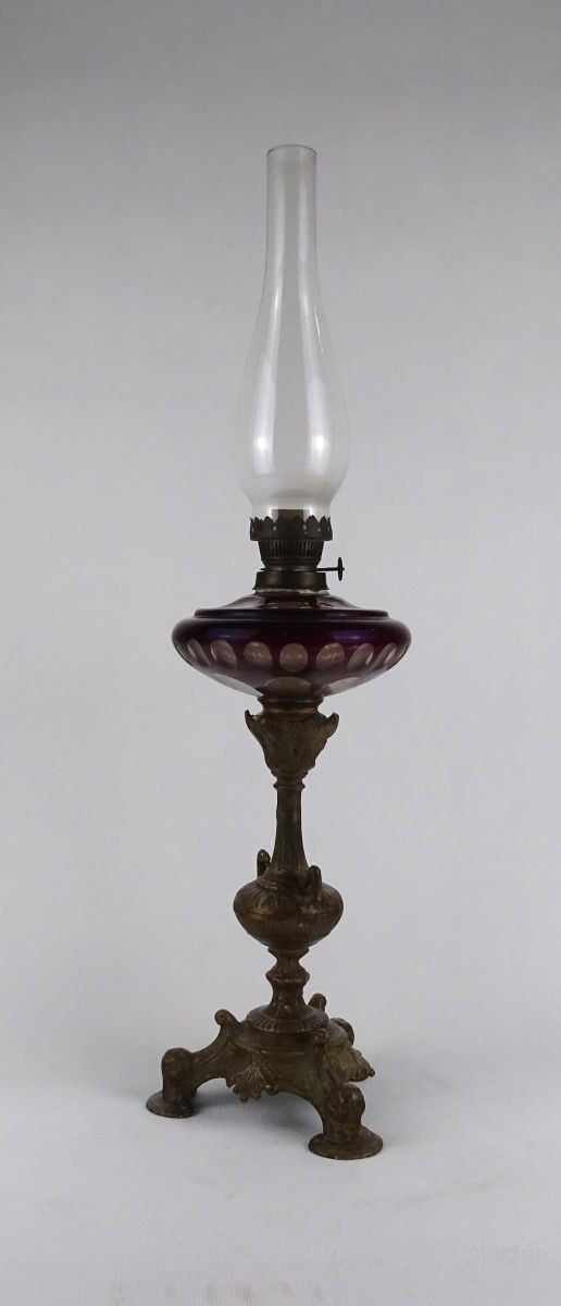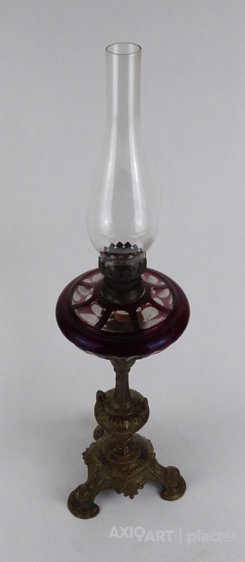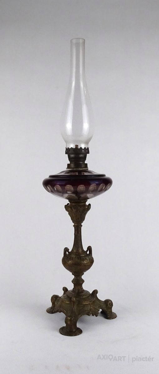 Szép állapotú, antik aranyozott spiáter lábon álló petróleum lámpa üveg cilinderrel. A tartály csiszolt, színezett, rétegelt bíborpácolt üveg.