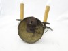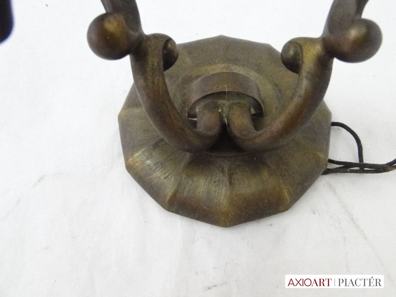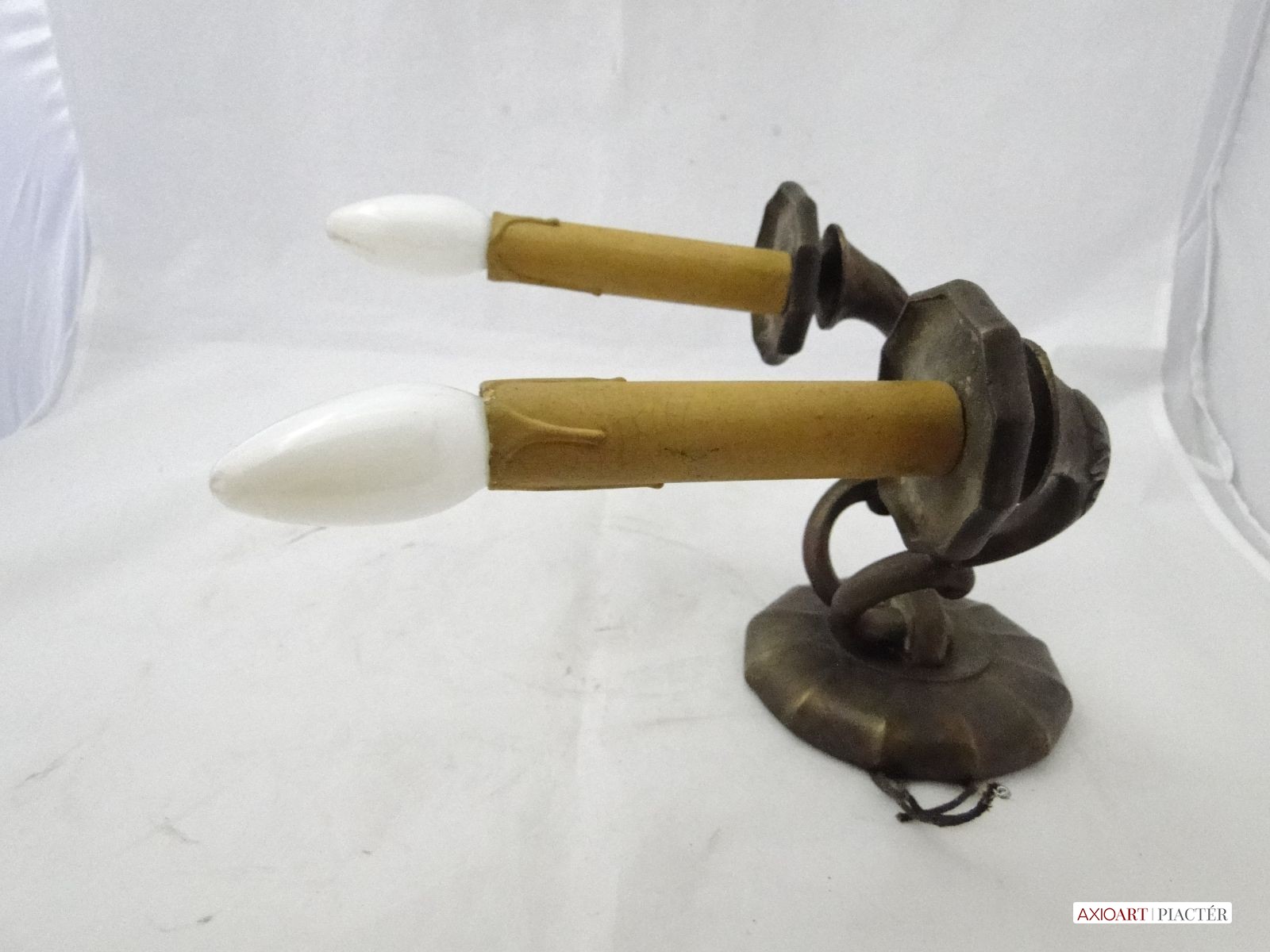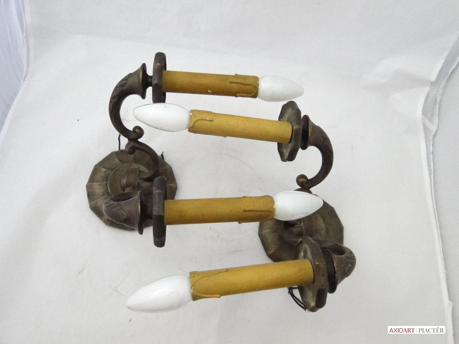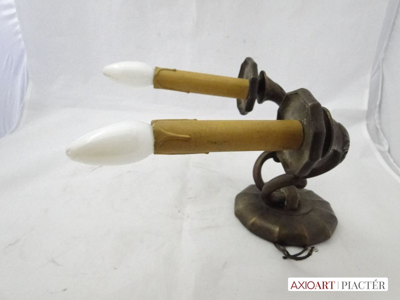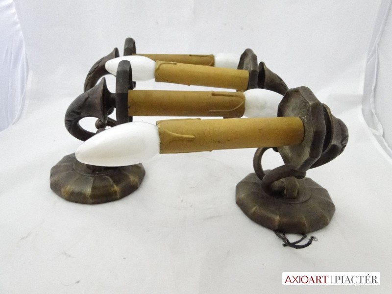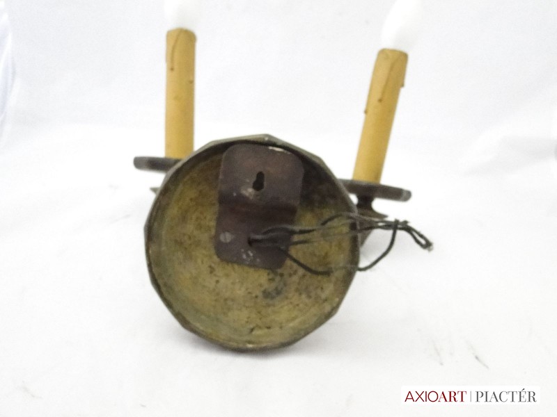 [6392/X040] Kettő darab teljesen egyforma, nagyméretű nehéz, réz dupla karos falikar. A karok papírmasé gyertyában végződnek, kisméretű izzó való bele. Jelenleg eredeti vászon szigetelésű vezetékkel működő állapotban van. Újra vezetékelése ajánlott. Magasság: 30 cm Szélesség: 25.5 cm Súly: 3.76 kg   A falhoz illeszkedő talp átmérője 14 cm. Faltól való elállása 26 cm. A feszített hártyabőr búra mérete 20,5 x 13 cm.