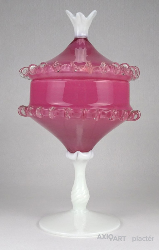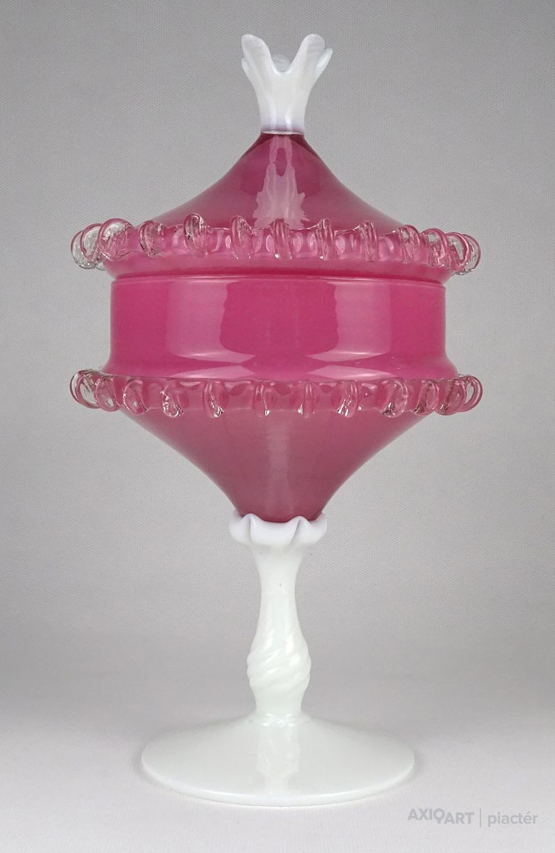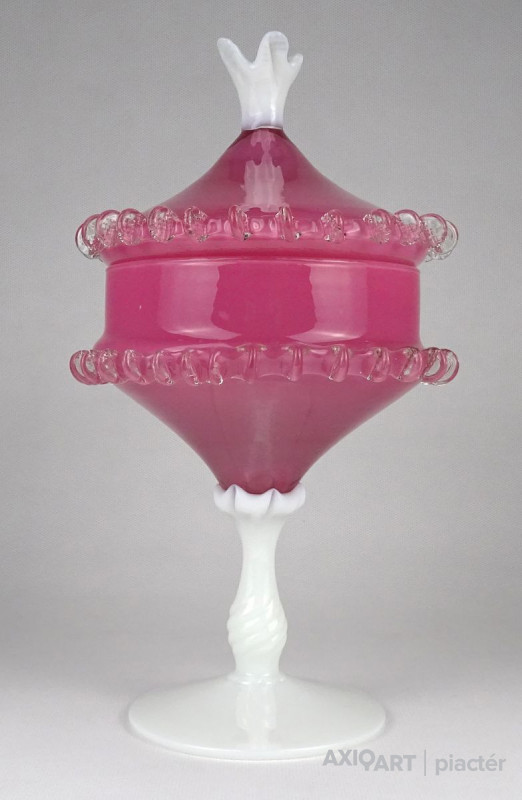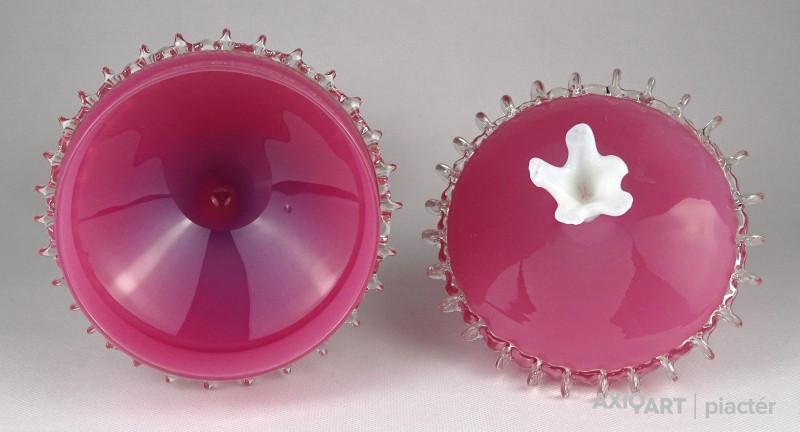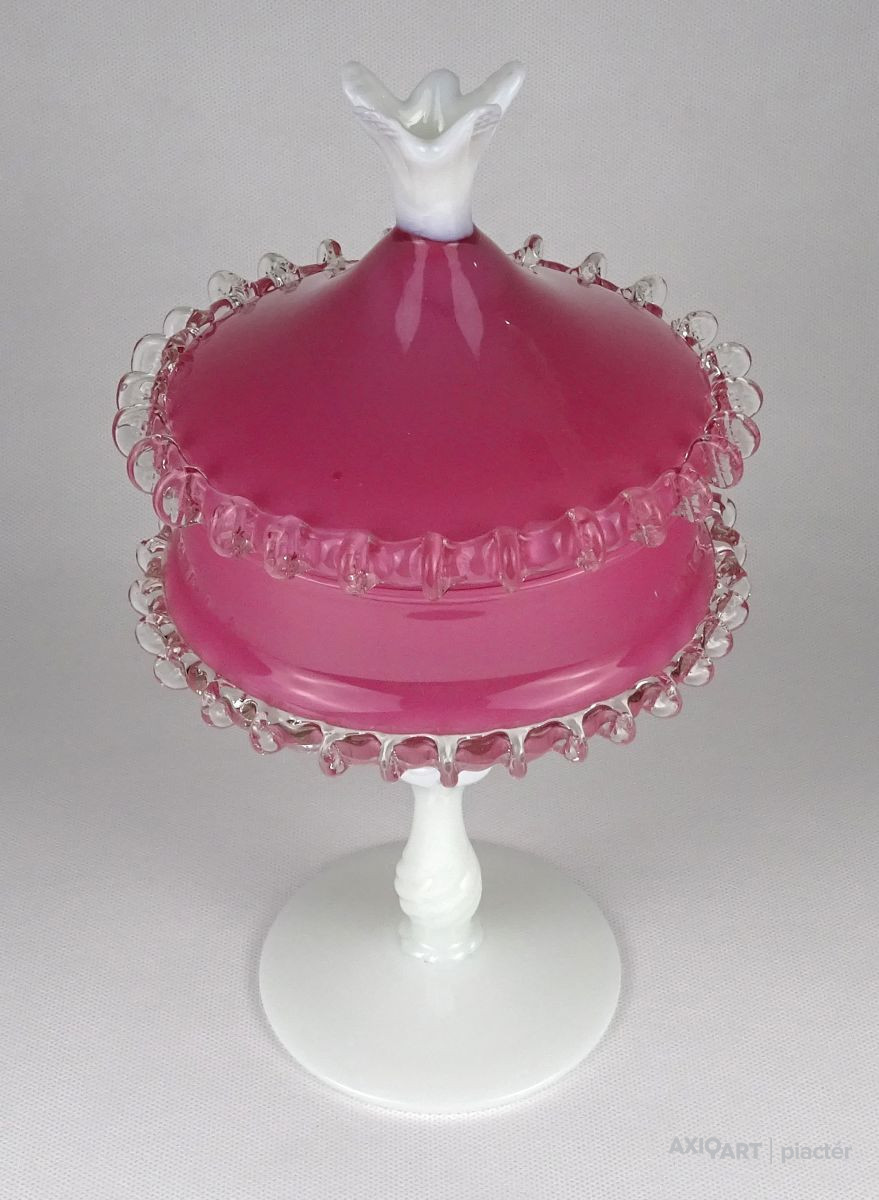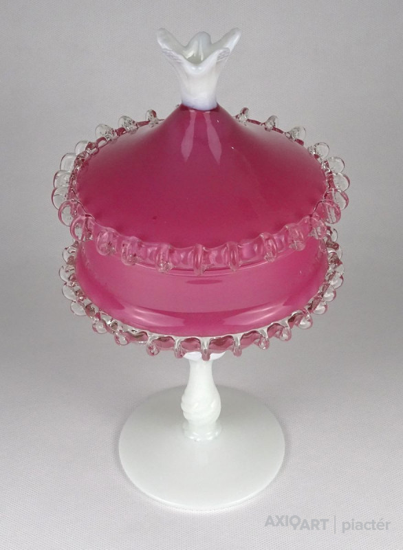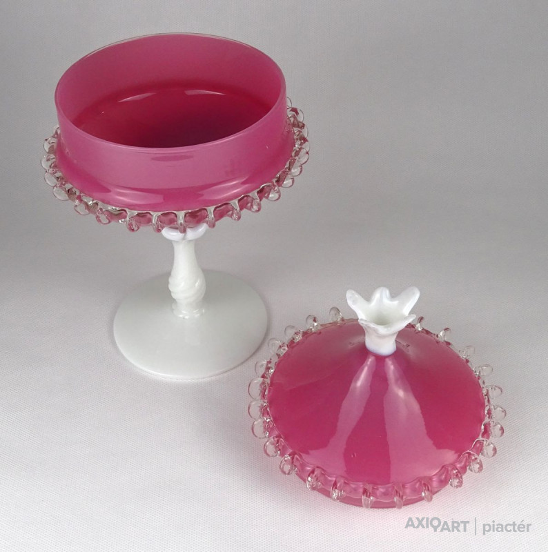 Antik nagy méretű fújt üveg bonbonier. Tejfehér talpon álló rózsaszín fedeles cukorka kínáló. Oldala körben fodros, csipkézett. Tetejét fehér virág díszíti.