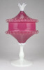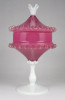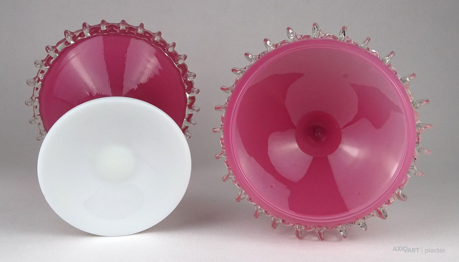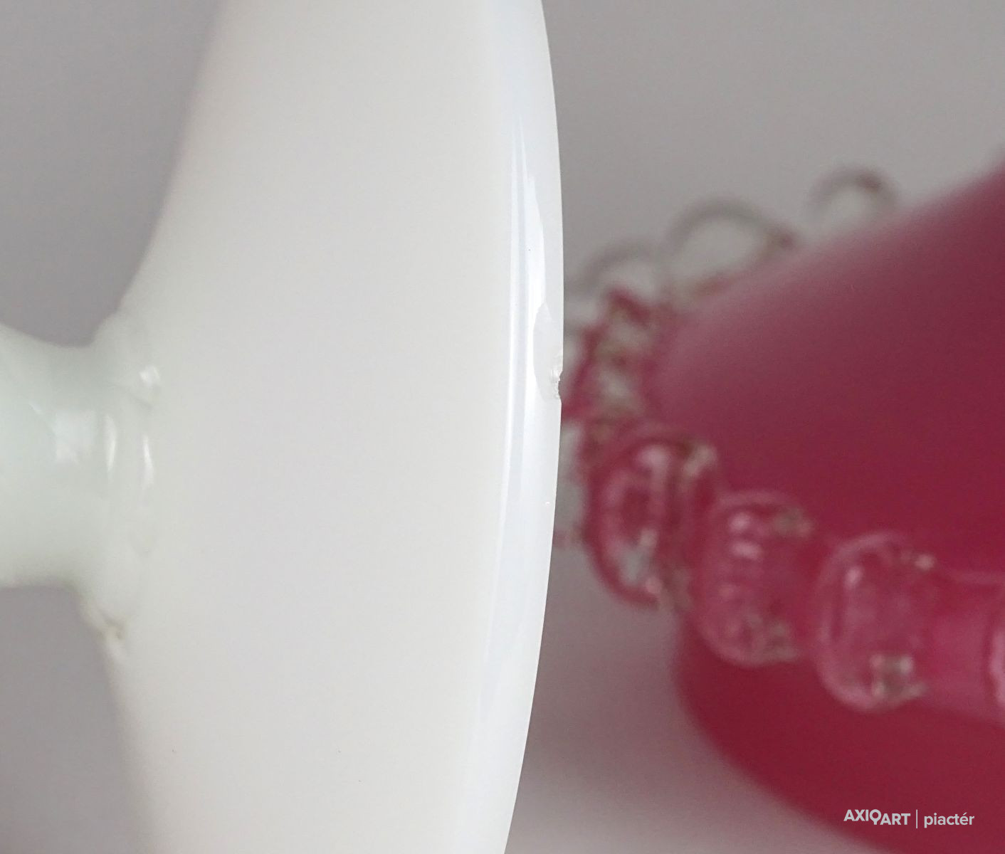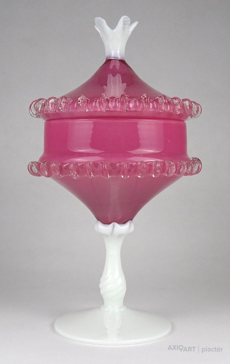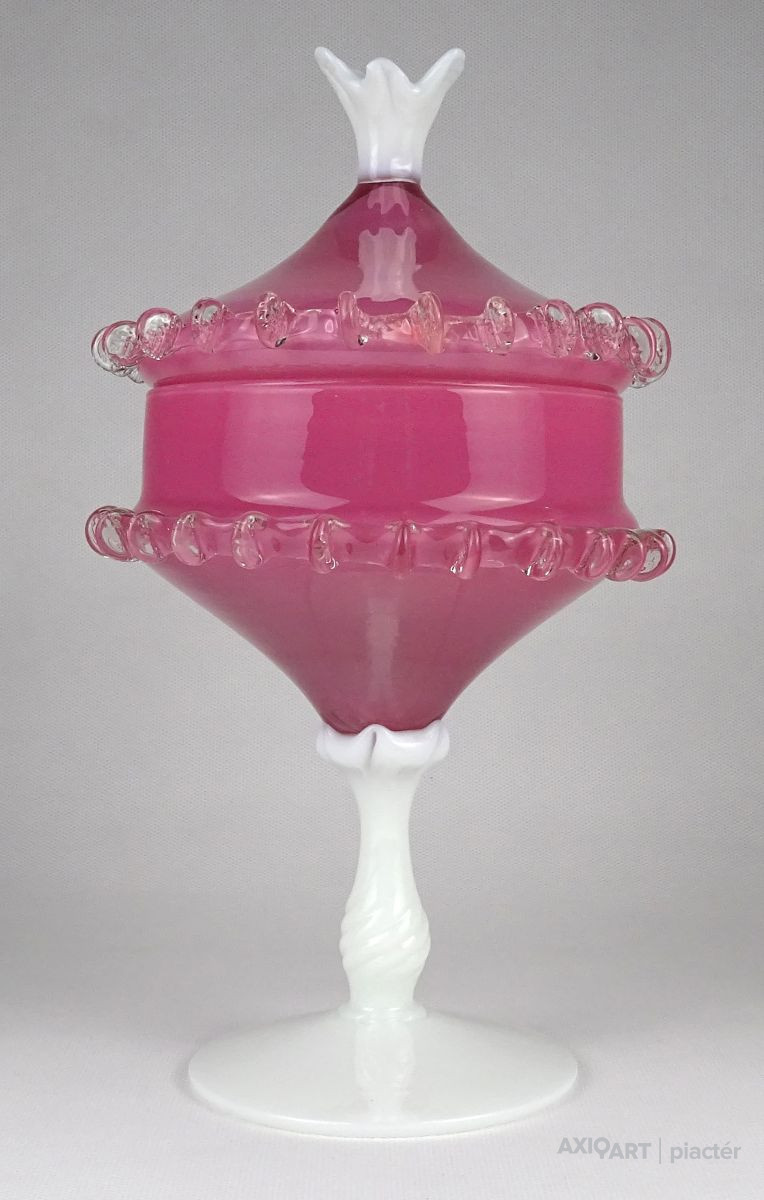 Antik nagy méretű fújt üveg bonbonier. Tejfehér talpon álló rózsaszín fedeles cukorka kínáló. Oldala körben fodros, csipkézett. Tetejét fehér virág díszíti.