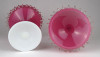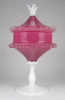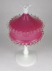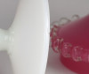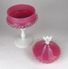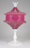[1M342/VTR-14] Antik nagy méretű fújt üveg bonbonier. Tejfehér talpon álló rózsaszín fedeles cukorka kínáló. Oldala körben fodros, csipkézett. Tetejét fehér virág díszíti. Magasság: 27 cm Szélesség: 15.5 cm Súly: 0.95 kg