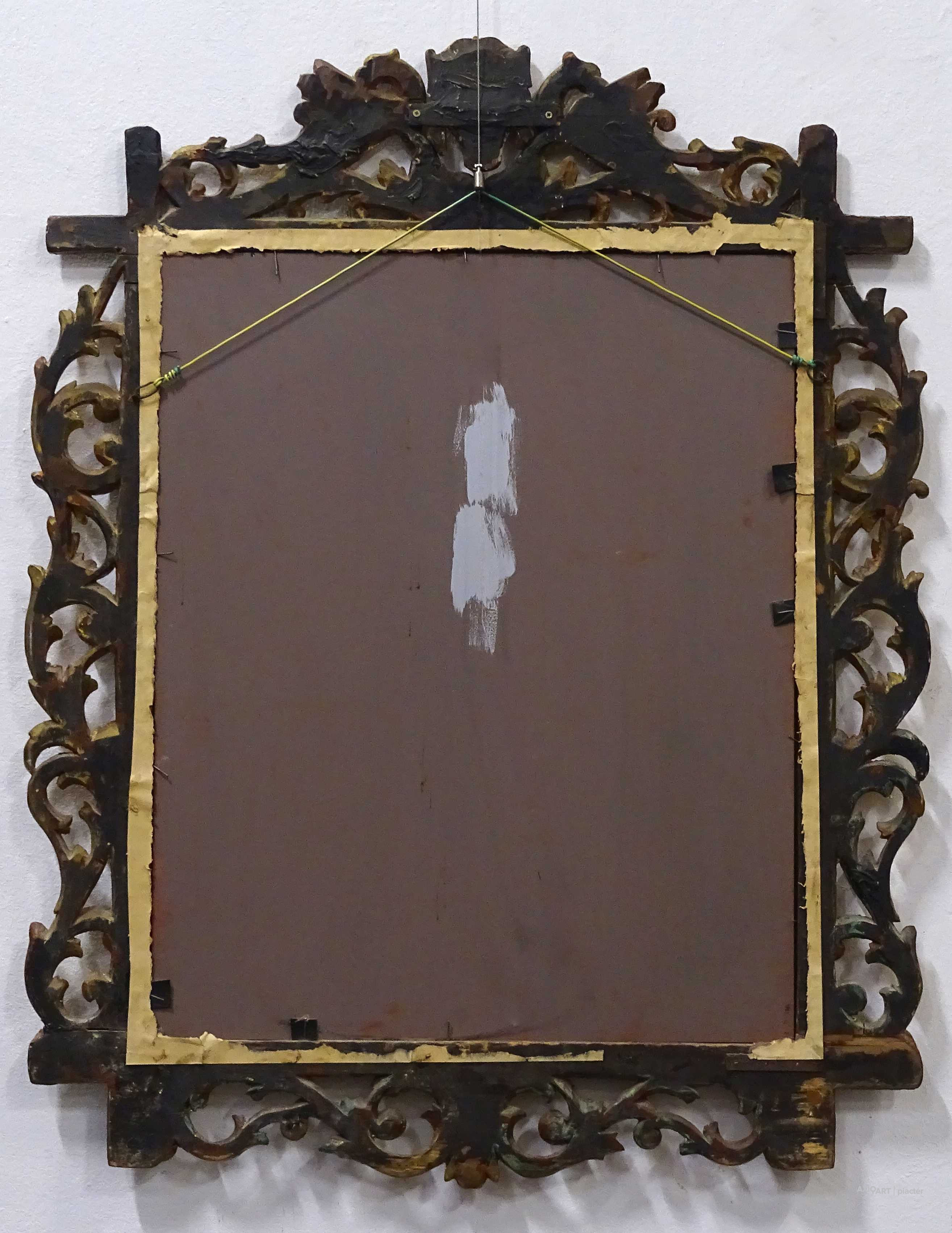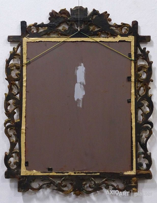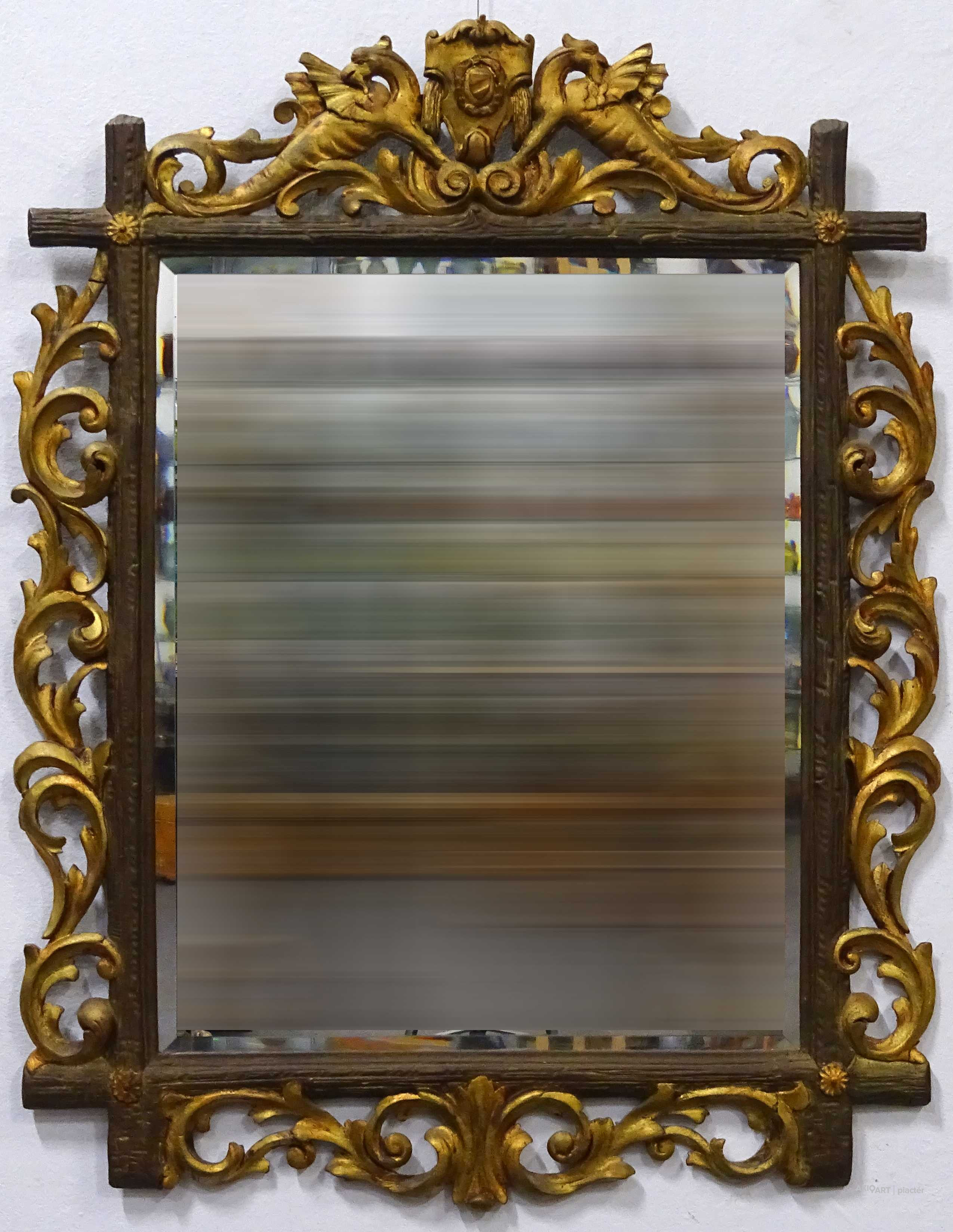 [1W608/UZ-N] Antik, nagy méretű, aranyozott, Florentin stílusú, faragott fakeretes, fazettázott tükör. Felső részén sárkányos címeres díszítés. Magasság: 120 cm Szélesség: 95 cm