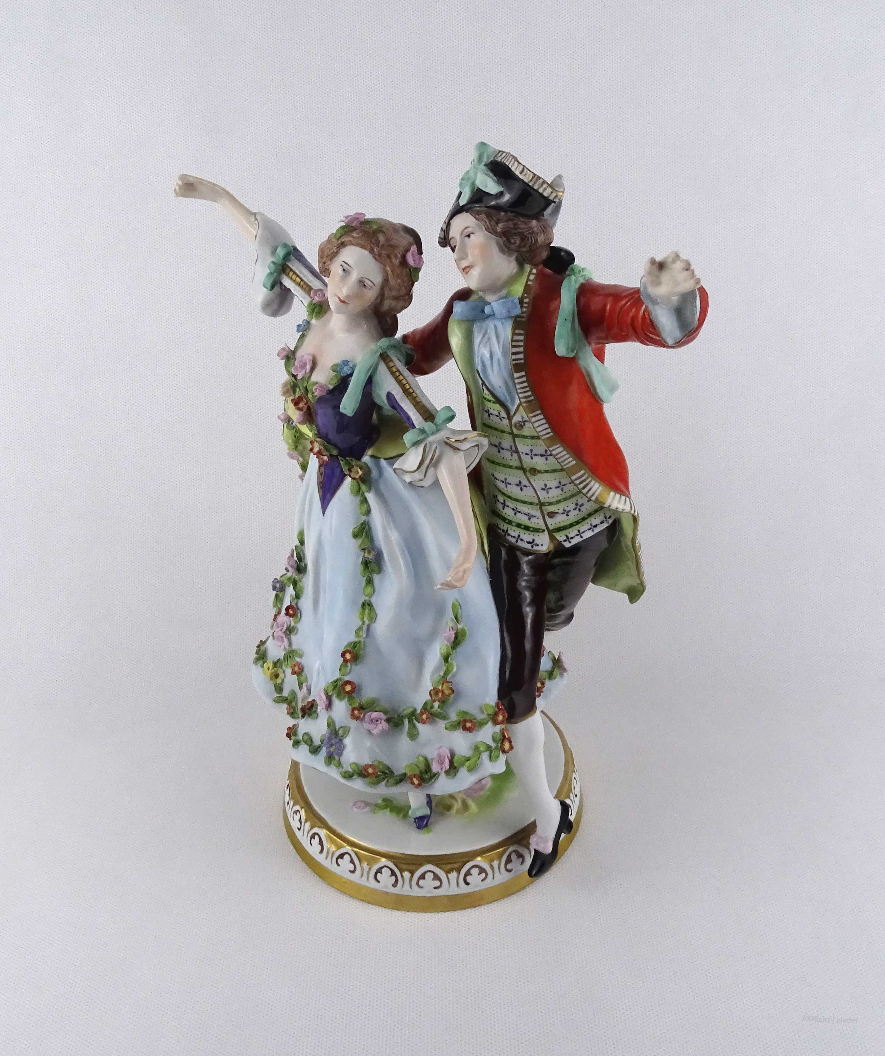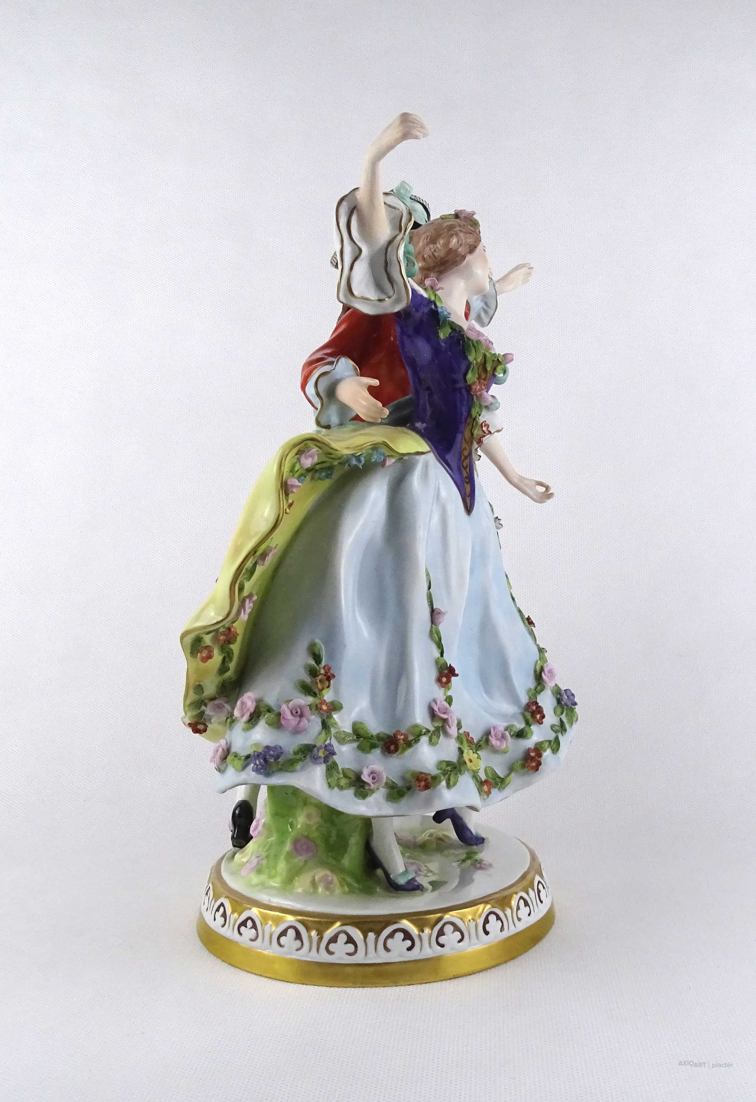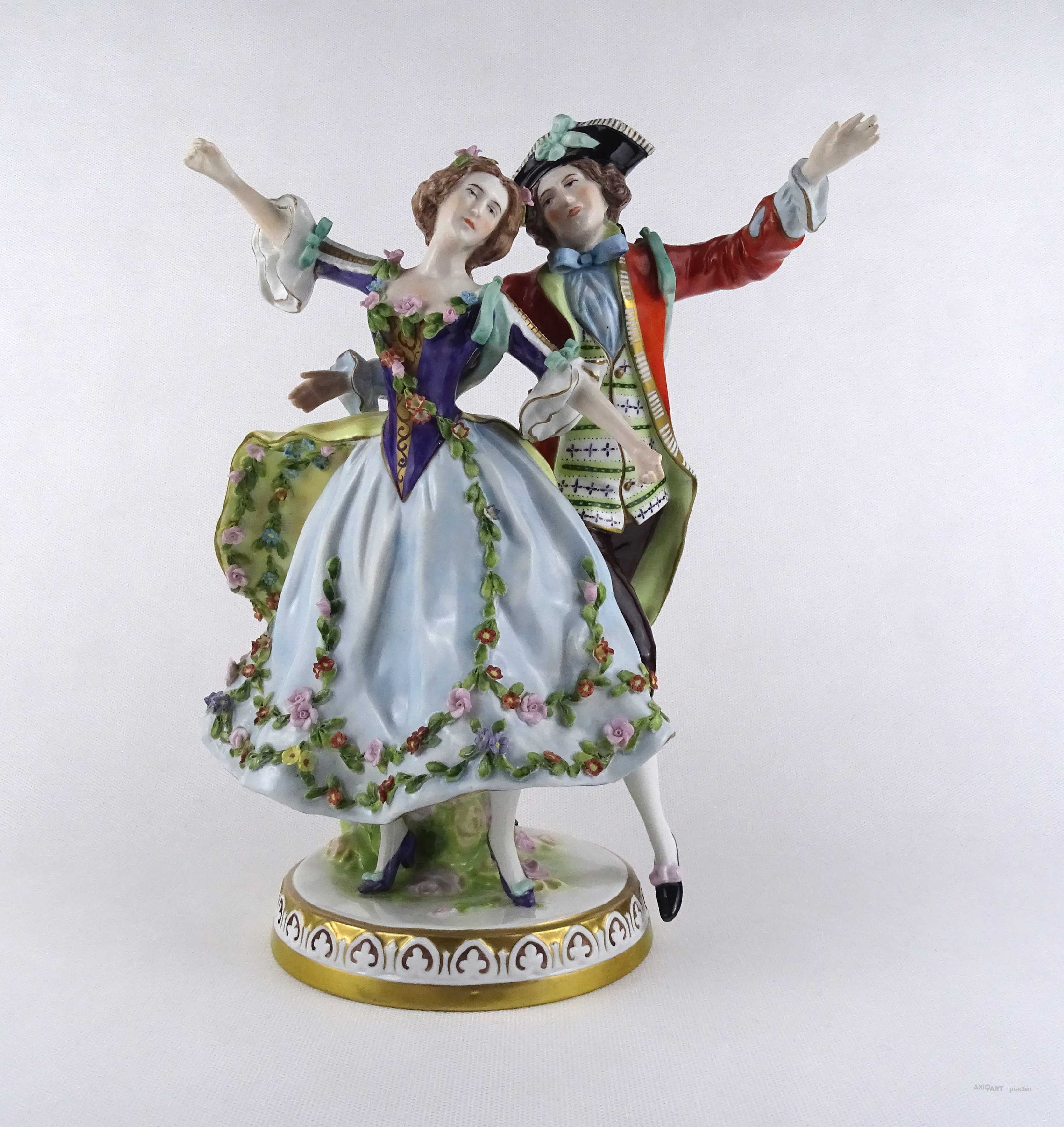 Antik, hibátlan állapotú, talapzaton álló porcelán figura, táncos pár a XX. század elejéről. A hölgy jobb, illettve a férfi bal kézfeje restaurátor által szakszerűen javított.
