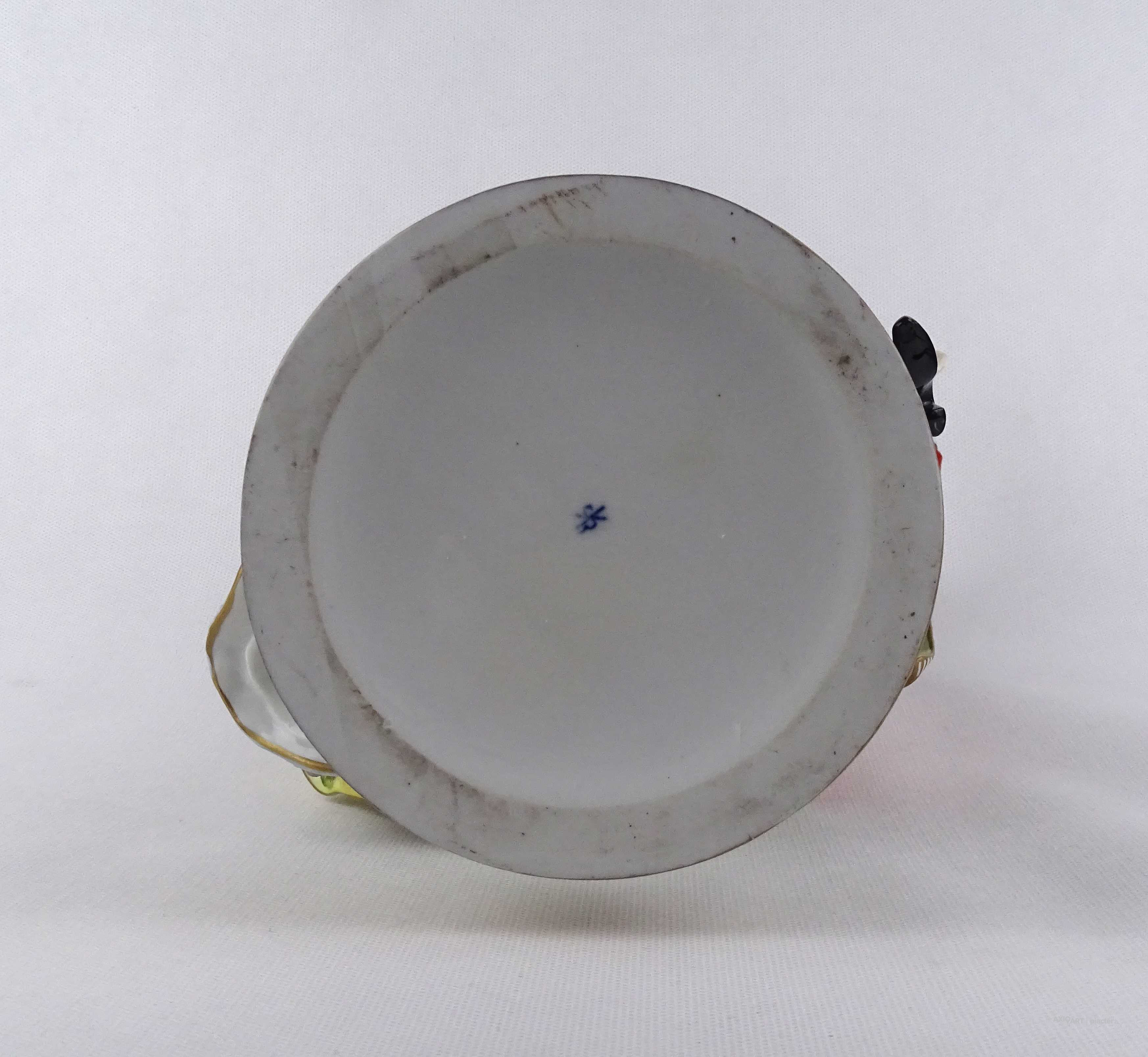 [1U925/X311/2] Antik, hibátlan állapotú, talapzaton álló porcelán figura, táncos pár a XX. század elejéről. A hölgy jobb, illettve a férfi bal kézfeje restaurátor által szakszerűen javított. Alján kék jelzés, lásd fotó. (Scheibe-Alsbach) Magasság: 28.5 cm Szélesség: 23 cm Hosszúság: 15 cm Súly: 1.98 kg