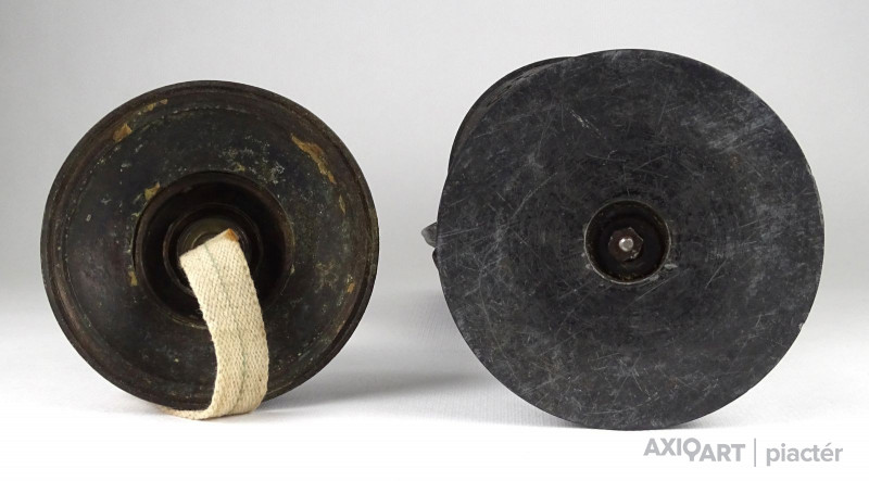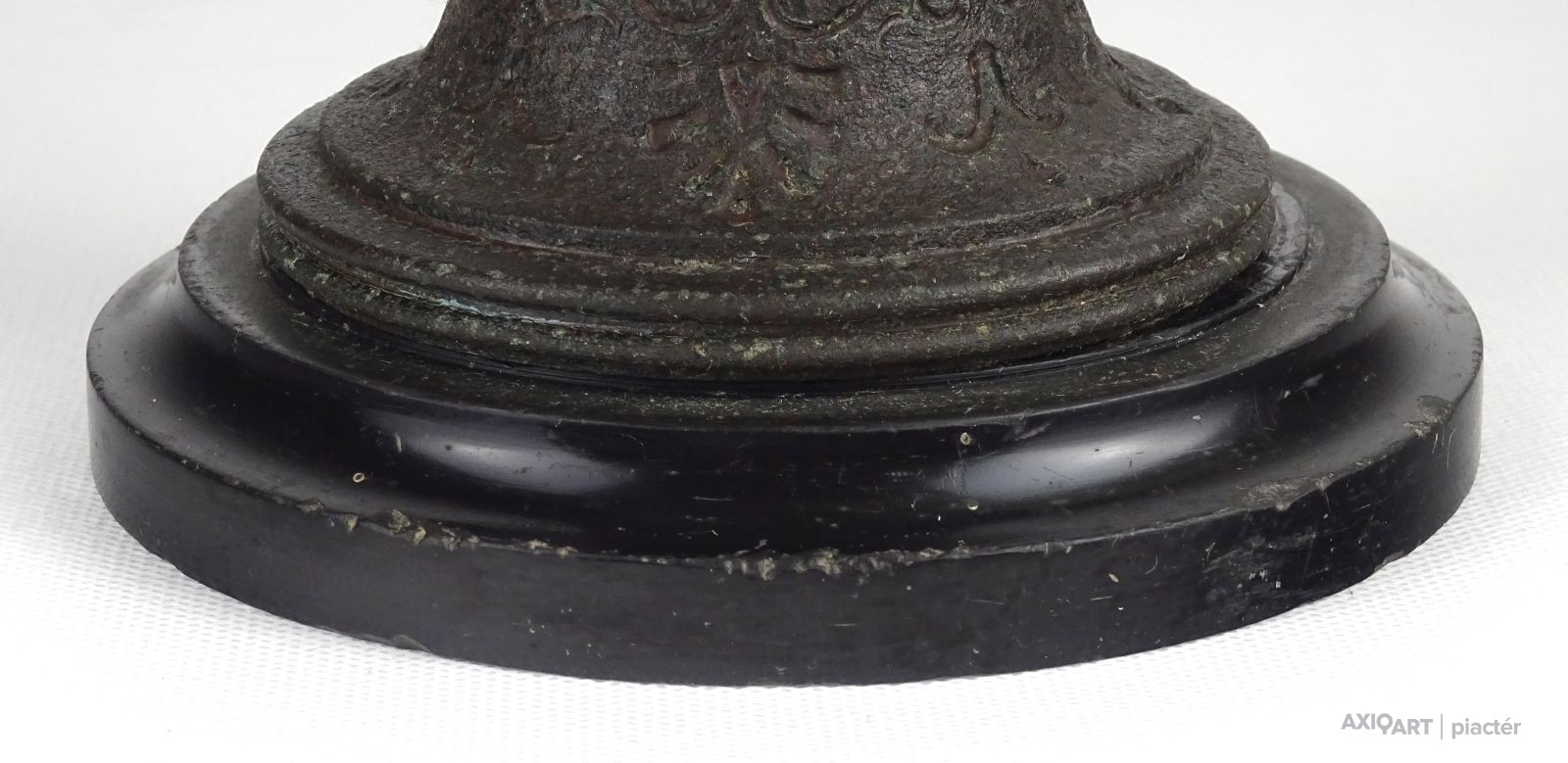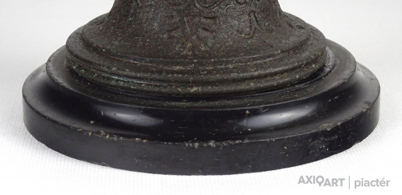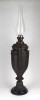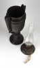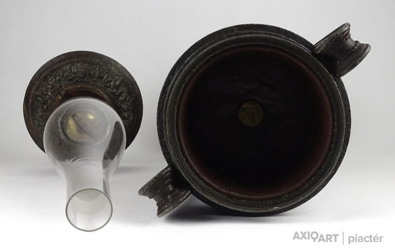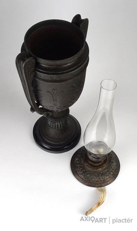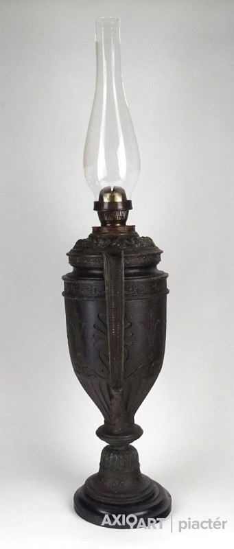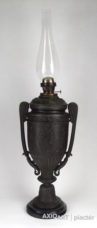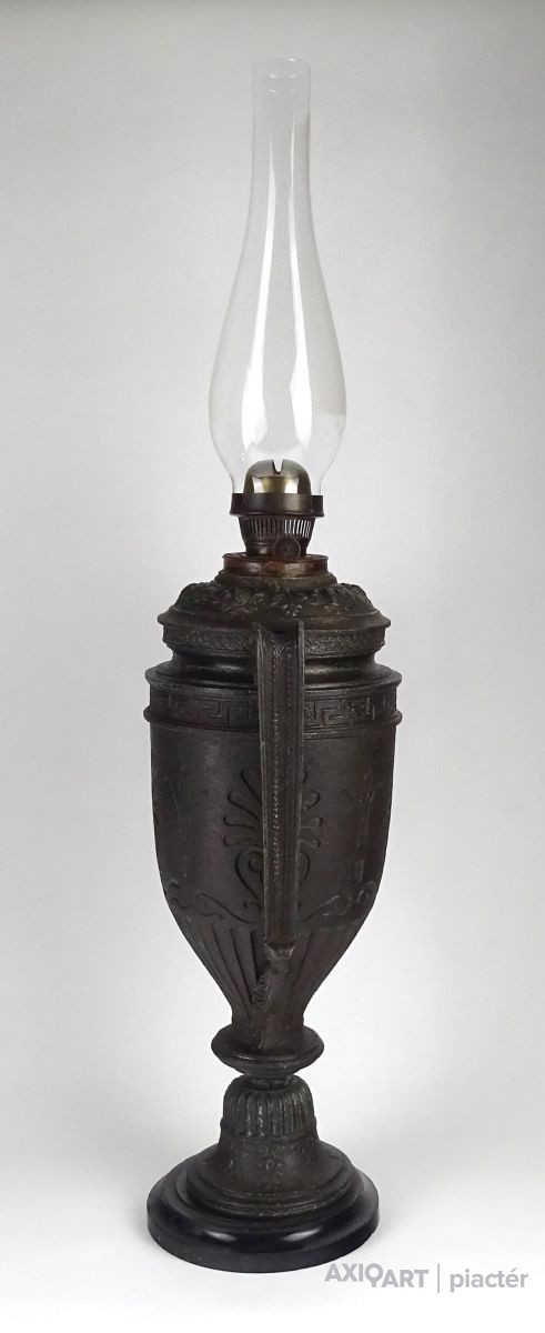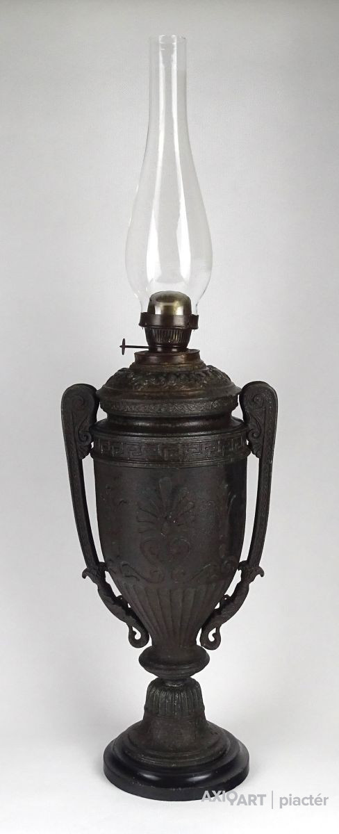 Antik öntöttvas testű nagy méretű, urnaváza alakú petróleumlámpa üveg cilinderrel. A levehető tető alatti üveg tartályrész hiányzik. A lámpa egy fekete márványtalapzaton áll.