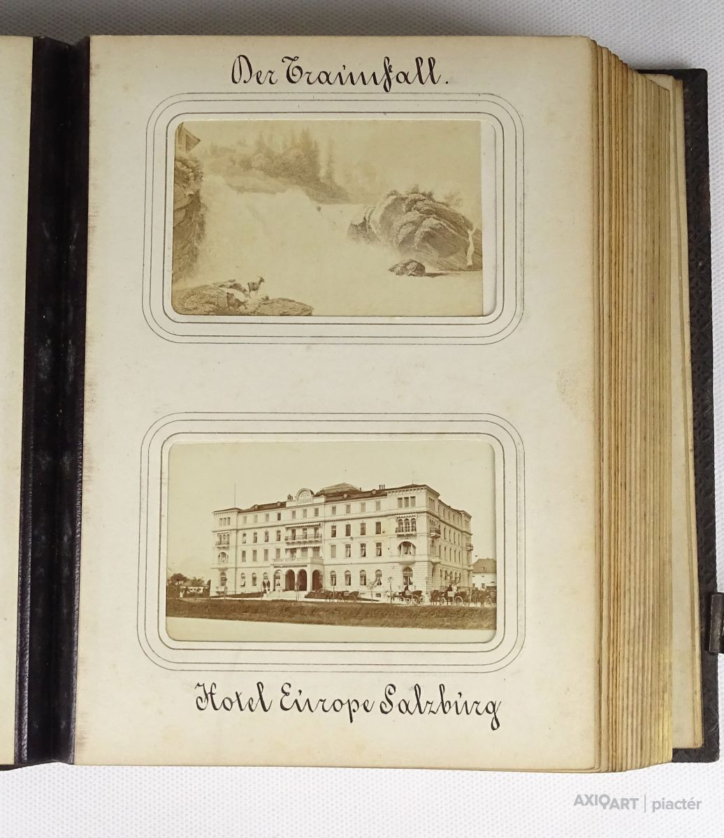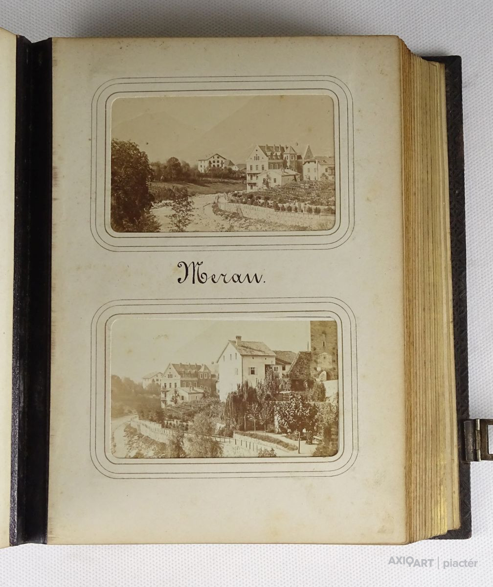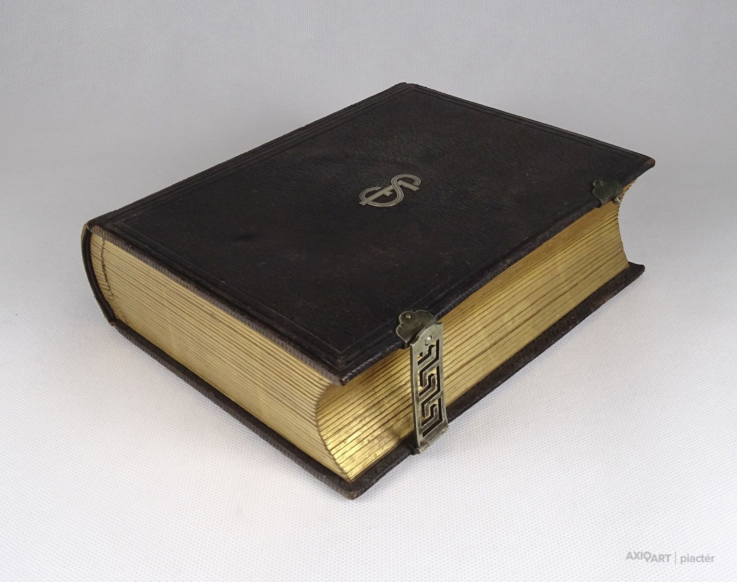 Antik vastag bőrkötéses fényképalbum. Tetején rátétes díszítés, SF vagy FS monogram, oldalán fém csat. Az albumban kemény táblás oldalak, ablakokkal. Összesen 25 lap, 50 oldal található benne, 100 darab fénykép fér el. A lapélek körben aranyozottak. Néhány lap sérült, ragasztható. A gerinc, kötés szép állapotú.