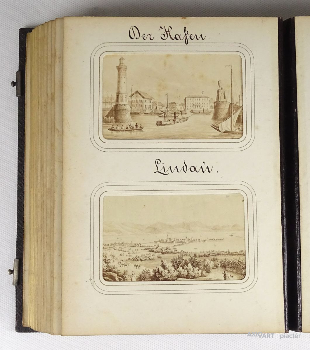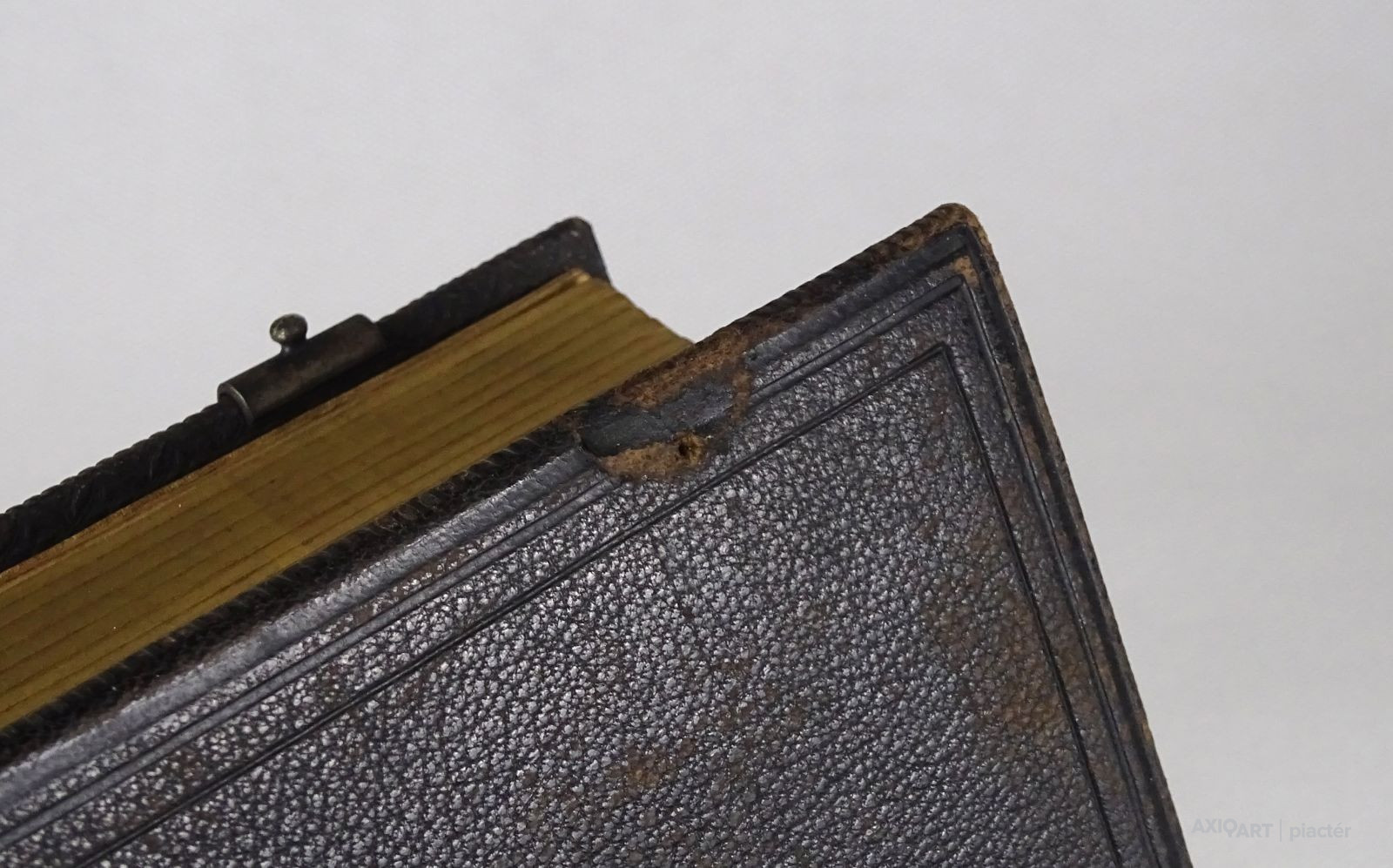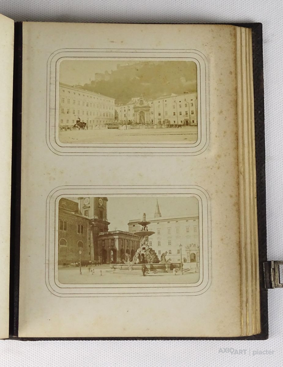 Antik vastag bőrkötéses fényképalbum. Tetején rátétes díszítés, SF vagy FS monogram, oldalán fém csat. Az albumban kemény táblás oldalak, ablakokkal. Összesen 25 lap, 50 oldal található benne, 100 darab fénykép fér el. A lapélek körben aranyozottak. Néhány lap sérült, ragasztható. A gerinc, kötés szép állapotú.