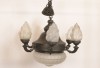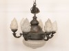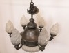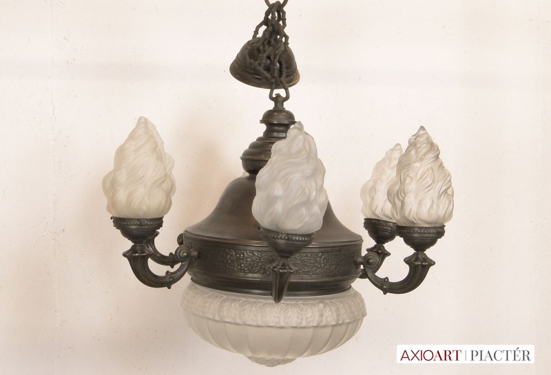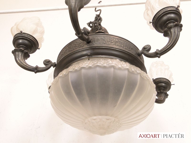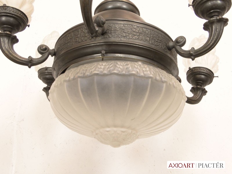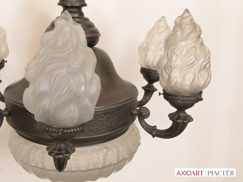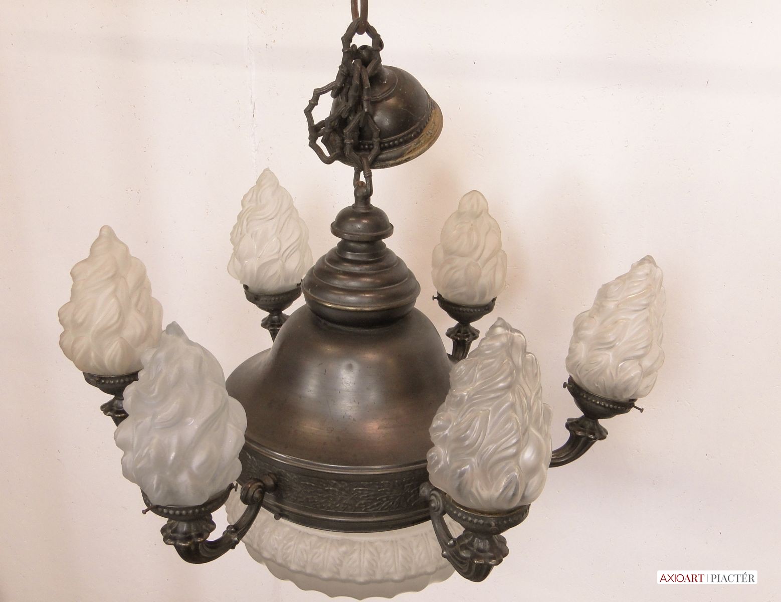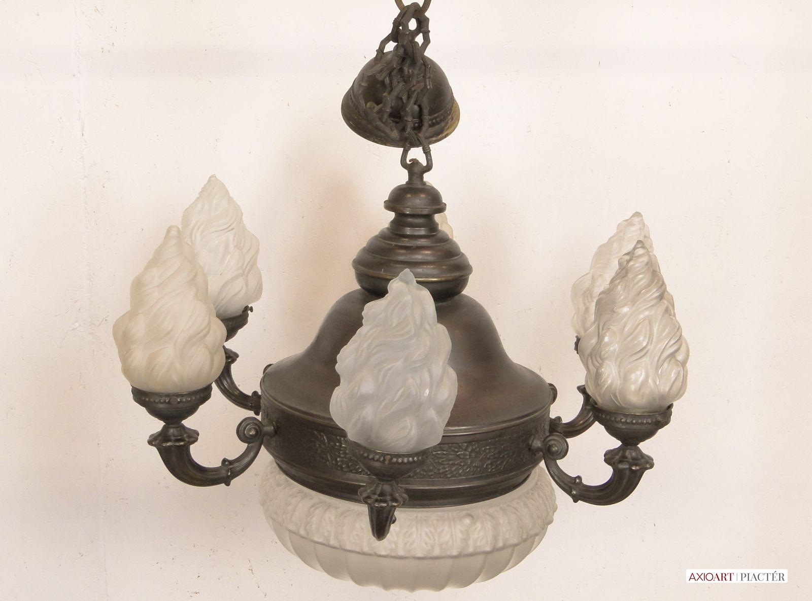6 karos, nagy bronz testű antik nagypolgári csillár, hibátlan, szép állapotú burákkal, alsó nagyburával.