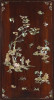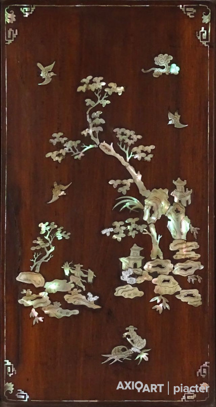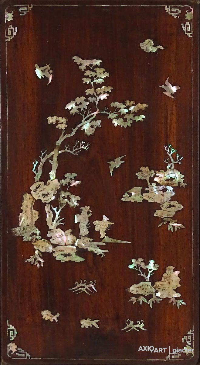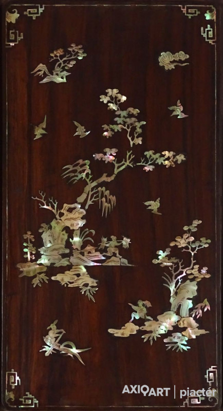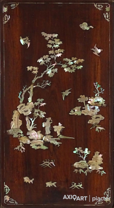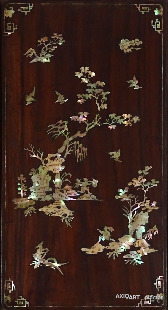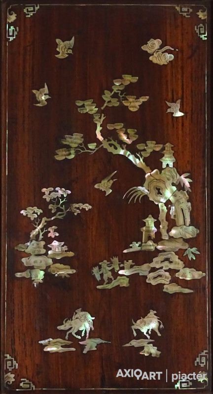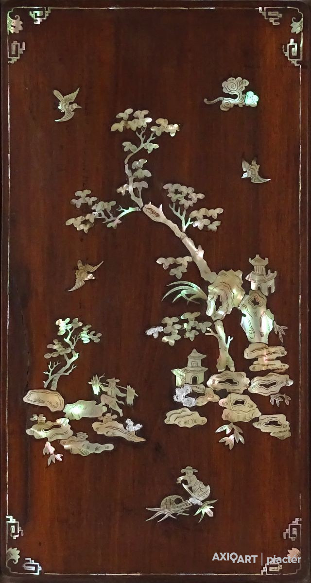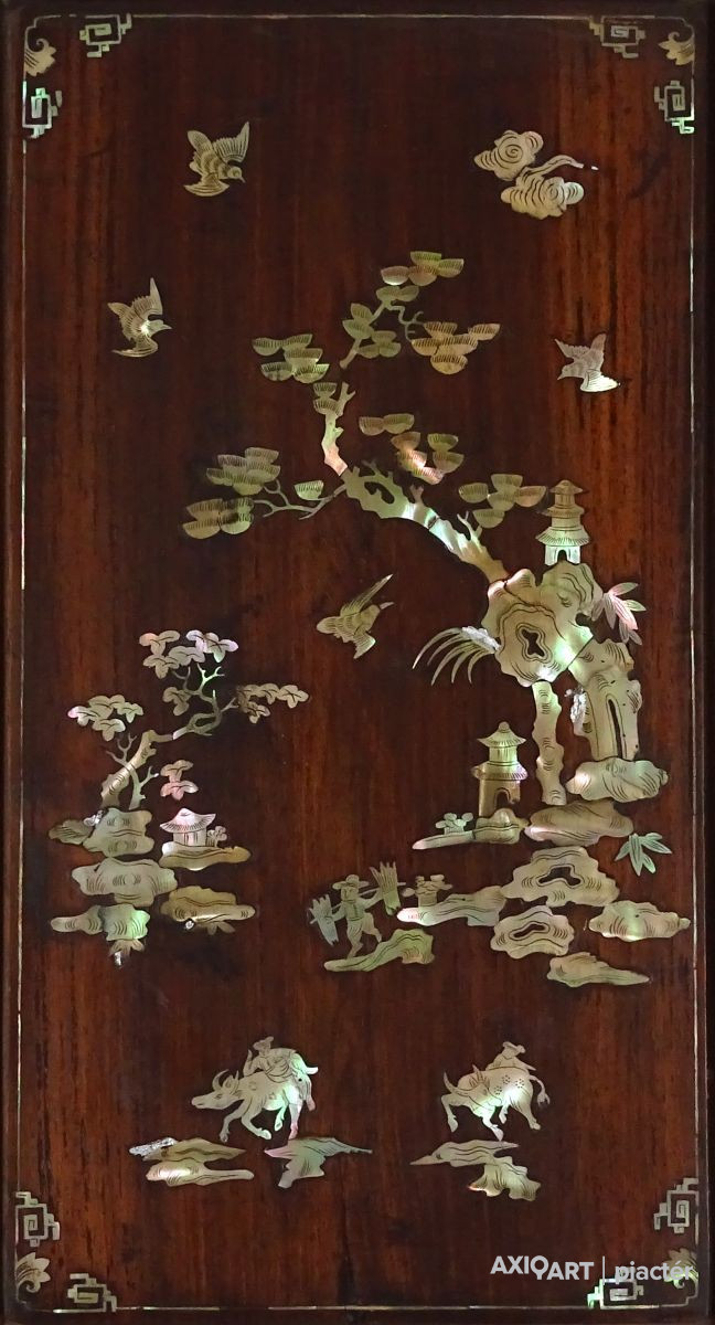 Antik négy tagból álló, tagonként két kazettás, keleti, csiszolt kagylóhéj, gyöngyház berakásos táblakép. A kazettákon életképek láthatóak. Csónakos, dolgozó, napernyős, bikával dolgozó alakok, madarak láthatók. Néhol a csiszolatok hiányoznak, kiestek, ezüst színnel pótoltak. A tagok egyenként falra akasztási lehetőséggel rendelkeznek.