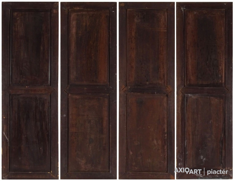 [1E830/X162] Antik négy tagból álló, tagonként két kazettás, keleti, csiszolt kagylóhéj, gyöngyház berakásos táblakép. A kazettákon életképek láthatóak. Csónakos, dolgozó, napernyős, bikával dolgozó alakok, madarak láthatók. Néhol a csiszolatok hiányoznak, kiestek, ezüst színnel pótoltak. A tagok egyenként falra akasztási lehetőséggel rendelkeznek. Magasság: 81 cm Szélesség: 26 cm Súly: 7.15 kg