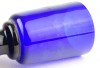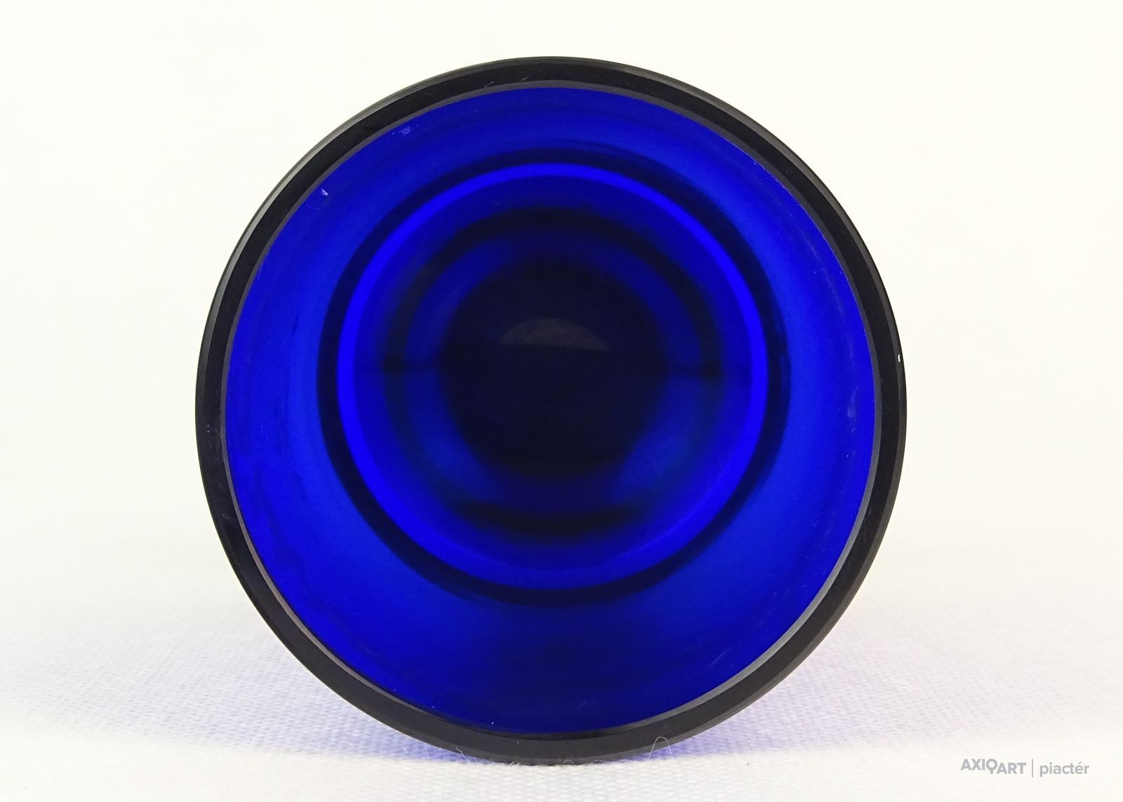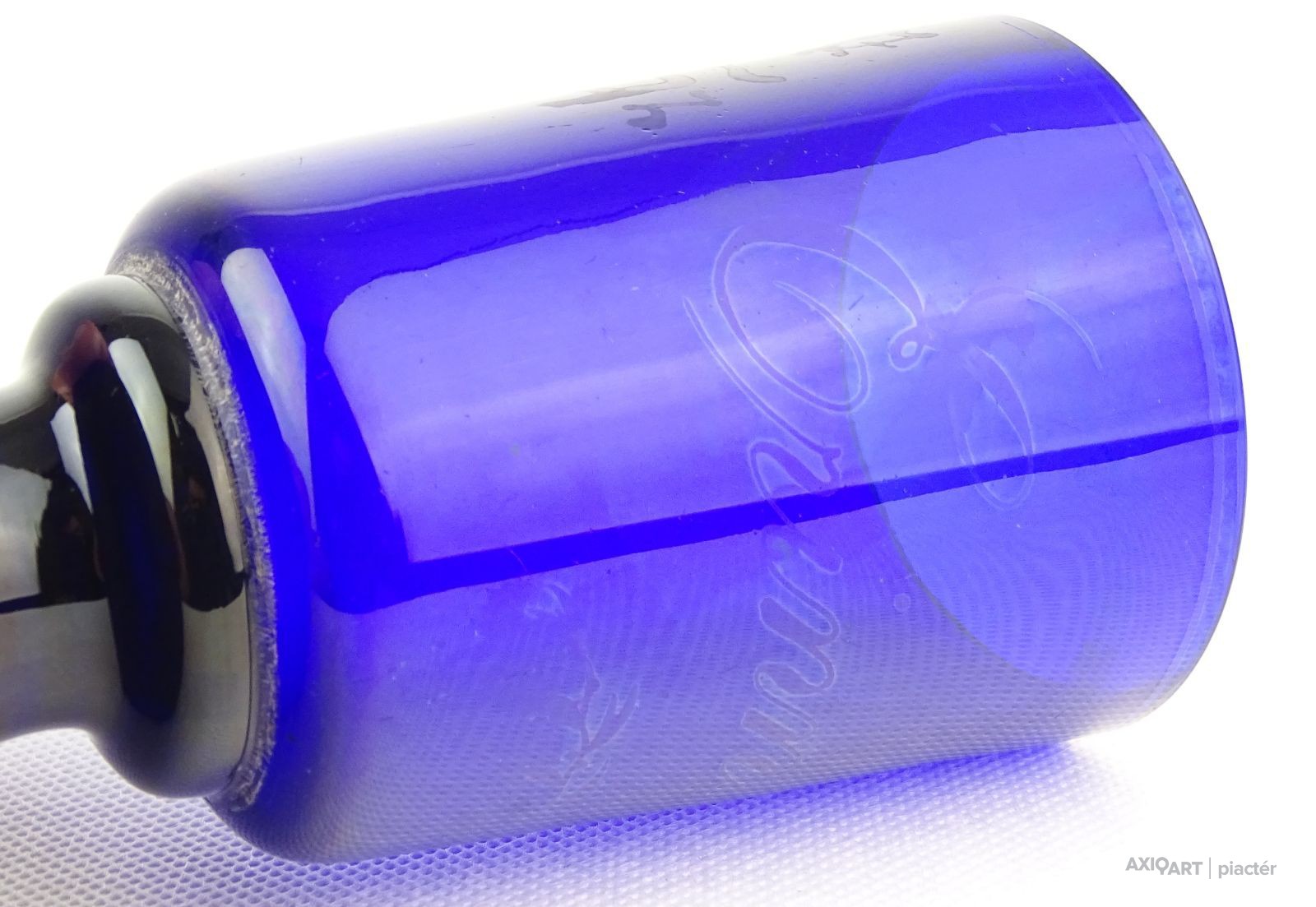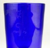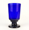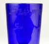 Régi, kobalt kék színű, vastag falú, talpas üveg pohár, halvány feliratokkal az 1800-as évekből.