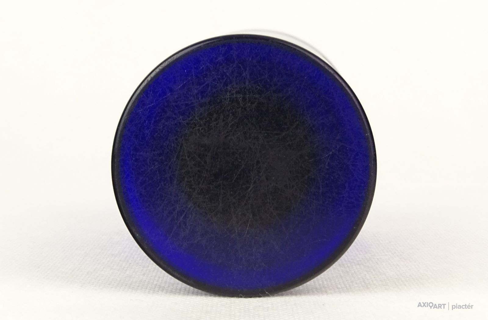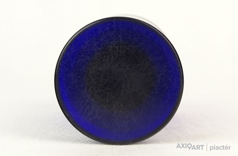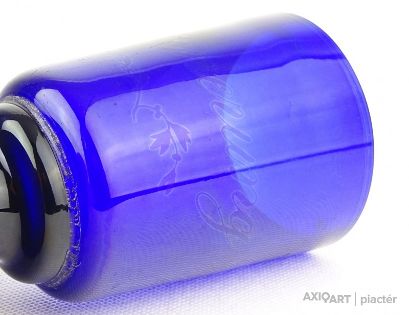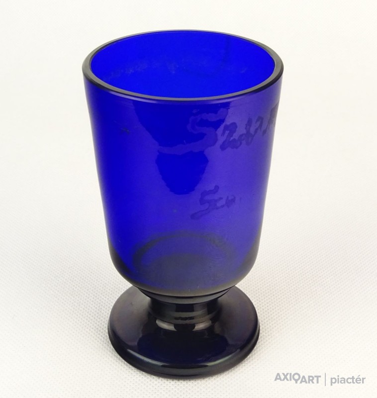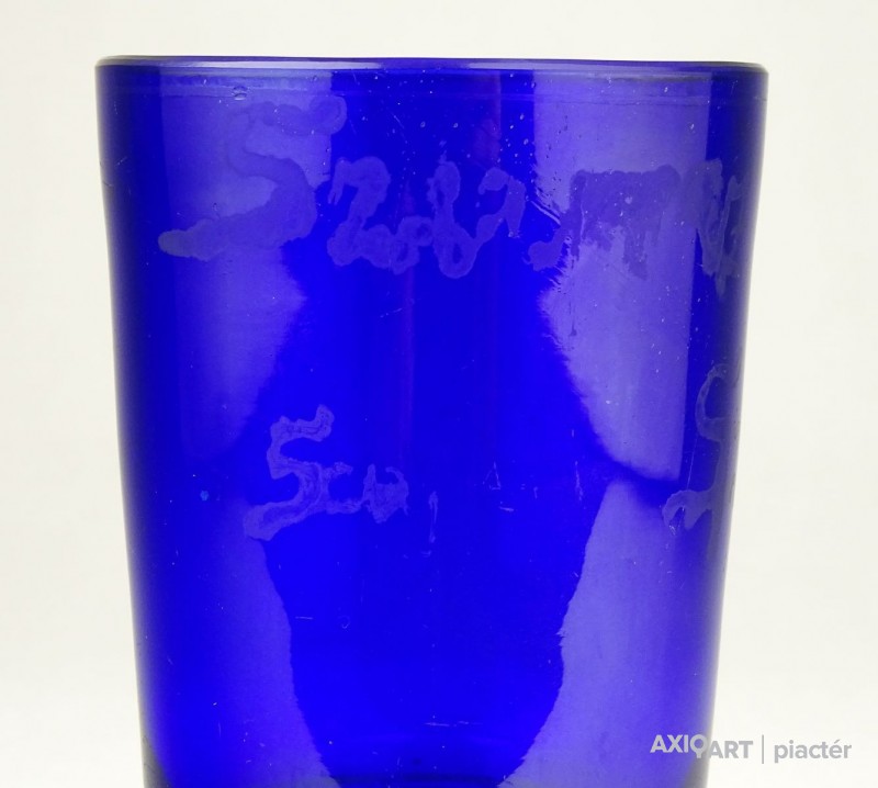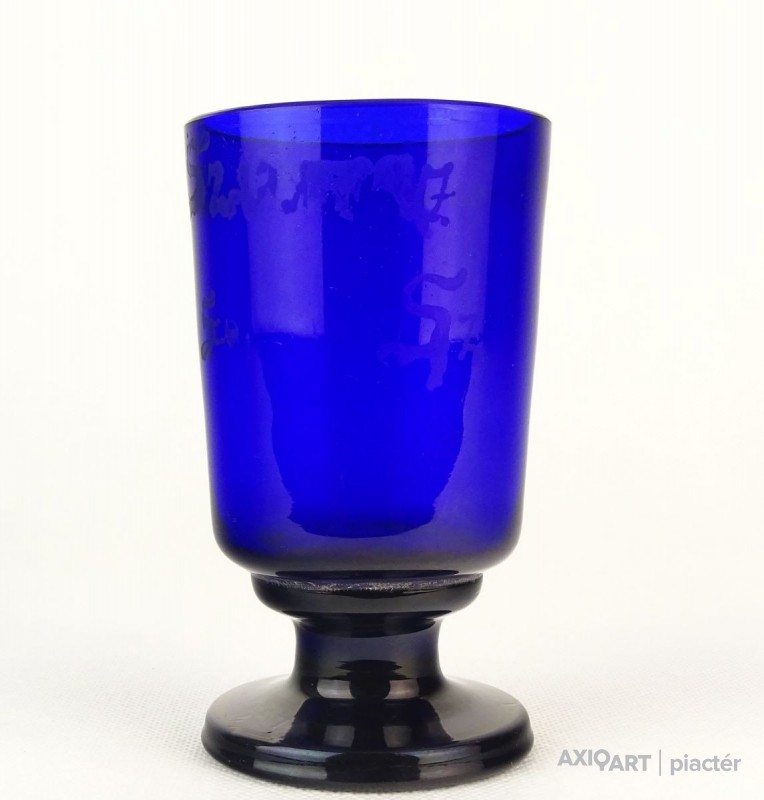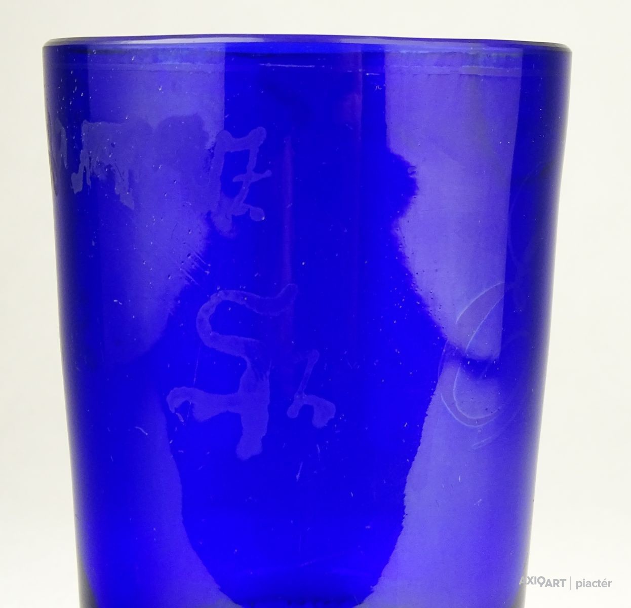 [0P035/VTR-14] Régi, kobalt kék színű, vastag falú, talpas üveg pohár, halvány feliratokkal az 1800-as évekből. Egyik oldalán felirat: ERINNERUNG (Emlék) Másik oldalon nehezen olvasható felirat, lásd fotó. Magasság: 13.2 cm Szélesség: 7.7 cm Súly: 0.33 kg