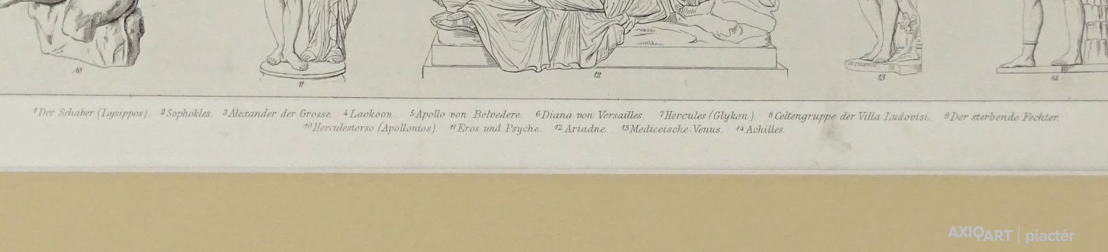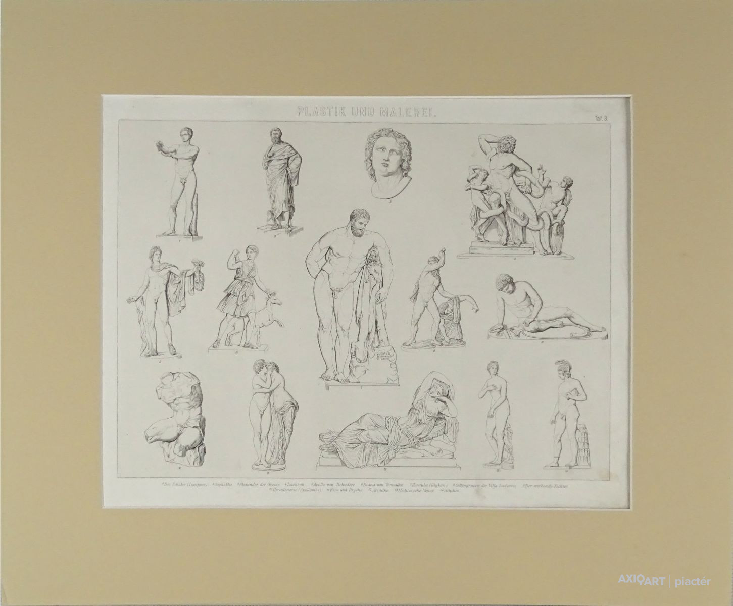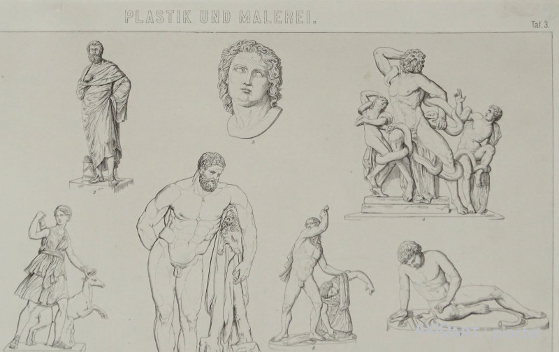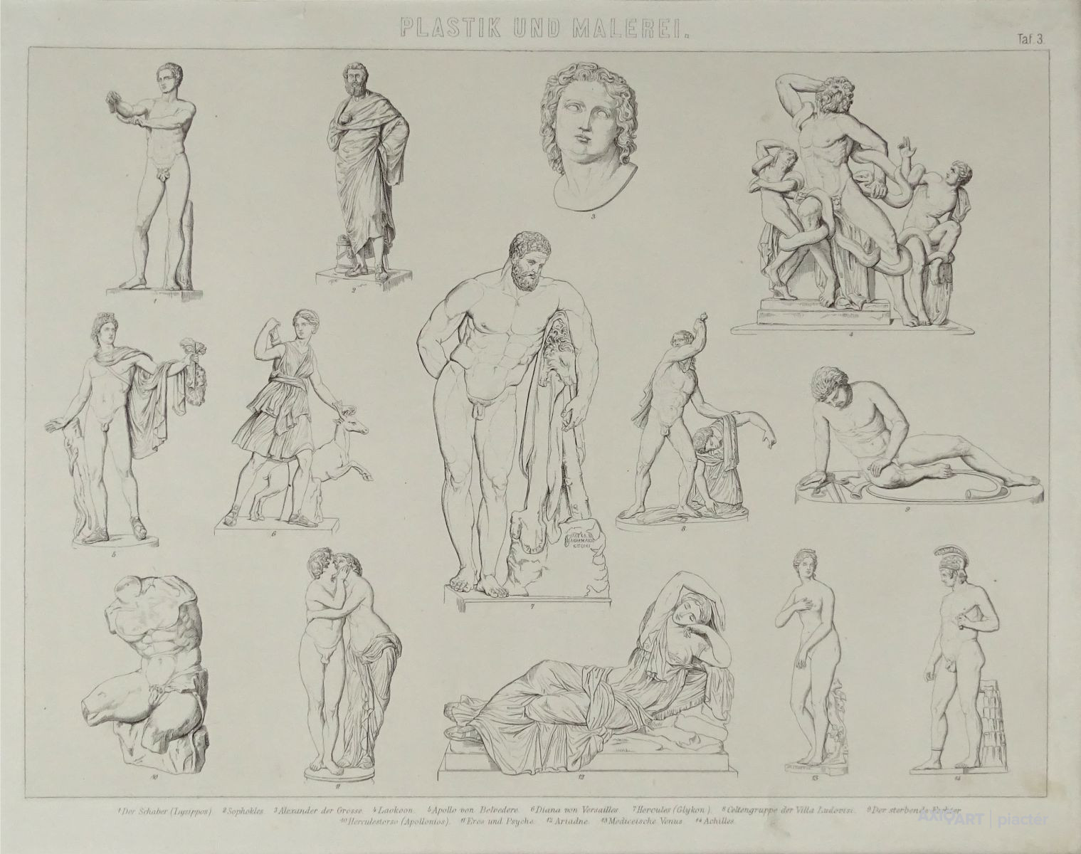 [1A765/W048] Keret nélkül, paszpartuban található német könyvmelléklet, eredeti nyomat. Feliratok: PLASTIK UND MALEREI TAF.3. 1. DER SCHABER (LYSIPPOS) 2. SOPHOKLES 3. ALEXANDER DER GROSSE 4. LAOKOON 5. APOLLO VON BELVEDERE 6. DIANA VON VERSAILLES 7. HERCULES (GLYKON) 8. CELTENGRUPPE DER VILLA LUDOVISI 9. DER STERBENDE FECHTER 10. HERCULESTORSO (APOLLONIOS) 11. EROS UND PSYCHE 12. ARIADNE 13. MEDICEISCHE VENUS 14. ACHILLES DRUCK UND VERLAG VON F.A. BROCKHAUS IN LEIPZIG Magasság: 37 cm Szélesség: 44 cm Súly: 0.245 kg