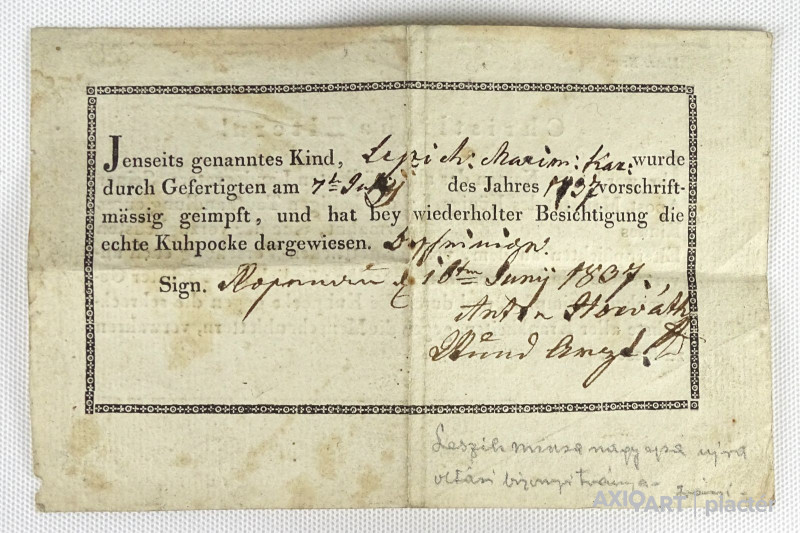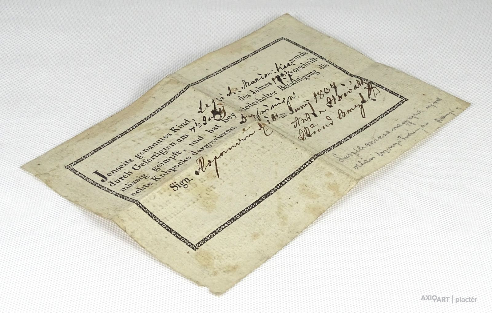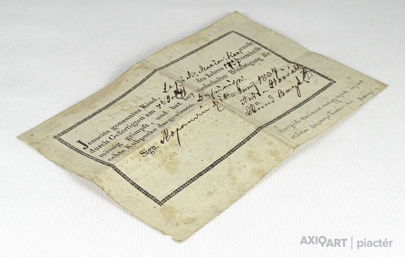 [1K051/X024/6] Antik, német nyelvű oltási igazolás. 1897-ben állították ki Hováth Antal azaz Anton Horváth nevére. Felirat: JENSEITS GENSANNTES KIND ... WURDE DURCH GEFERTINGEN AM ... DES JAHRES 1897 VORSCHRIFTMÄSSIG GEIMPFT. UND HAT BEY WIEDERHOLTER BESICHTIGUNG DIE ECHTE KUHPOCKE DARGEWIESEN. SIGN ... 1837 ANTON HORVÁTH CHRISTLICHE ELTERN! IHR WERET IM NAMEN DES ALLERGNÄDIGSTEN LANDESVATERS, SEINER APOST. MAJESTÄT DES KÖNIGS, BEY DER HEILINGEN TAUFHANDLUNG EURES KINDES MAXIMILIAN KÁROLY ERMAHNT, EINE DER VORZÜGLICHSTEN ELTERNPFLICHTEN AN DEM, VON DER GÖTTLICHEN VORSEHUNG EUCH ANVERTRAUTEN KINDE ZU ERFÜLLEN : DASSELBE NÄMLICH BEY NÄCHSTER GELEGENHEIT EINIMPFEN, UND DURCH DIE KUHPOCKE GEGEN DIE SCHRECKLICHSTE ALLER KRANKHEITEN, GEGEN DIE MENSCHENBLATTERN, VERWAHREN ZU LASSEN. Szélesség: 13.7 cm Hosszúság: 21.3 cm Súly: 0.005 kg Védőoltás története:  Louis Pasteur a mikrobiológia, az immunológia és a járványtan megalapítója A fekete himlő elleni immunizálással már az i. e. 2. század elején kísérleteztek Indiában vagy Kínában. Az orvosok enyhe tünetekkel jelentkező betegeket kerestek, hólyagokat szedtek róluk, kiszárították, elmorzsolták, és ezt kellett az immunizálni kívánt személynek felszippantania az orrába. 1718-ban Mary Wortley Montagu arról tudósított, hogy a törökök ehhez hasonlóan könnyű lefolyású betegek váladékaival érintkeztek, hogy immunisak legyenek a himlőre. Maga is ugyanezt a módszert alkalmazta gyerekeinél. Az 1770-es évektől Sevel, Jensen, Jesty (1774), Rendall, Plett (1791) és társaik megfigyelték, hogy a fejőasszonyok immunissá váltak a fekete himlőre, miután átestek a tehénhimlőn. Kísérletileg ők is beoltották a családjukat és a barátaikat. Edward Jenner mellszobra Az 1796-os járvány alatt hasonló megfigyelést tett Edward Jenner angol sebészorvos is. Ő volt az első, aki a védőoltások kifejlesztésének terén megtette az első lépéseket. A tehénhimlős Sarah Nelmes fejőnő sebváladékát a nyolcéves és egészséges James Phipps karján ejtett sebbe dörzsölte. Phipps átesett a tehénhimlőn, meggyógyult, majd a fekete himlővel szennyezett anyaggal szemben immunisnak bizonyult. Később megismételte a kísérletet más gyermekkel is, köztük a saját fiával és arra a következtetésre jutott, hogy az oltás kockázat nélkül immunitást biztosít a fekete himlő ellen. Jenner volt az első, aki dokumentálta és a tudományos közvélemény elé tárta a vakcinálása eredményeit. Az 1793-as philadelphiai sárgalázjárvány után, 1799-ben megnyílt a Philadelphia Lazaretto Quarantine Station. Minden, a városba érkező hajónak dokkolnia kellett itt, és alávetni magukat egy részletes ellenőrzésnek. A fertőzött utazókat karanténba zárták. Ez az állomás volt a világtörténelem első, modern értelemben vett karanténja. Benjamin Waterhouse, a Harvard Egyetem orvostani előadója 1800-ban levelet írt Thomas Jefferson akkori alelnöknek, melyben a tehénhimlő leküzdése elleni erőfeszítések szükségességére szerette volna felhívni a figyelmet. Jefferson lelkesen fogadta a kezdeményezést. Waterhouse a levél eredetijét később Edward Jennernek ajándékozta. 1820-ban a fekete himlő által okozott elhalálozások az előző évtizedéhez képest megfeleződött: 18 447-ről 7858-ra. 1855-ben Massachussets lett az első amerikai állam, amelyik kötelezővé tette a védőoltásokat. Poroszországban 1874-ben lett kötelező a fekete himlő elleni védőoltás. A törvény bevezetése után, 1886-ban a 100 000 főre jutó halálozási ráta 1,94-re csökkent. Ausztriában, ahol az oltási rend lazább volt, ez az arány nagyobb volt, 39,28 és 94,79. A 20. században további védőoltásokat fejlesztettek, többek között a diftéria, a kanyaró, a mumpsz és a rubeola ellen. A fejlesztések jelentős részét Maurice Hilleman vezette.  Forrás: wikipédia