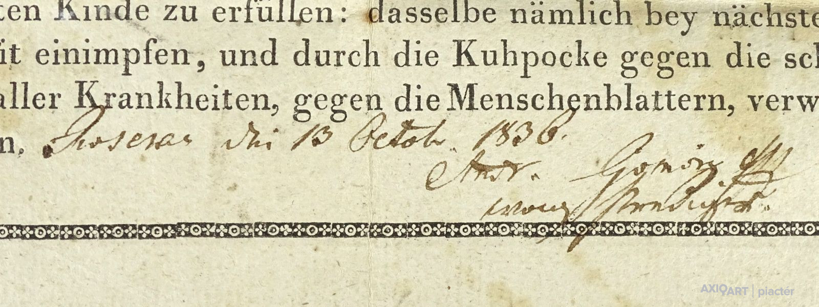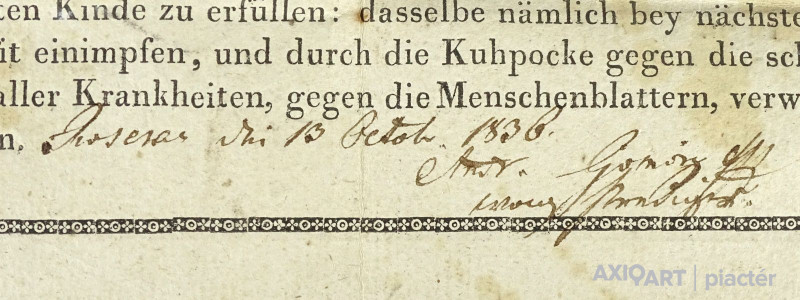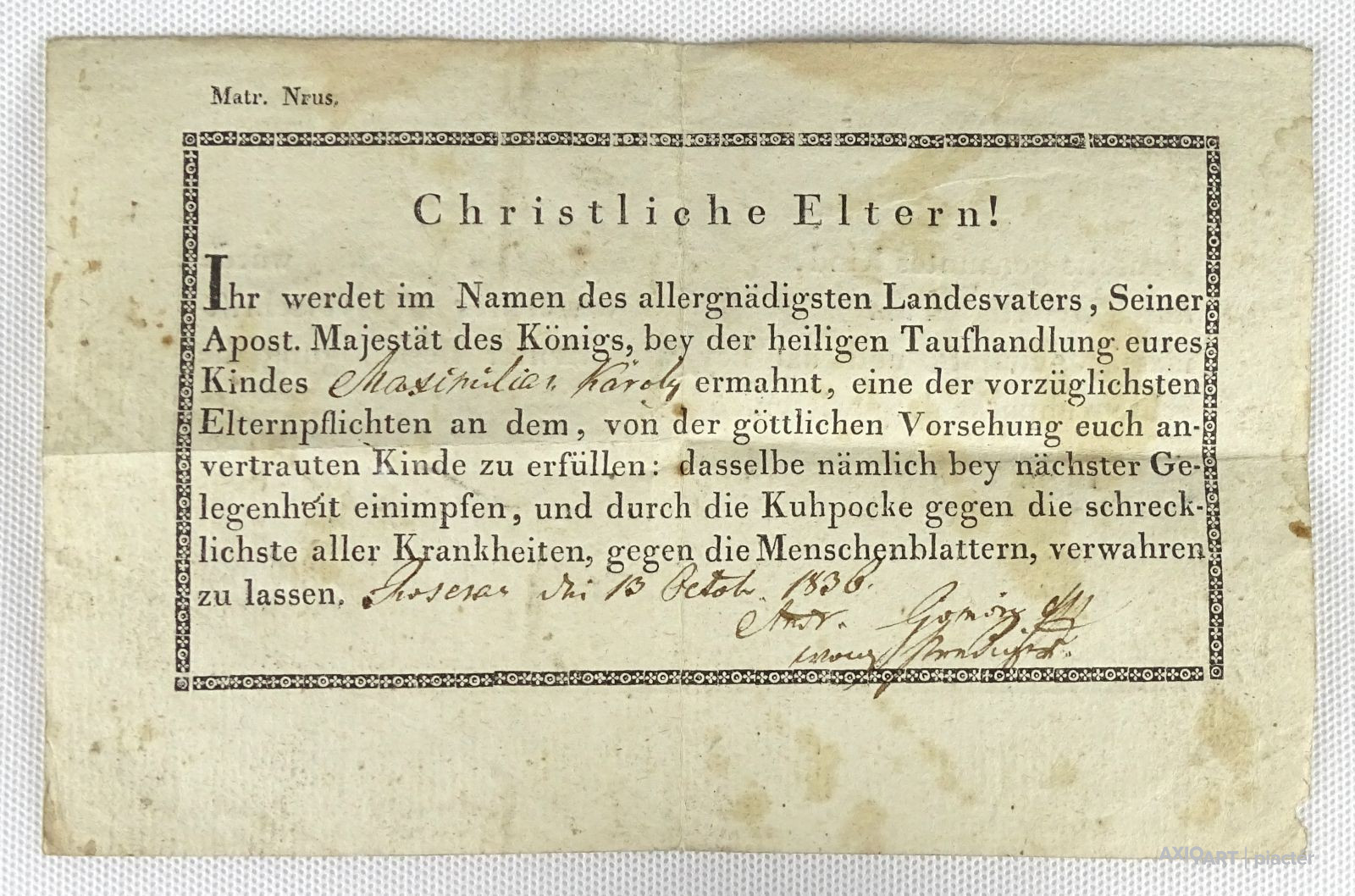 IHR WERET IM NAMEN DES ALLERGNÄDIGSTEN LANDESVATERS, SEINER APOST. MAJESTÄT DES KÖNIGS, BEY DER HEILINGEN TAUFHANDLUNG EURES KINDES MAXIMILIAN KÁROLY ERMAHNT, EINE DER VORZÜGLICHSTEN ELTERNPFLICHTEN AN DEM, VON DER GÖTTLICHEN VORSEHUNG EUCH ANVERTRAUTEN KINDE ZU ERFÜLLEN : DASSELBE NÄMLICH BEY NÄCHSTER GELEGENHEIT EINIMPFEN, UND DURCH DIE KUHPOCKE GEGEN DIE SCHRECKLICHSTE ALLER KRANKHEITEN, GEGEN DIE MENSCHENBLATTERN, VERWAHREN ZU LASSEN.