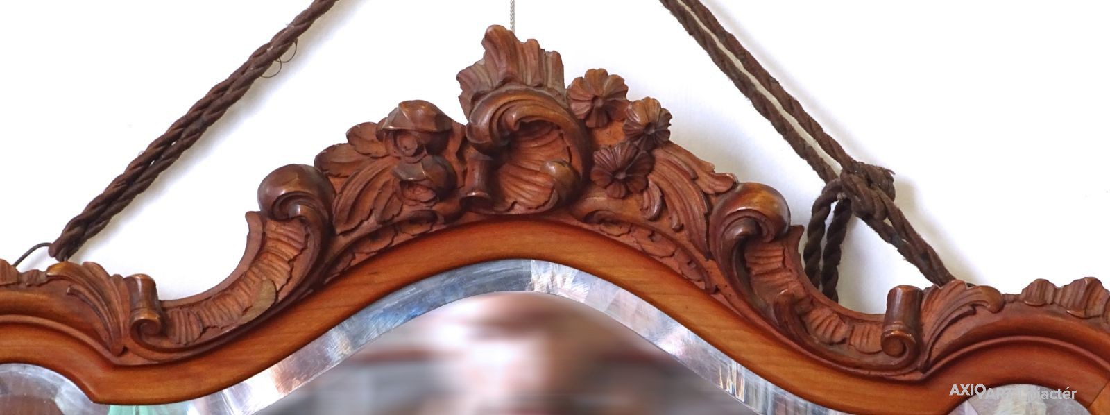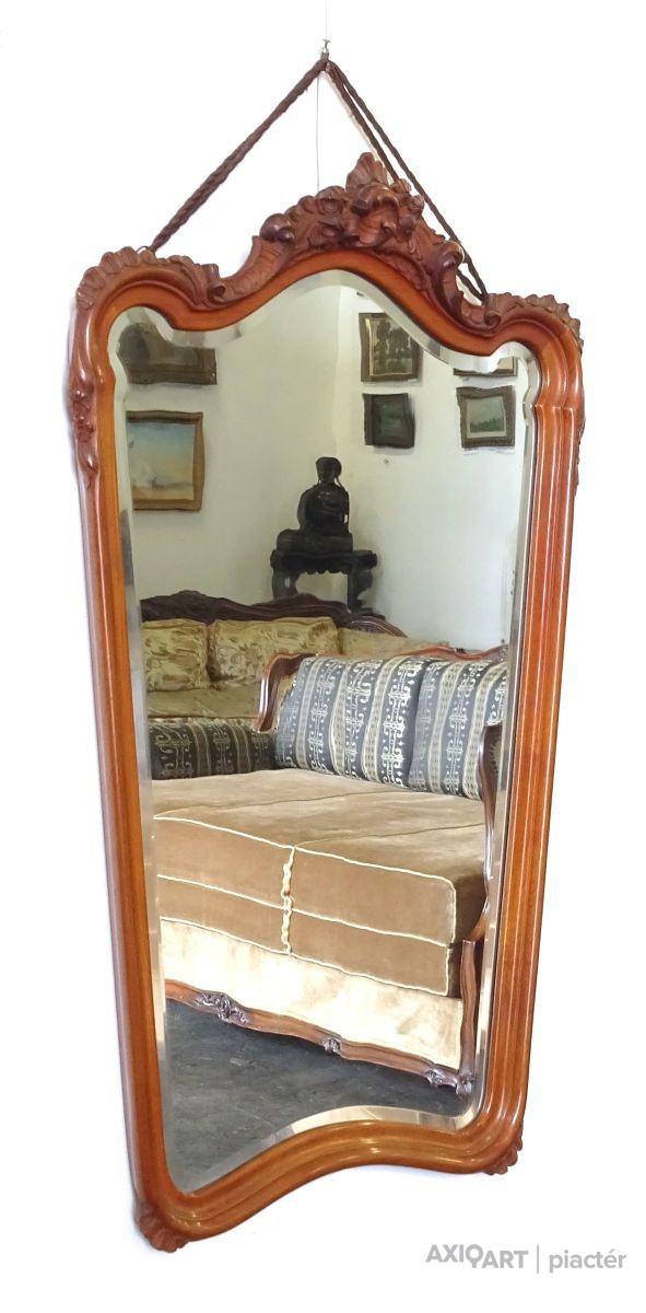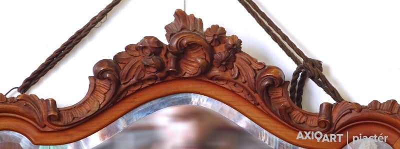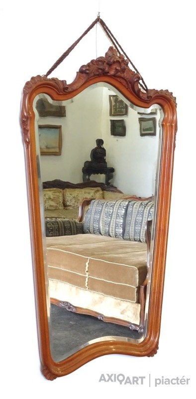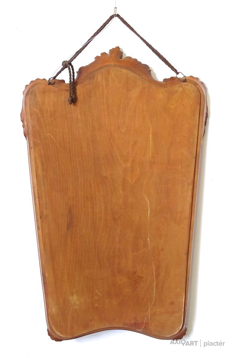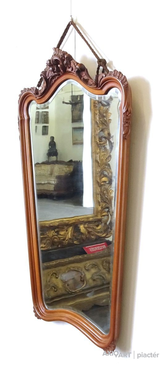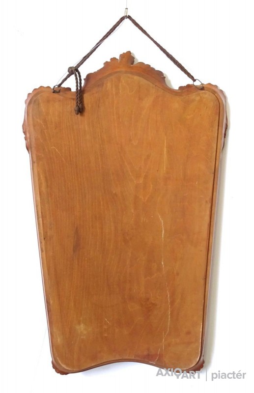 Falra akasztási lehetőséggel rendelkező szép állapotú, faragott díszítéses neobarokk tükör. Benne eredeti, formakövető metszett, fazettázott tükör, vakfolt mentes szép állapotban.