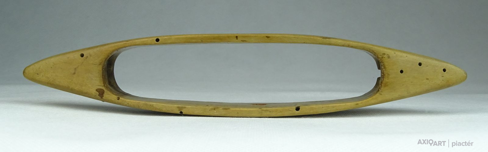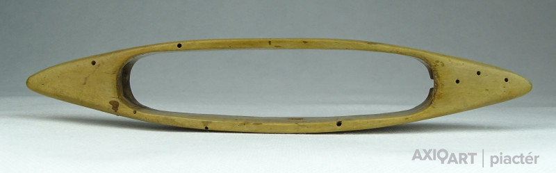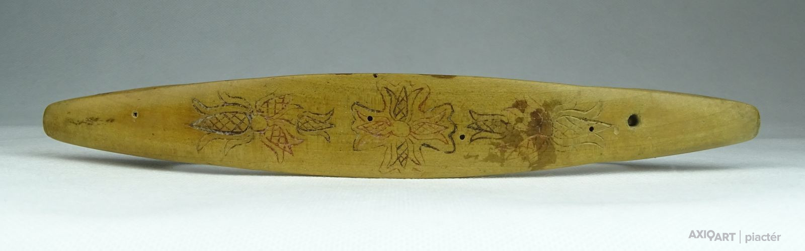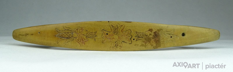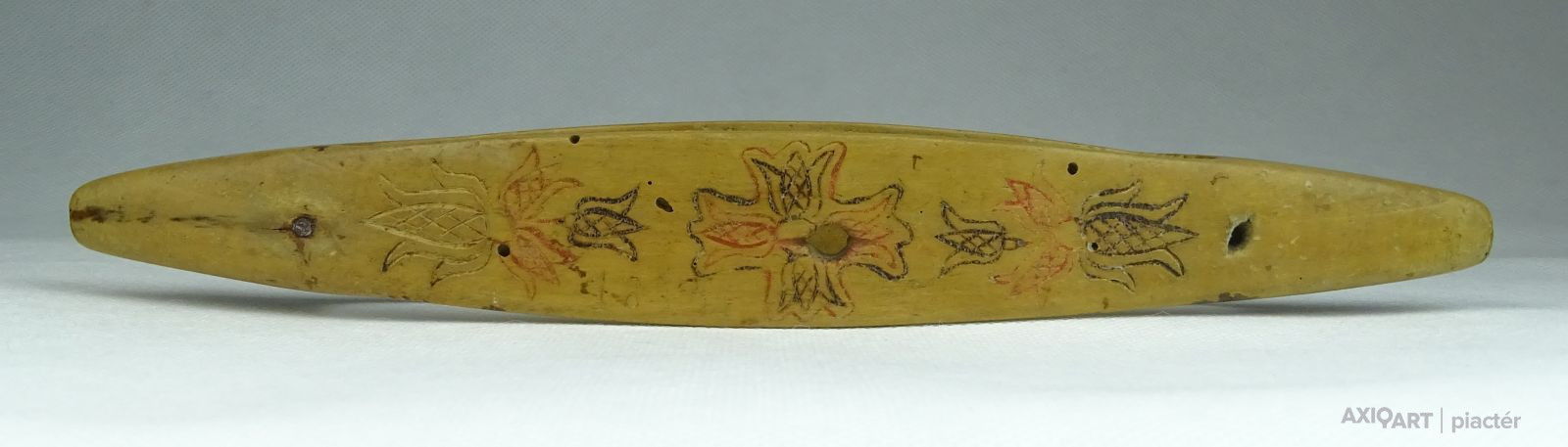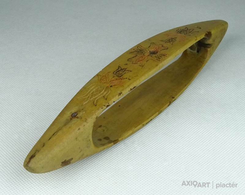 [0T527/UZ-N] Antik, szép állapotú, faragott, vésett és festett felületű kézi vetélő. Halványan karcolt dátum látható: 1853 Szélesség: 3.8 cm Hosszúság: 22 cm Súly: 0.04 kg