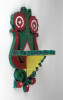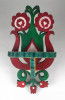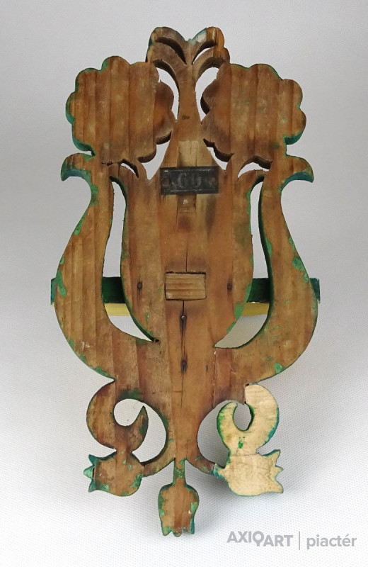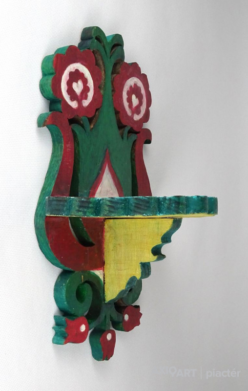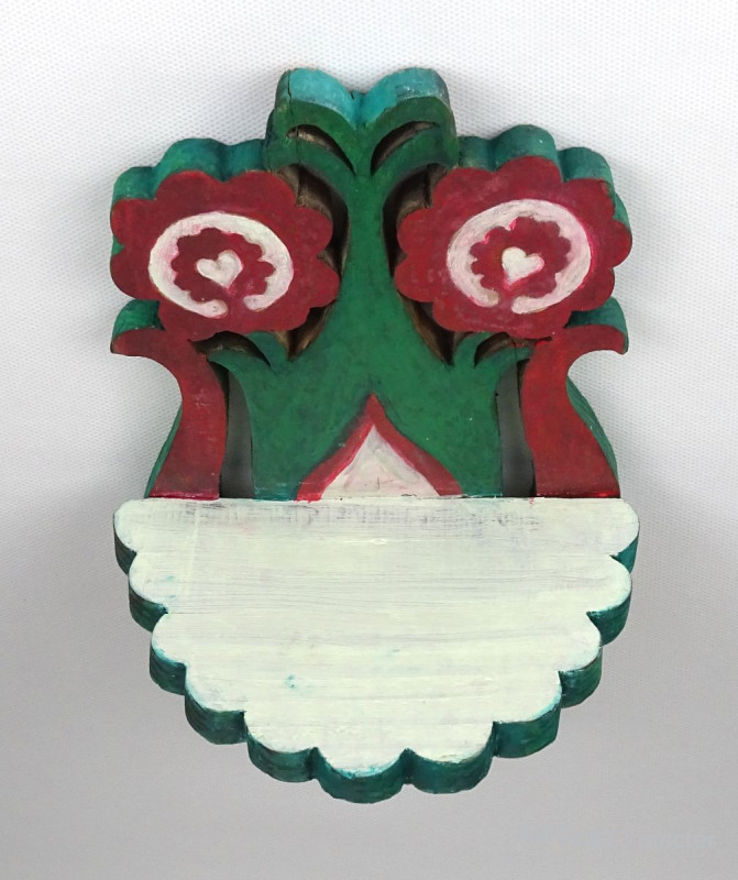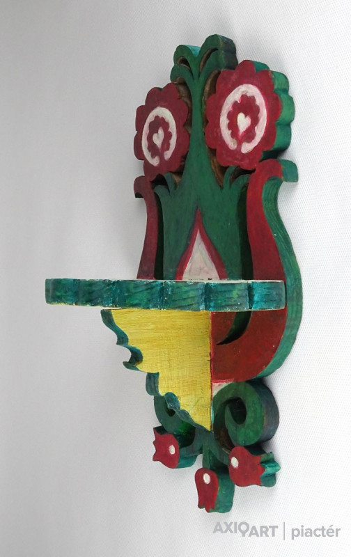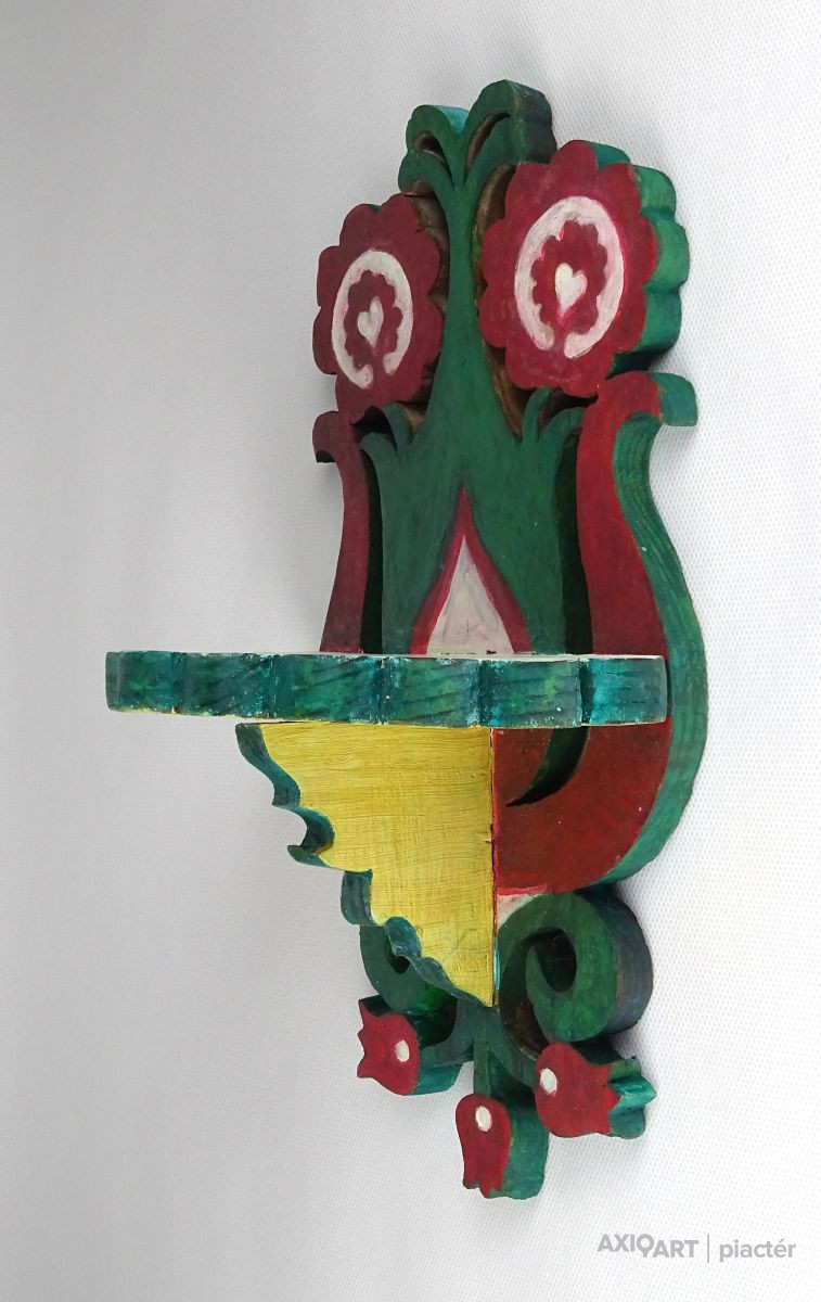 Régi, szép állapotú fa fűrészmunka, trikoloros, tulipános és szívekkel díszített falipolc. Akasztási lehetőséggel rendelkezik. Egyik tulipános dísze pótolt. Újrafestett a felülete.